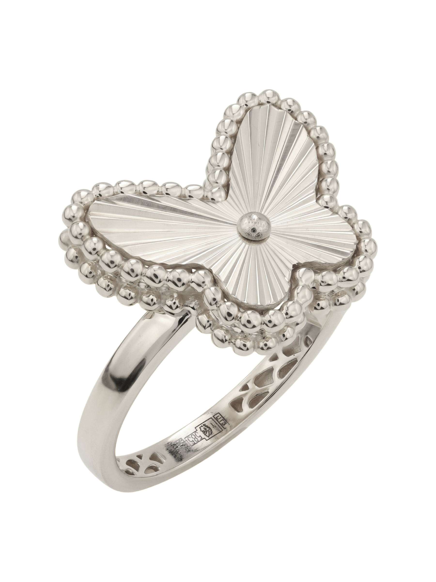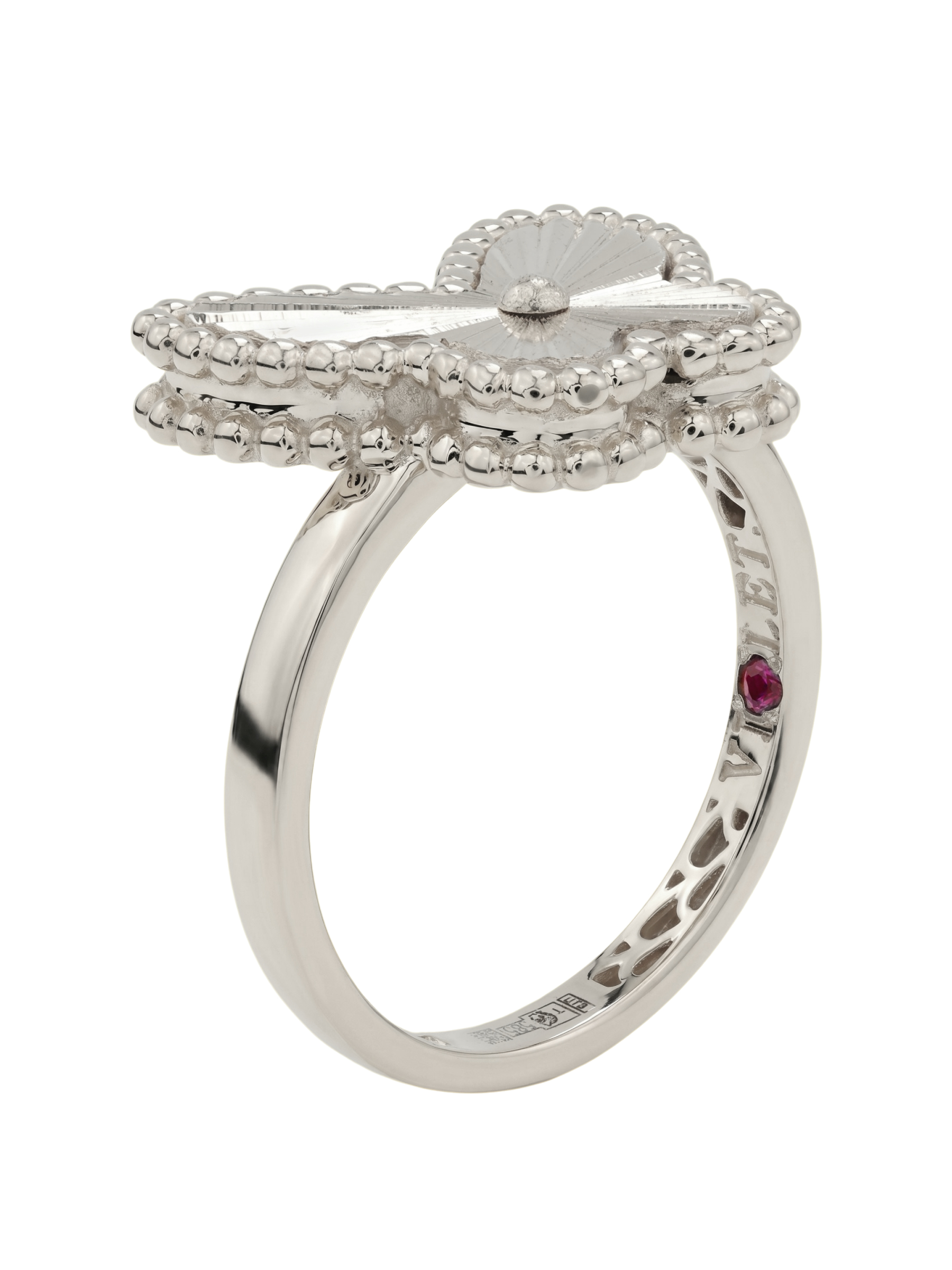 Изысканное кольцо из белого золота 585 пробы станет утонченным дополнением к вашему образу. Данное украшение из коллекции Vioretty — Farfalla привлекает внимание своим оригинальным дизайном в форме бабочки, который символизирует легкость и грацию. Центральным акцентом ювелирного изделия выступает одна вставка — драгоценный рубин круглой формы насыщенного красного цвета, который гармонично дополняет холодный блеск благородного металла.