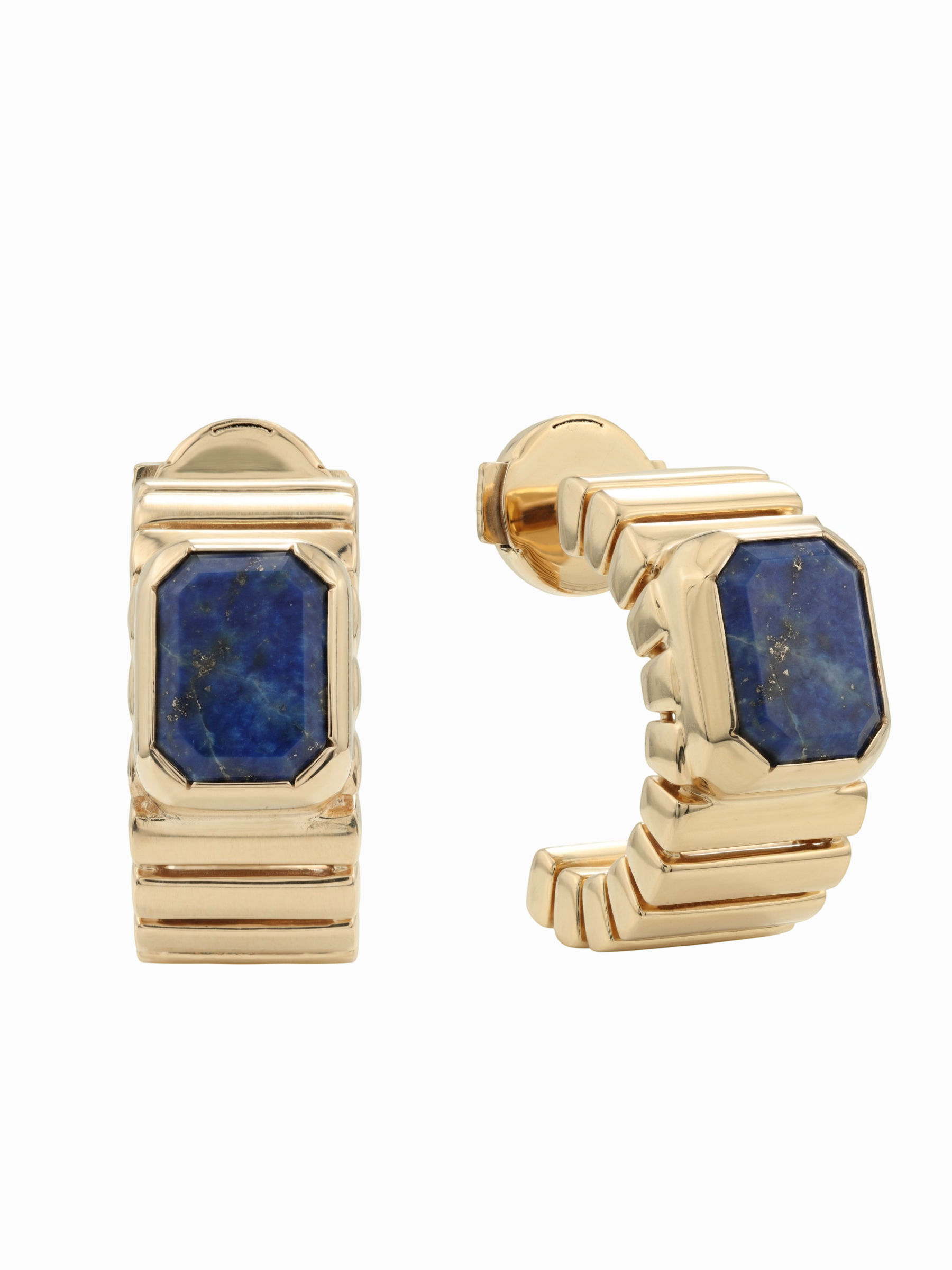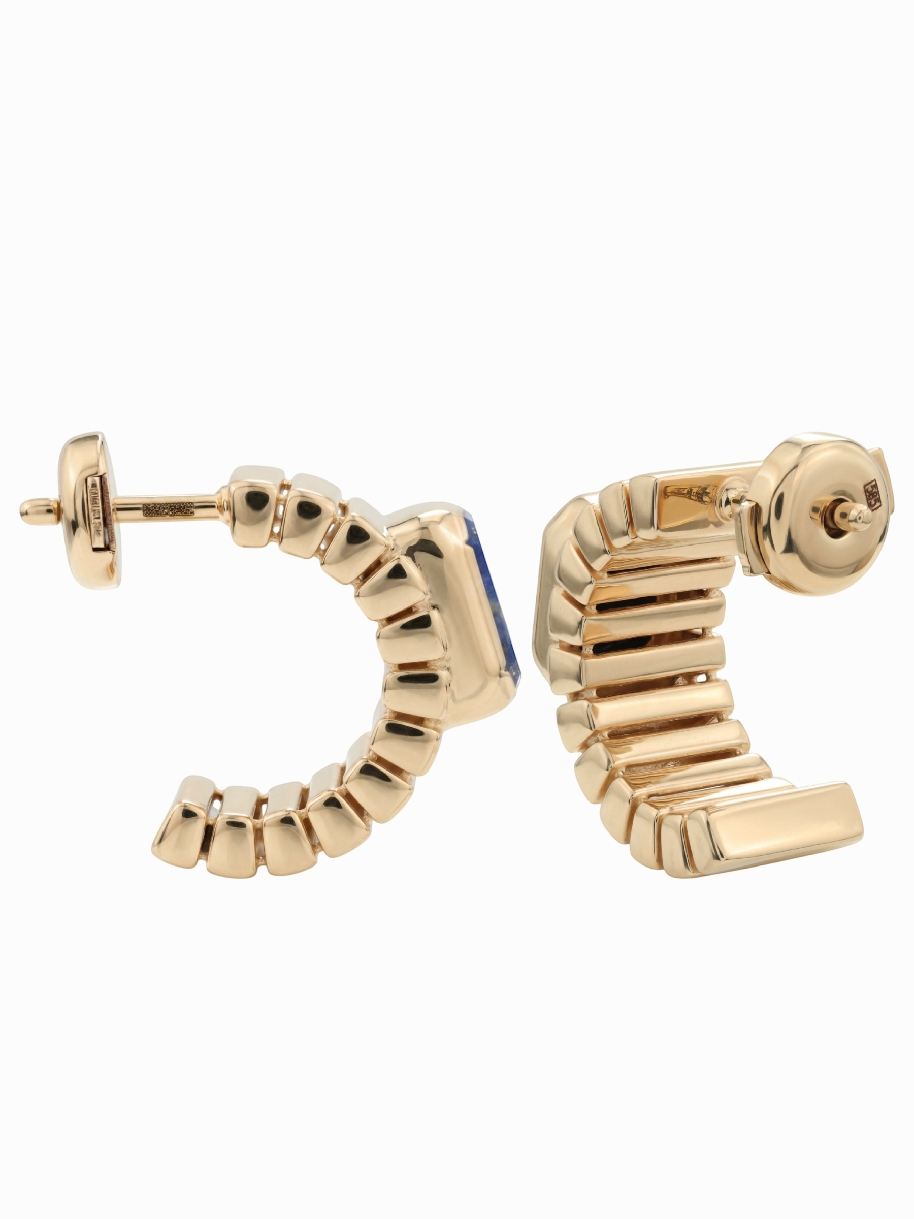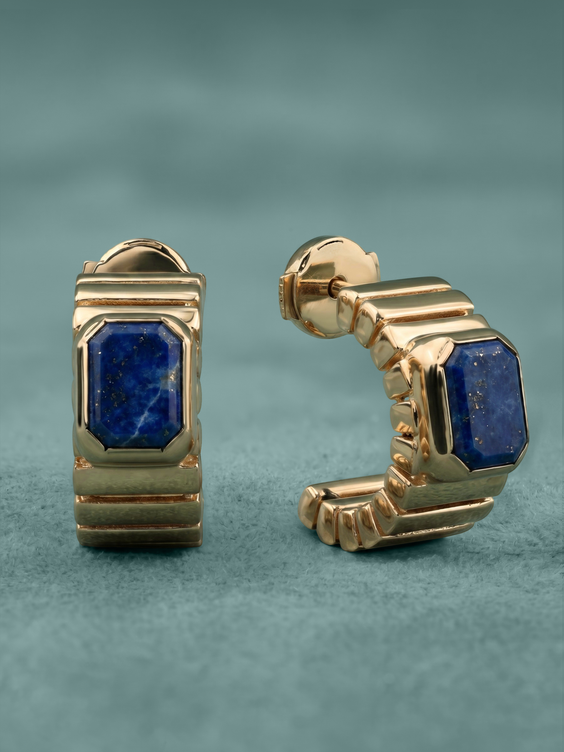 Особое внимание привлекает форма вставок — октагон. Четкие линии и геометрия огранки подчеркивают статусность изделия, создавая гармоничный контраст с теплым блеском красного золота. Глубокий, почти ночной оттенок лазурита идеально сочетается с металлом, делая серьги заметным акцентом в любом образе. Благодаря универсальному дизайну, модель подходит как для женщин, так и для мужчин, предпочитающих качественные и стильные аксессуары с характером.