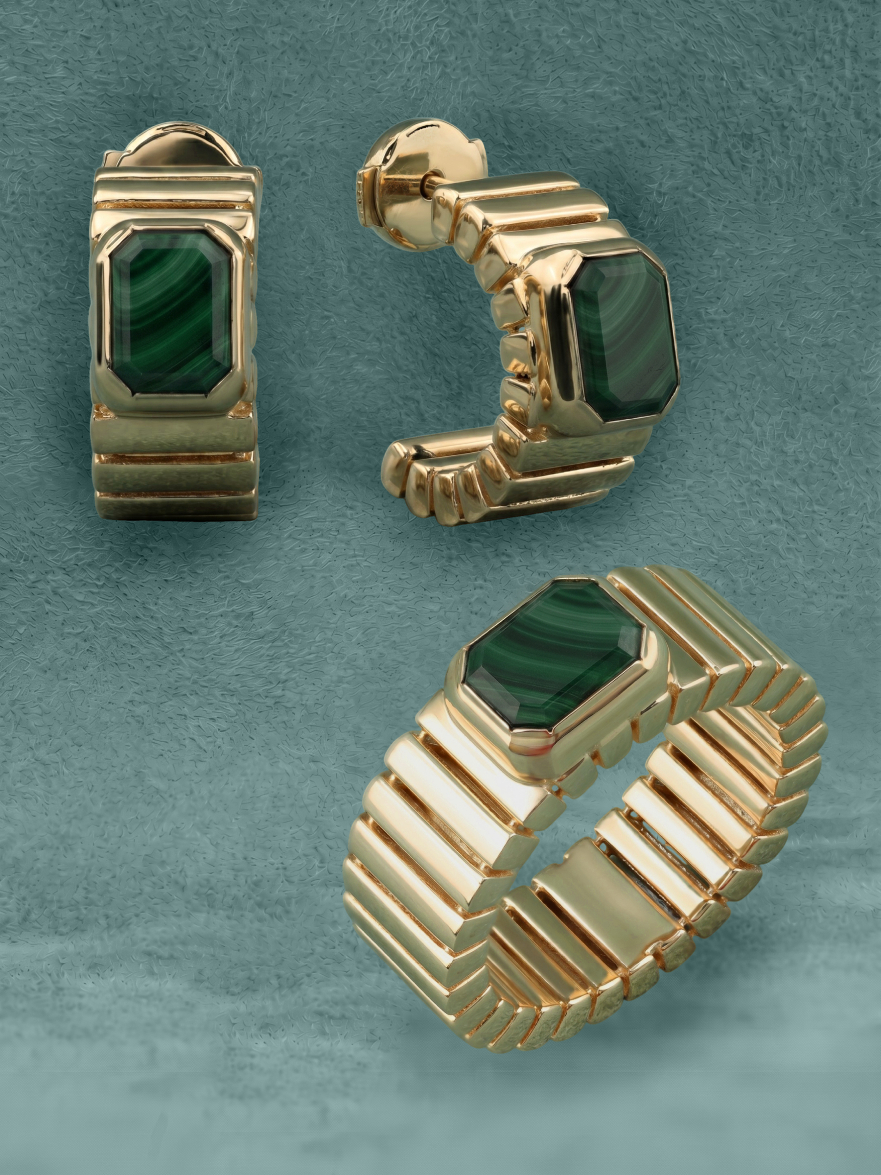 Данное изделие может стать частью комплекта, дополнив ваш образ завершенностью и благородством. Ювелирная работа подчеркивает ценность материала, делая эти серьги из золота с малахитом желанным приобретением или изысканным подарком для ценителей ювелирного искусства.
