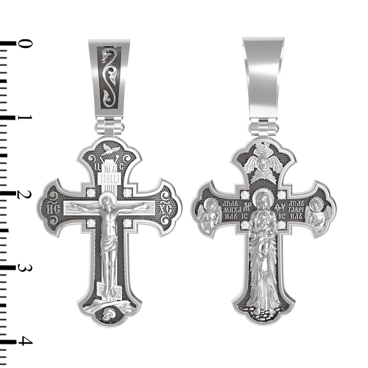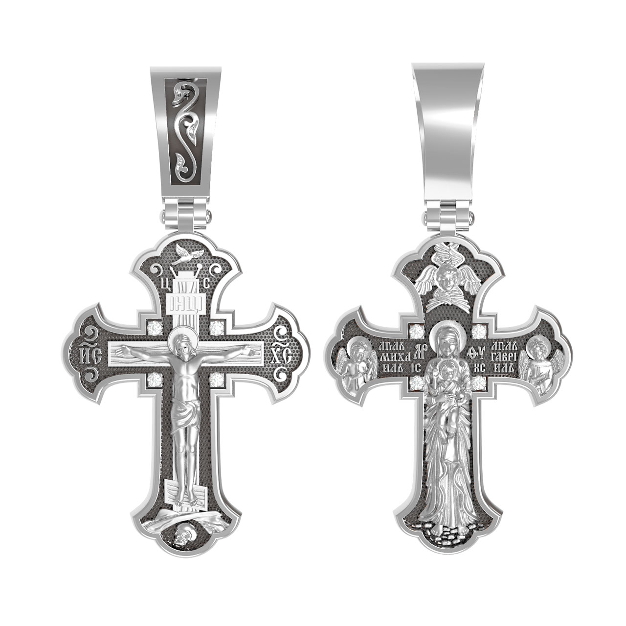 На лицевой стороне этого креста центральную часть занимает икона Распятия Христа — образ жертвы, принесенной Господом за грехи людей. Именно ко Христу, сошедшему на землю ради нашего спасения, возносятся все молитвы. Пресвятая Богородица, ангелы и святые — помощники Господа в деле спасения и заступники за людей перед Богом. «Оружием великим Христовым» именует Церковь крест, потому что, претерпев страдания и умерев, Господь победил смерть и лишил дьявола его власти над миром. Поэтому рядом с титлами Святого имени Христа написано «НИКА», что значит «победитель».
