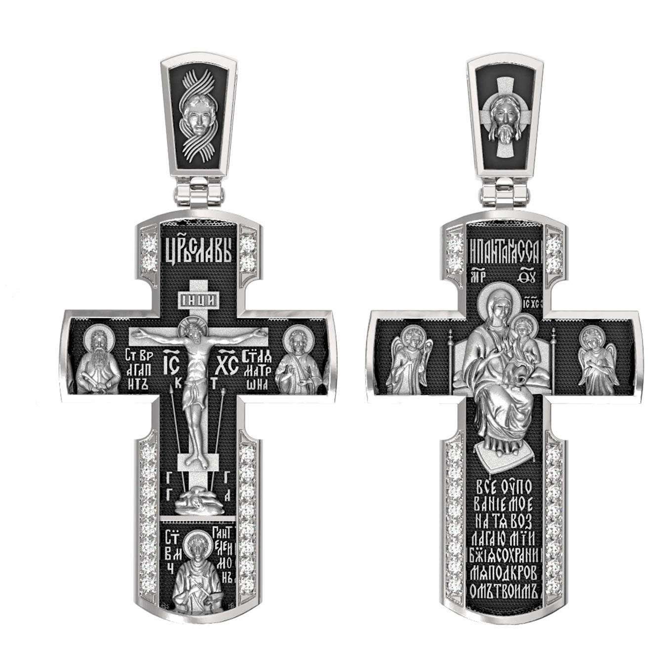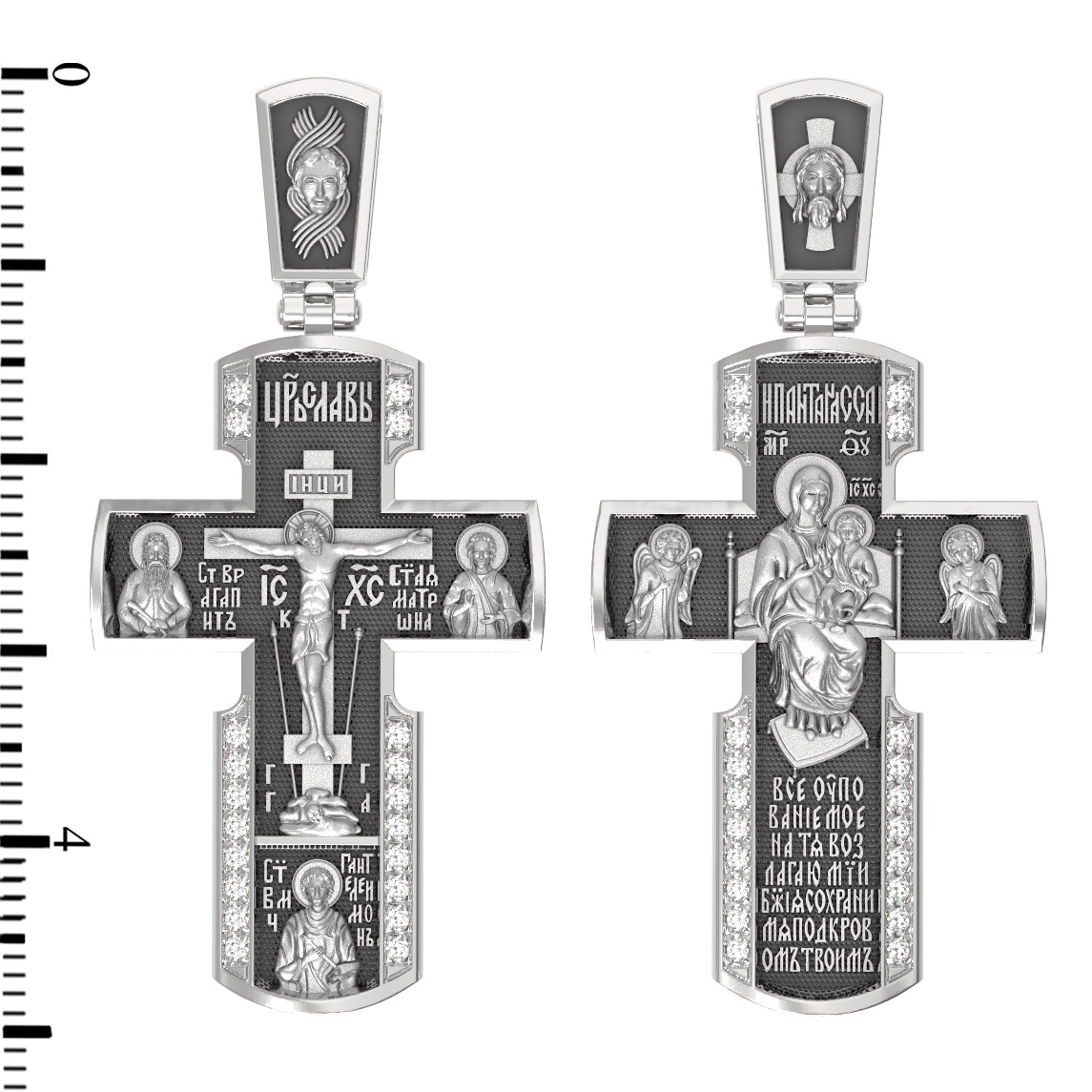 Внизу креста написана молитва обращенная к Божией Матери «Все упование мое на Тя возлагаю, Мати Божия, сохрани мя под кровом Твоим».