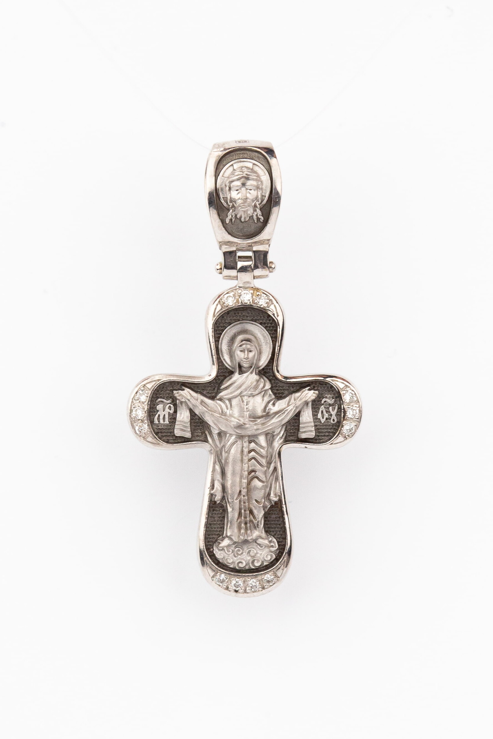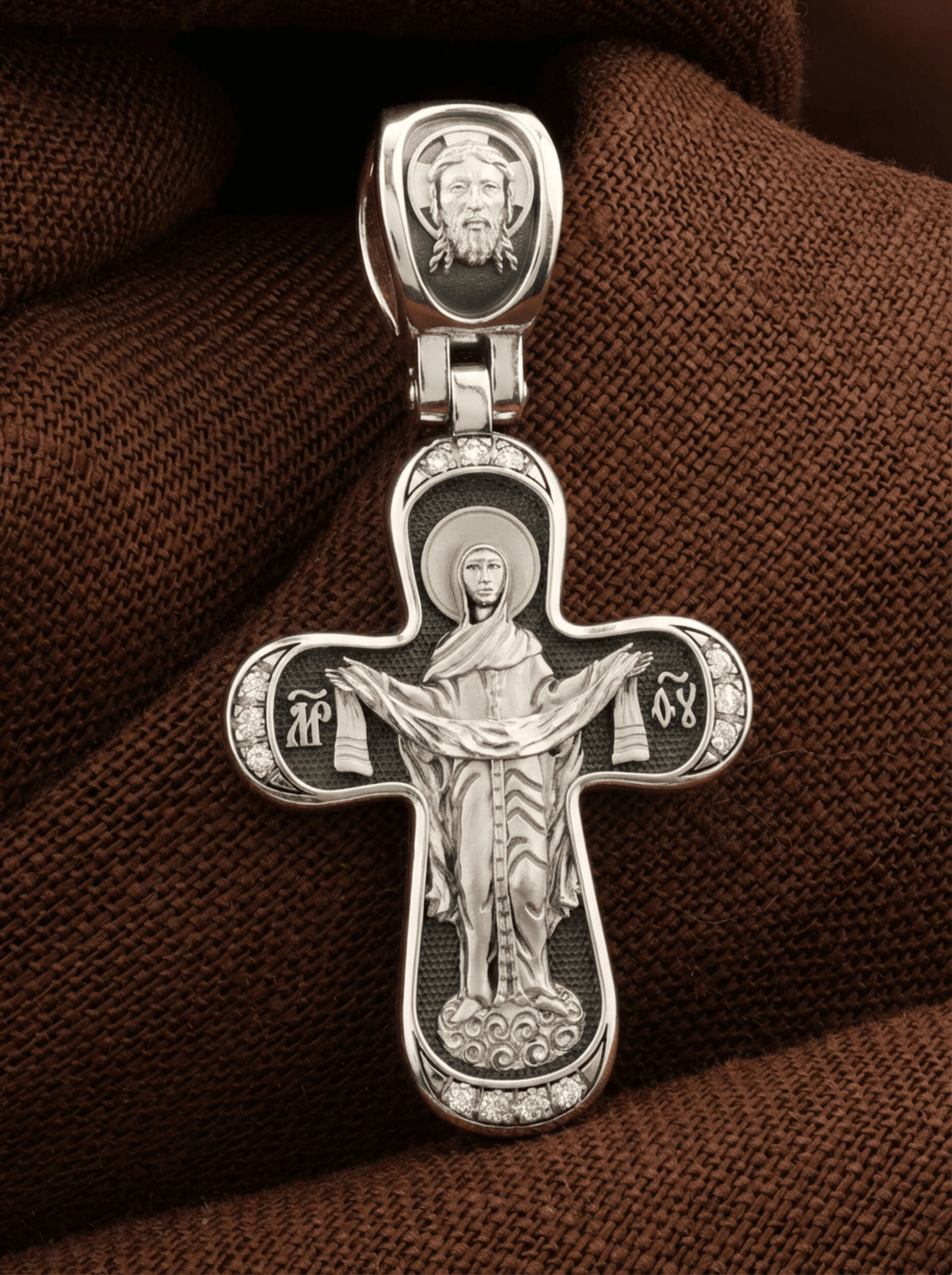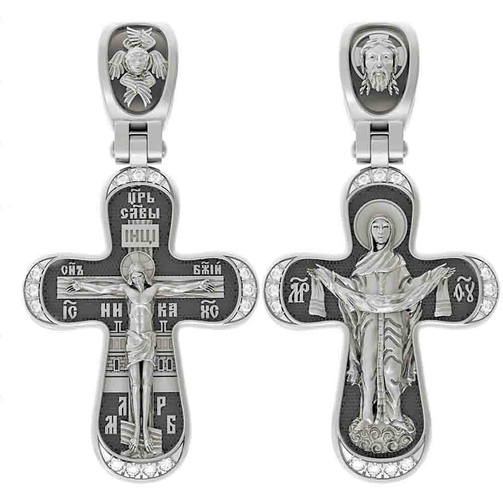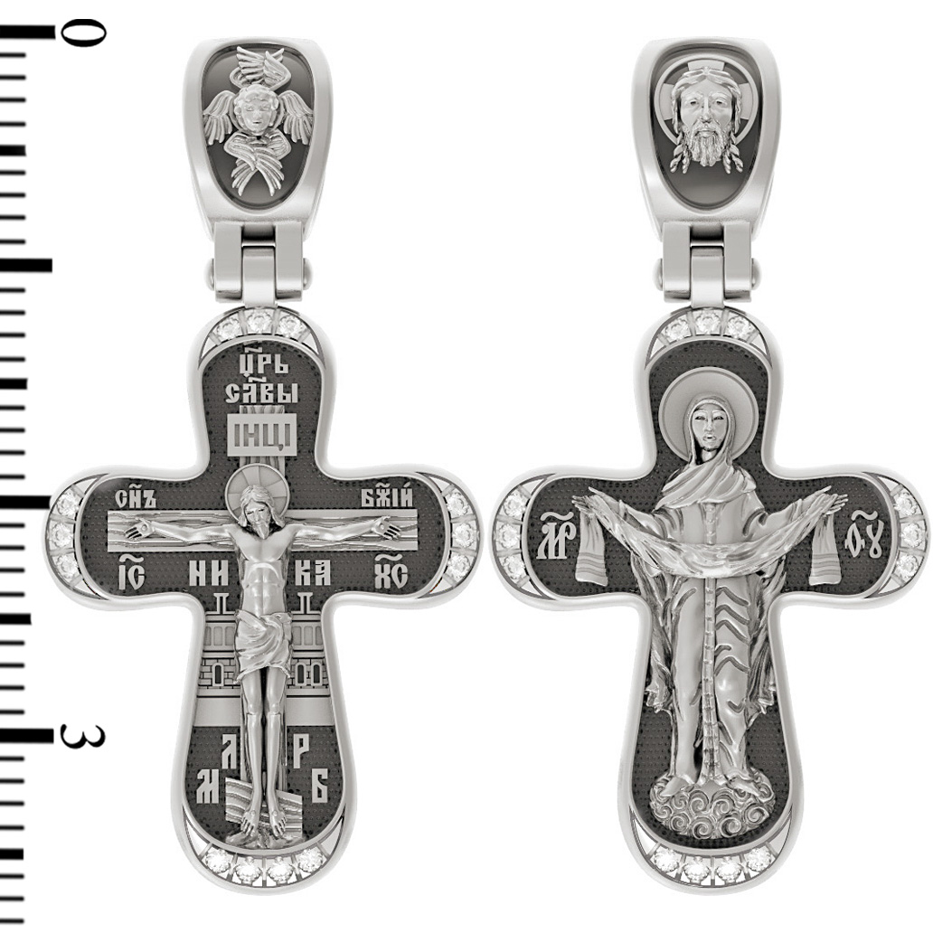 На обороте креста изображена икона Покрова Пресвятой Богородицы. Праздник Покрова Божией Матери является воспоминанием чуда, которое произошло во Влахнернской церкви 1 (14) октября 910 года: Пресвятая Богородица явилась верующим над алтарем храма и распростерла над ними Свое покрывало. В этот день Божья Матерь открыла людям, что Она является Ходатаицей за них перед Богом. Богородица простирает Свой молитвенный покров над всеми православными христианами и умоляет Сына Своего о даровании вечного спасения каждому человеку. На кулонном кольце помещено изображение Спаса Нерукотворного — образ Спасителя, который Он запечатлел на плате и передал для исцеления больному проказой царю Эдессы. Ему придается победное и защитное значение.