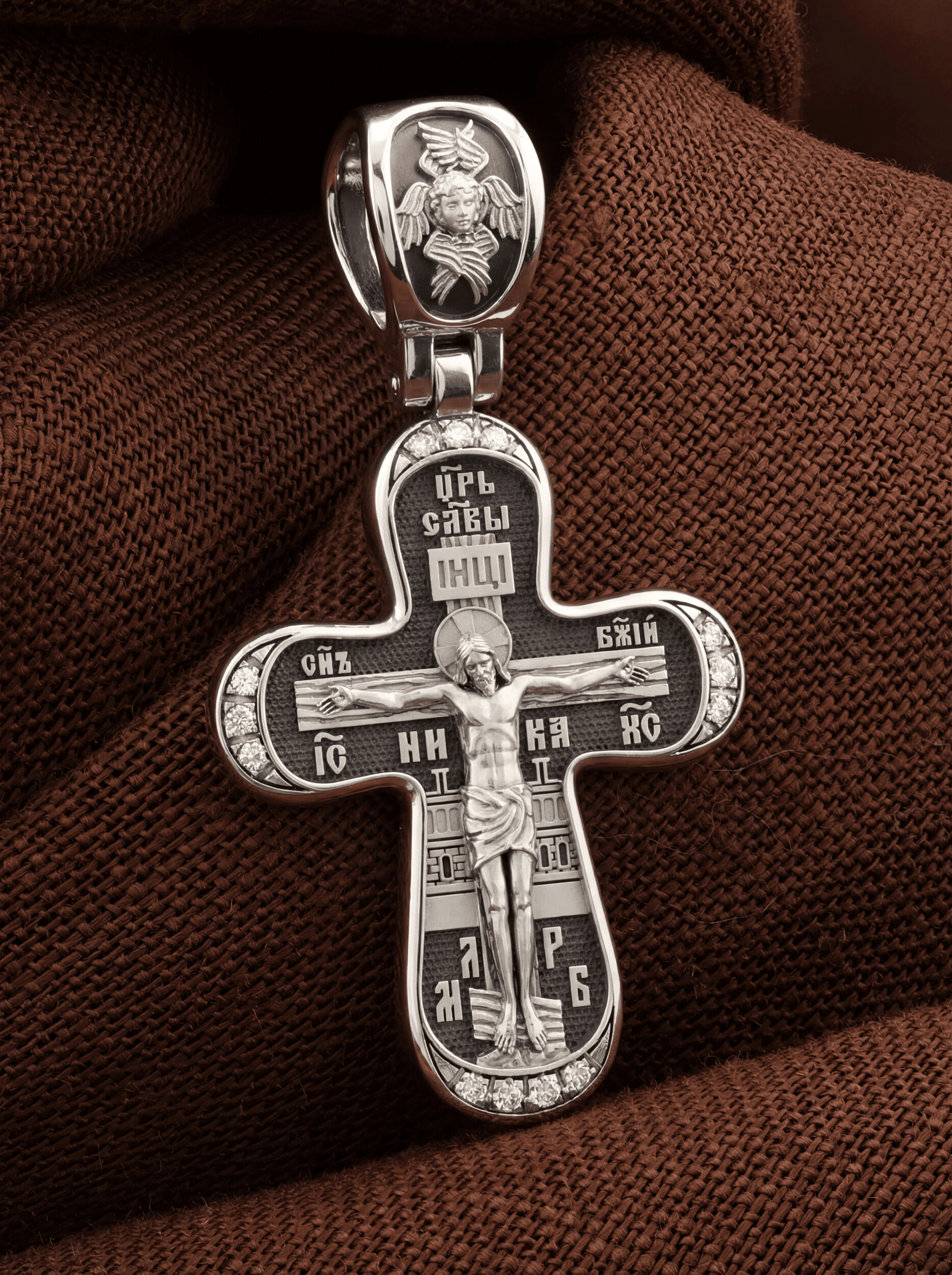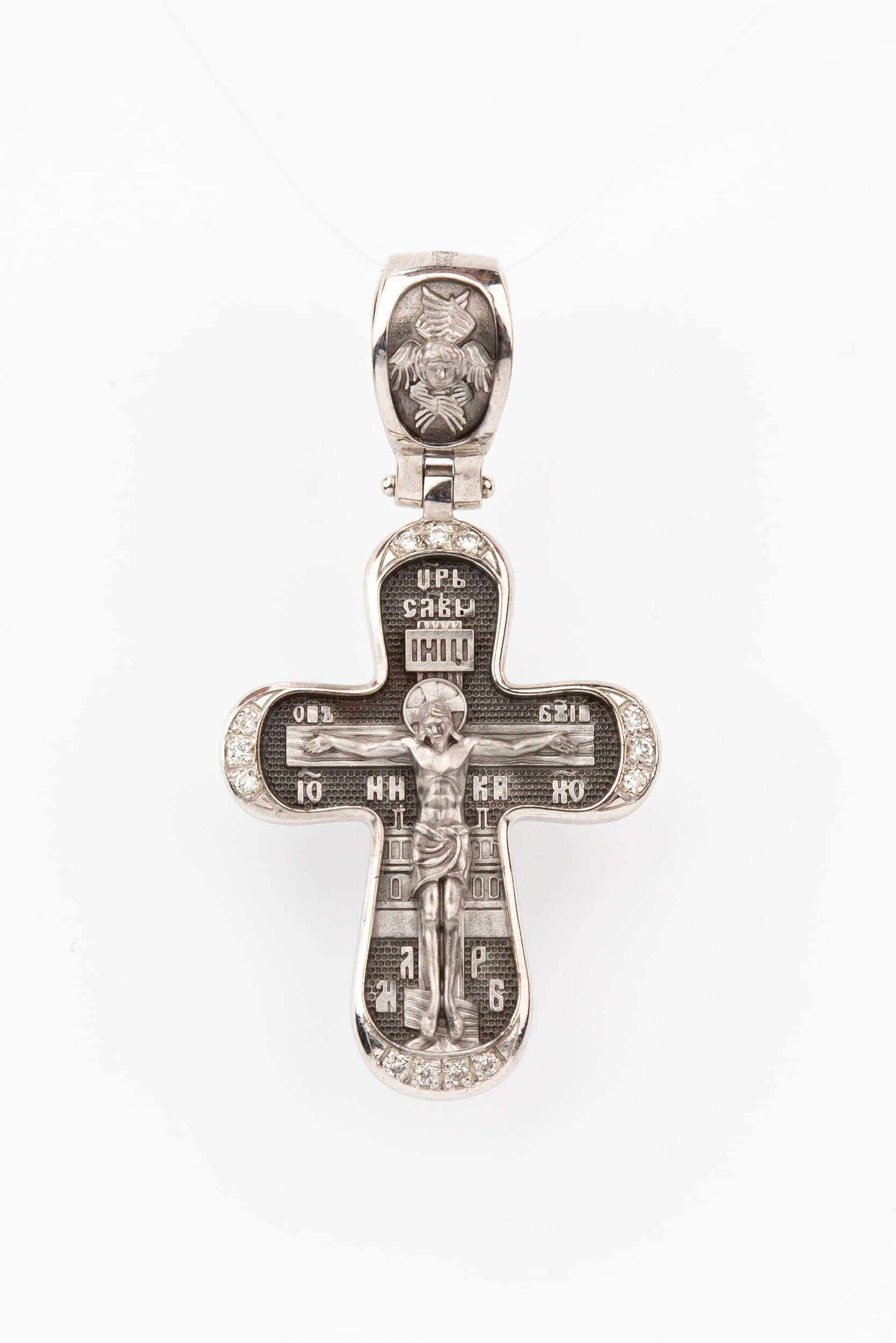 На лицевой стороне креста изображено Распятие Иисуса Христа. Господь представлен свободно покоящимся на кресте с простертыми руками и как бы обнимающим всю Вселенную. Он — Спаситель, искупивший грехи мира, «поправший смертию смерть» и призывающий к Себе «все концы земли». Поэтому рядом с Его образом помещены слова «Царь Славы». Эти слова характеризуют Господа как Великого Архиерея, победителя смерти. Верхняя перекладина символизирует титло — табличку, на которой, согласно Евангелию, было начертано: Иисус Назорей Царь Иудейский (IНЦI). Также Распятие сопровождается надписями, олицетворяющими Христа. Это святое имя Христа «IC» (Иисус) «ХС» (Христос), и словосочетание «Сын Божий». Крест стоит на горе камней, символизирующих Голгофу, в основании которой различается череп. Это голова Адама. На кулонном кольце помещено изображение серафима.