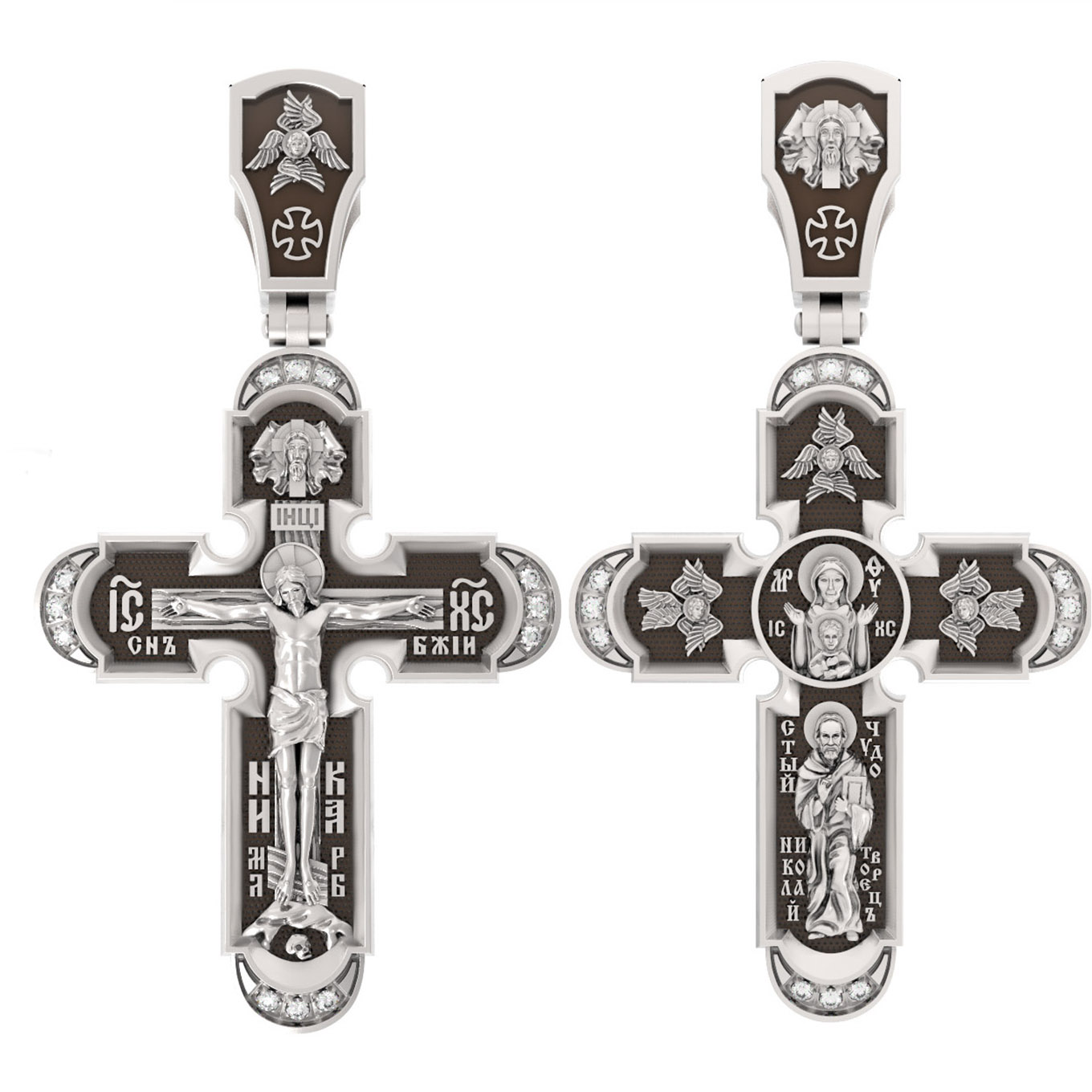 На лицевой стороне нательного креста по традиции изображено Распятие Господа нашего Иисуса Христа. Крест Господень стоит на небольшом каменистом возвышении, символизирующем гору Голгофу, которая обозначена буквами МЛРБ (Место Лобное Рай Бысть). Над головой Господа на поперечной перекладине написано «ИНЦИ», что символизирует табличку, которая была прибита к Кресту, с надписью «Иисус Назорей Царь Иудейский». Этим иудеи хотели посмеяться над Христом, не зная, что распинают истинного Царя всех царей. По сторонам основной перекладины расположены позолоченные рельефные инициалы Христа «ИС ХС». Под перекладиной, по сторонам древа, находится надпись «СЫН БОЖИЙ», а в основании креста — надпись «НИКА» (Победитель).