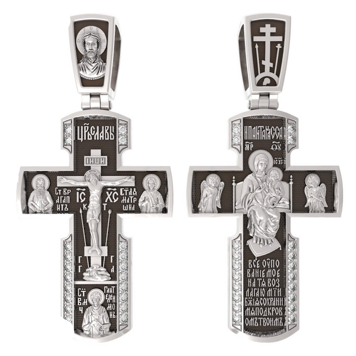 На лицевой стороне креста изображено Распятие Иисуса Христа на Голгофском Кресте, над вершиной которого помещена надпись «Царь Славы». Справа от Распятия помещен образ прославленной святой блаженной Матроны. «Матронушка», — ласково называют эту святую православные за удивительную любовь и помощь, которую она подает всем нуждающимся в ее поддержке. Слева — икона прп. Агапита. Этот святой жил в пещерах Киево-Печерского монастыря в XI веке и бескорыстно врачевал мирян и монахов.