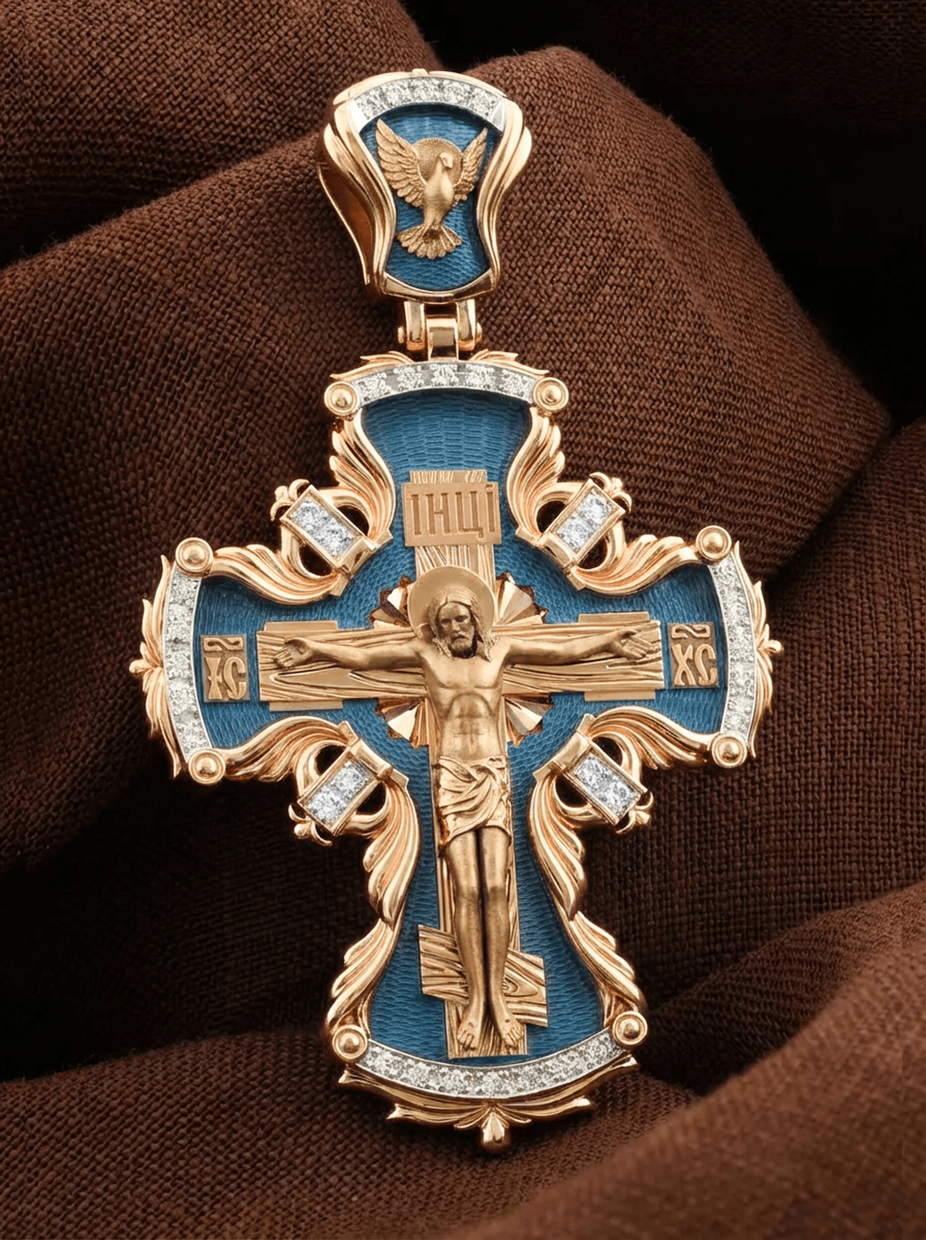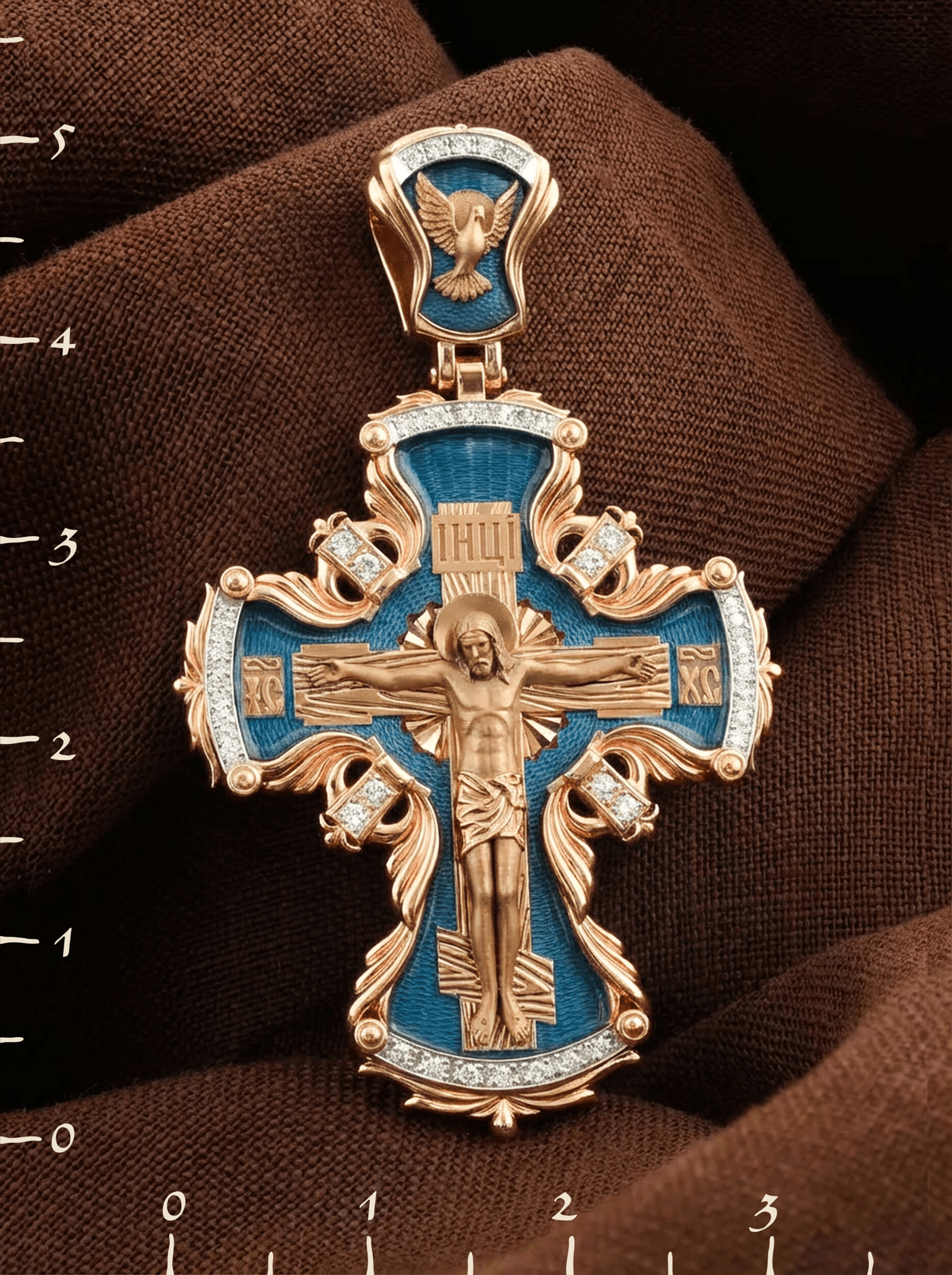 На лицевой стороне креста изображено Распятие Господа и Спасителя нашего Иисуса Христа, отдавшего Себя на смерть, чтобы другие могли жить — жить вечной жизнью, жить с Богом. Своею кровью Господь освятил крест и сделал его проводником Своей благодати, источником освящения верующих. На верхней табличке, выше головы Иисуса, расположена надпись, составленная Понтием Пилатом — «ИНЦИ». Она означает «Иисус Назорей, Царь Иудейский». Надпись «IС ХС» означает Иисус Христос помещается на разных сторонах поперечной (большой) перекладины креста. На кулонном кольце помещено изображение Духа Святого в виде голубя, сходящего с Небес.