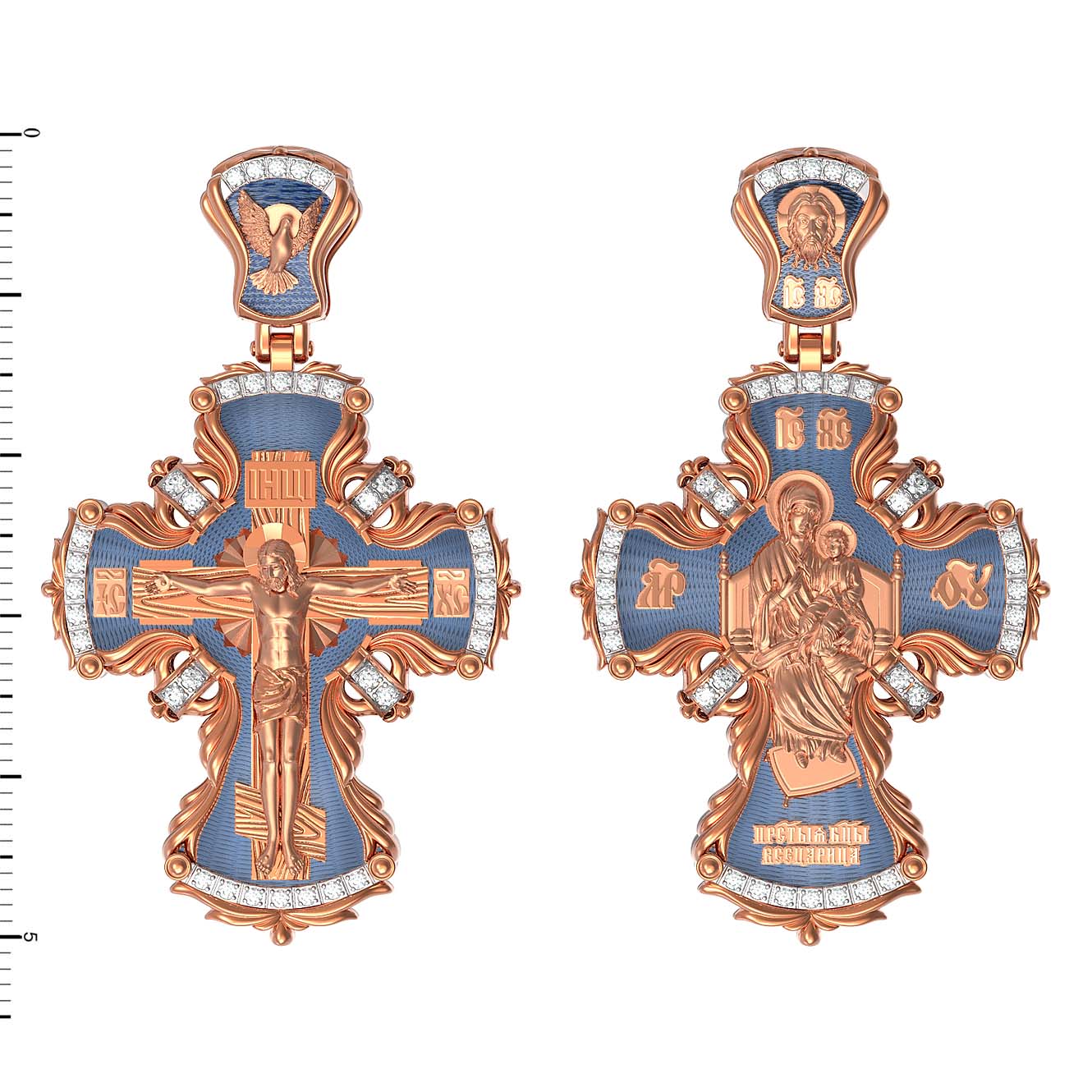 На оборотной стороне креста изображена икона Божией Матери «Всецарица», на которой Пресвятая Богородица восседает на царском троне. На руках Ее — Богомладенец Христос со свитком в левой руке и благословляющий десницей. Правой рукой Богородица указывает на Своего Царственного Сына, как на Спасителя мира. Чудотворная икона была написана в XVII веке и находится на Святой Горе Афон, в одном из древних греческих монастырей — Ватопеде. Икона совершила множество чудесных исцелений. Пречистая Богородица наставляет на праведный путь, помогает укрепить веру, найти утешение. На кулонном кольце помещено изображение Нерукотворного образа Господа и Спасителя нашего Иисуса Христа. Ему придается победное и защитное значение.