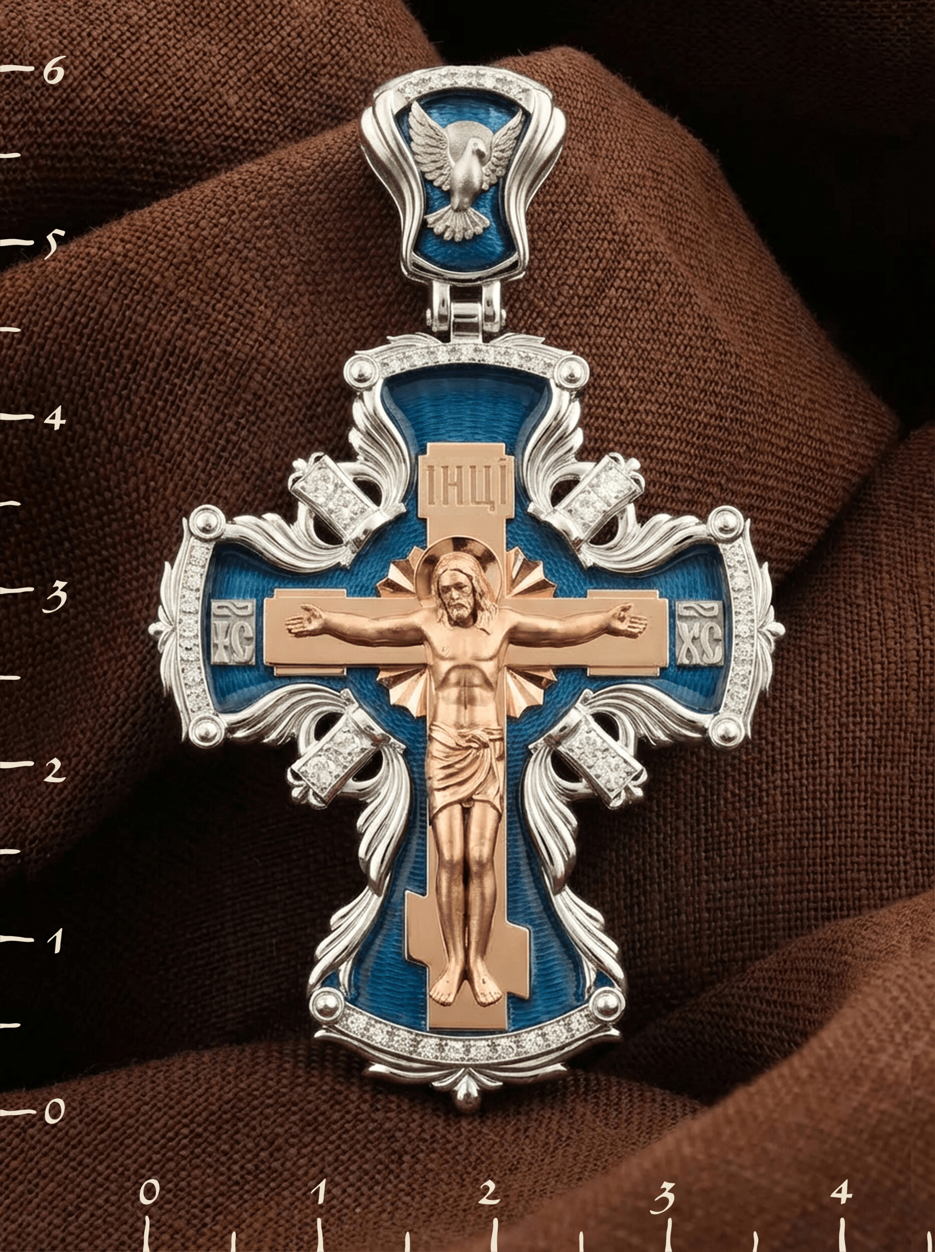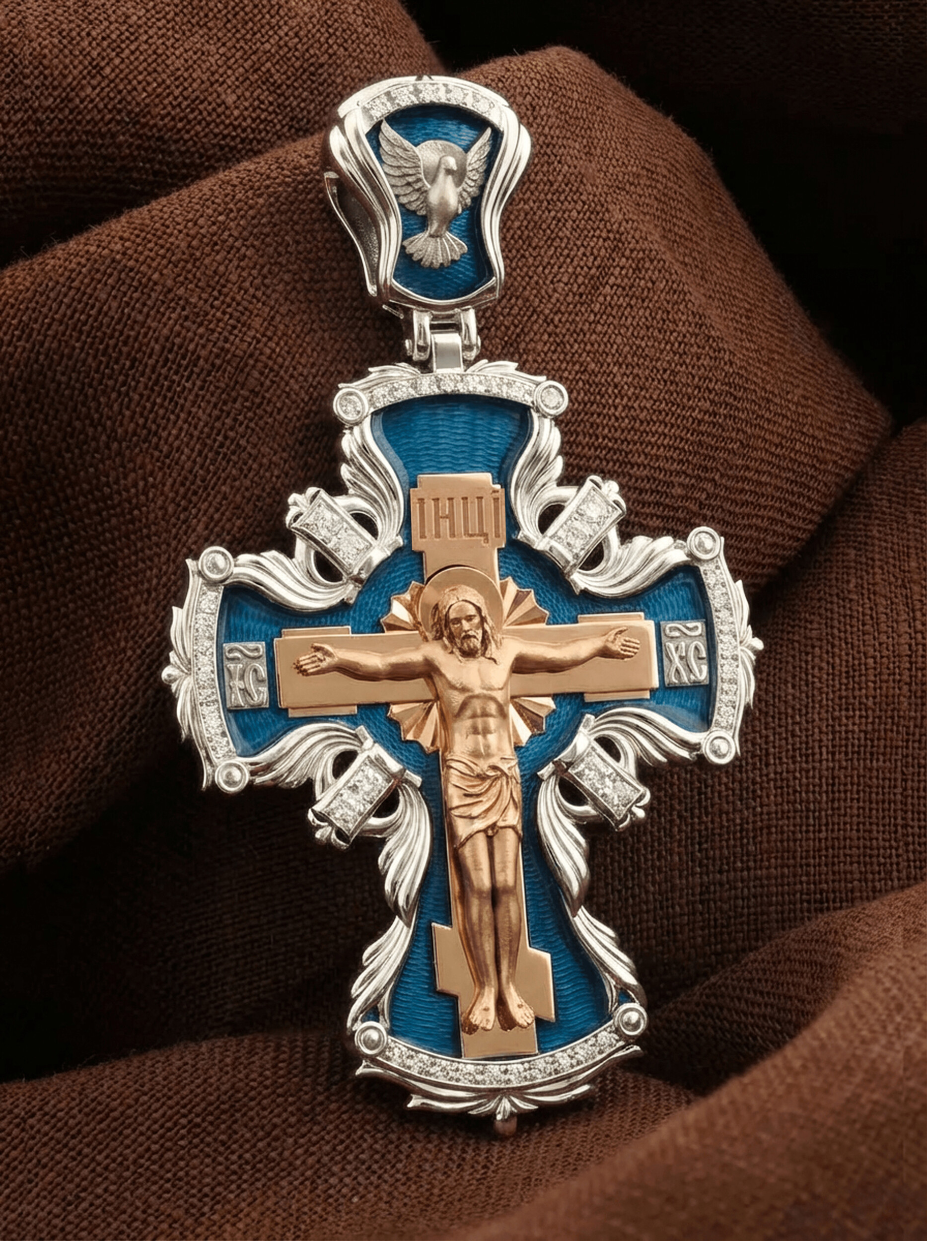 Центральную часть лицевой стороны занимает Распятие Христа — образ жертвы, принесенной Господом за грехи людей. Именно ко Христу, сошедшему на землю ради нашего спасения, возносятся все молитвы. Рядом с Его образом помещены слова — «НИКА» и «СЫН БОЖИЙ». Эти слова характеризуют Господа как Великого Архиерея, победителя смерти. Также Распятие сопровождается надписями, олицетворяющими Христа — это святое имя Христа «IC» (Иисус) «ХС» (Христос). На кулонном кольце изображен голуь — символ Святого Духа.