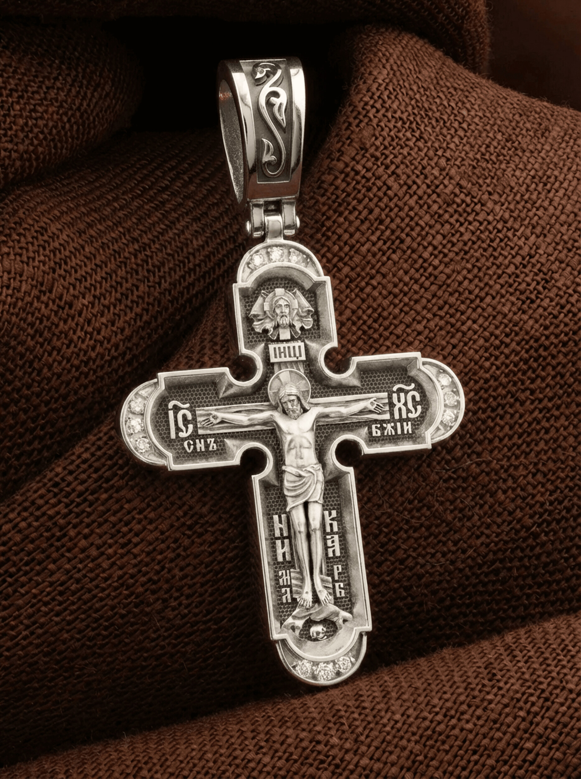 На лицевой стороне нательного креста по традиции изображено Распятие Господа нашего Иисуса Христа. Крест Господень стоит на небольшом каменистом возвышении, символизирующем гору Голгофу, которая обозначена буквами МЛРБ (Место Лобное Рай Бысть). Над головой Господа на поперечной перекладине написано «ИНЦИ», что символизирует табличку, которая была прибита к Кресту, с надписью «Иисус Назорей Царь Иудейский». Этим иудеи хотели посмеяться над Христом, не зная, что распинают истинного Царя всех царей. По сторонам основной перекладины расположены позолоченные рельефные инициалы Христа «ИС ХС». Под перекладиной, по сторонам древа, находится надпись «СЫН БОЖИЙ», а в основании креста — надпись «НИКА» (Победитель).