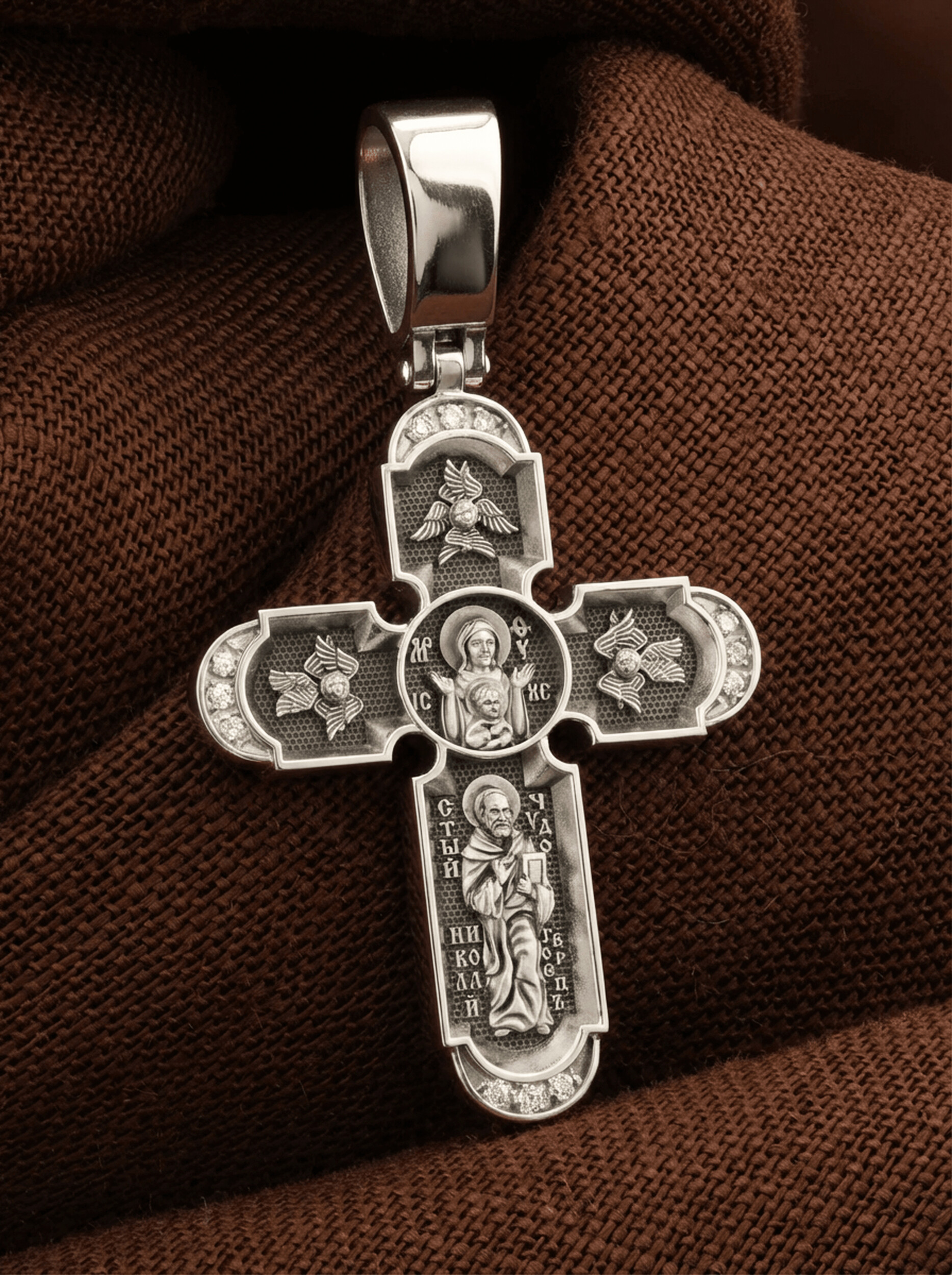 У основания креста в полный рост изображен самый любимый святой Православной Церкви — Николай Чудотворец. Святой почитается как целитель болезней, покровитель путешествующих, особенно по морю, помощник в торговле, учебе, а также в поисках достойного супруга.