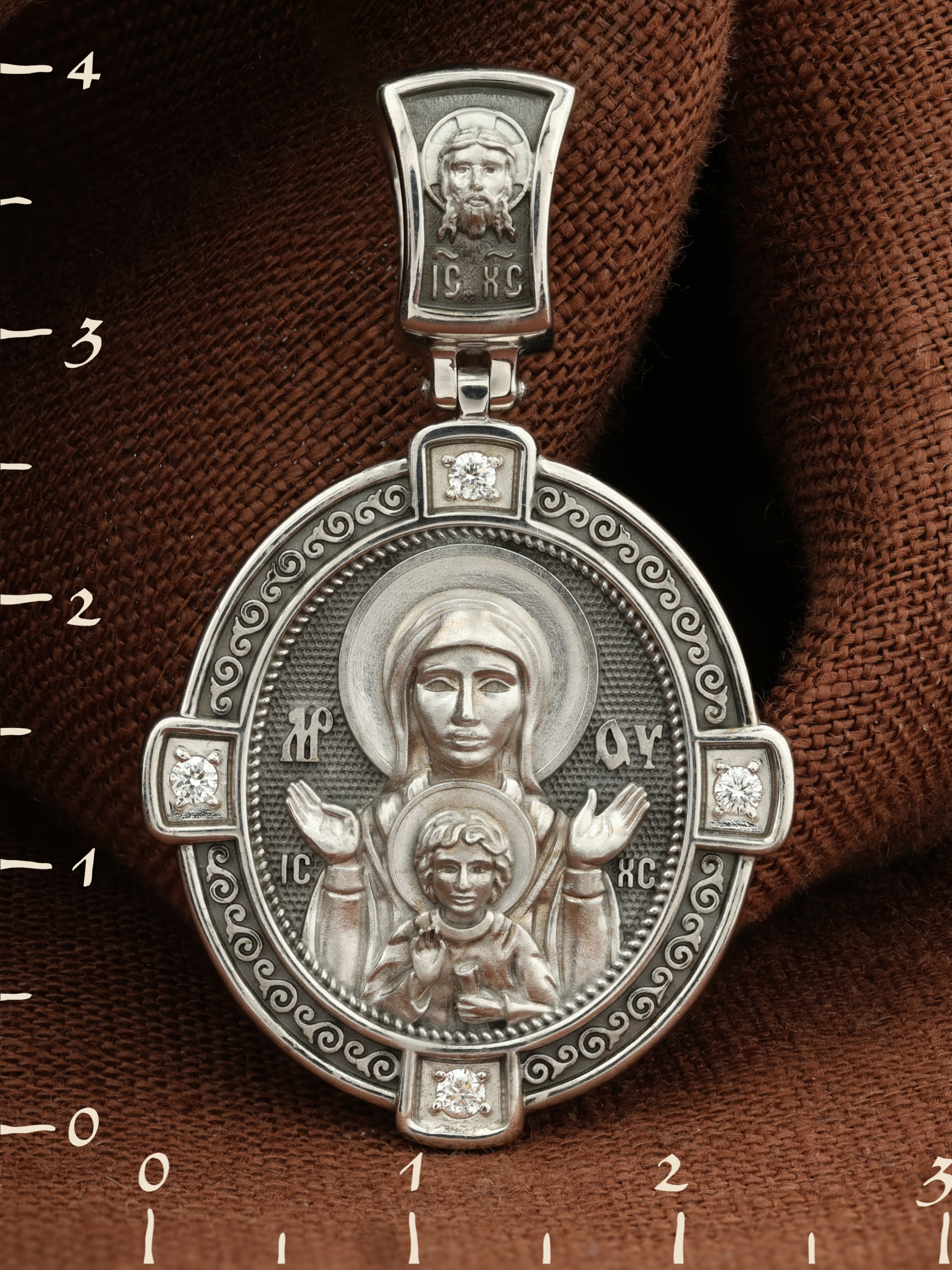 В центр образка помещен образ Божией Матери «Знамение», прославившийся многими чудесами в Новгороде в XII веке. Икона эта чтится как одна из самых великих святынь Русской земли. Молитвенно воздетые руки Богородицы означают заступничество за людей пред Богом. Рядом с Ней — благословляющий Божественный Младенец — Спас-Эммануил.