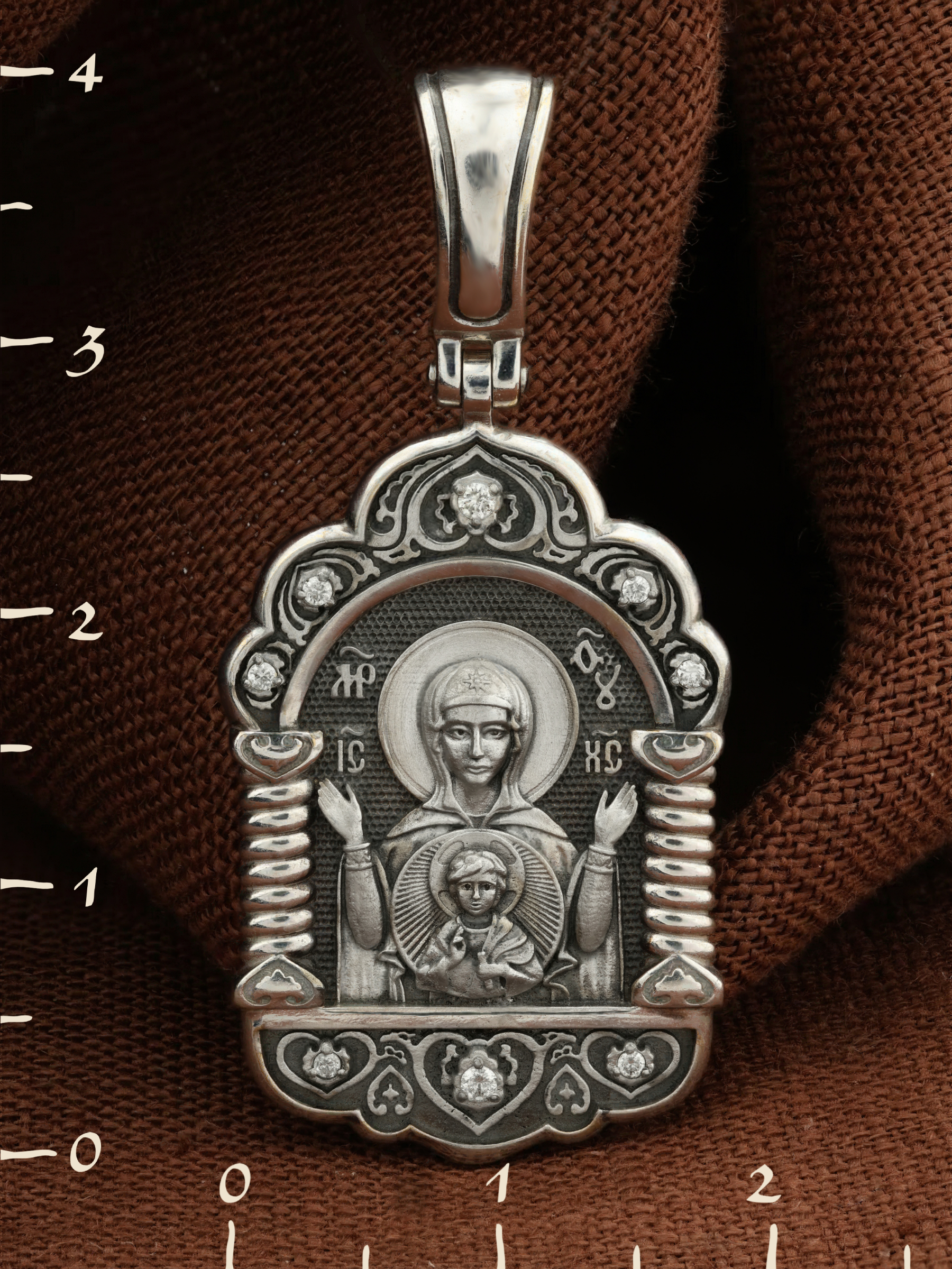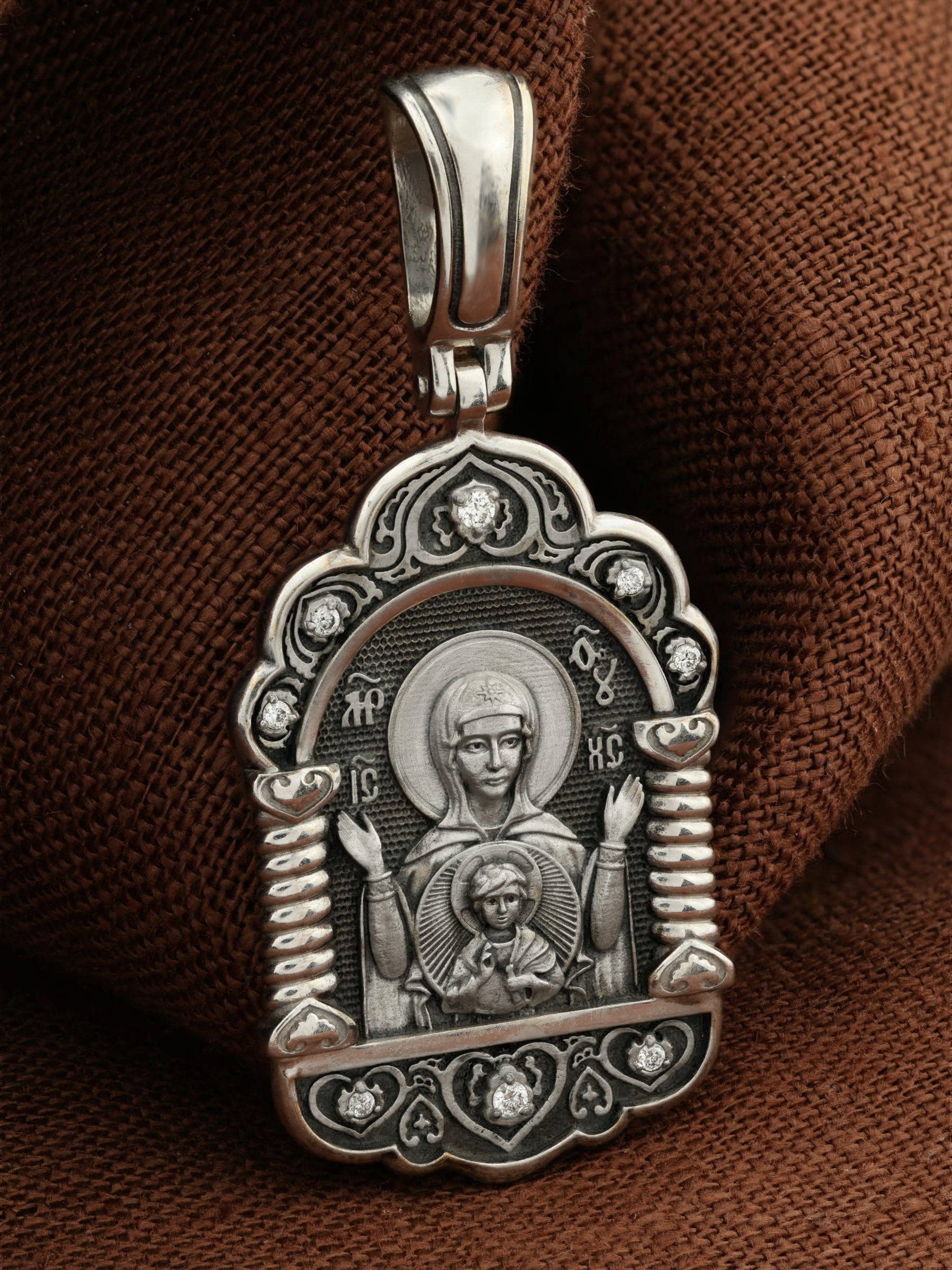 В центр образка помещен образ Божией Матери «Знамение», прославившийся многими чудесами в Новгороде в XII веке. Икона эта чтится как одна из самых великих святынь Русской земли. Молитвенно воздетые руки Богородицы означают заступничество за людей пред Богом. Рядом с Ней, на фоне круглого щита, — благословляющий Божественный Младенец — Спас-Эммануил.