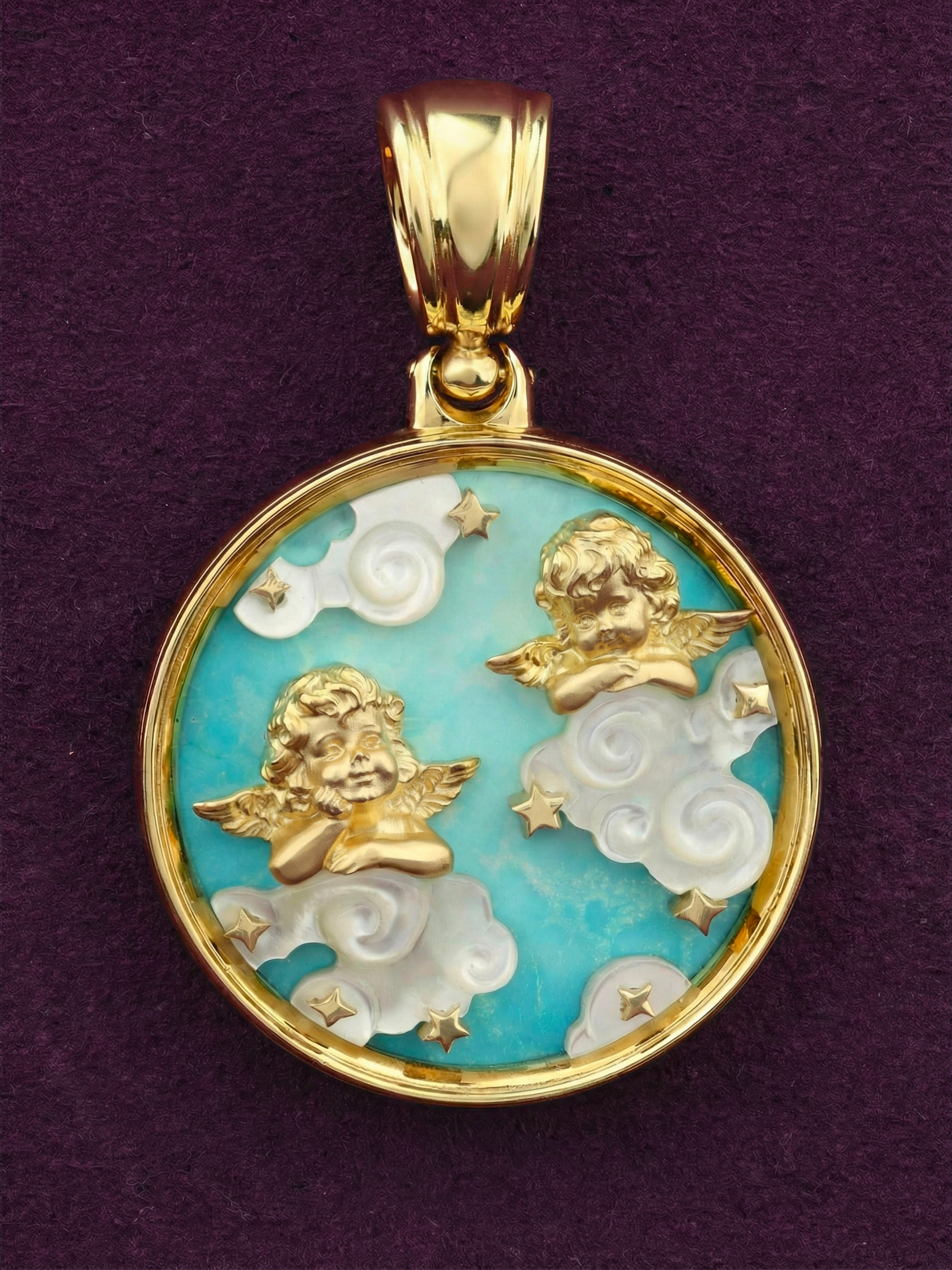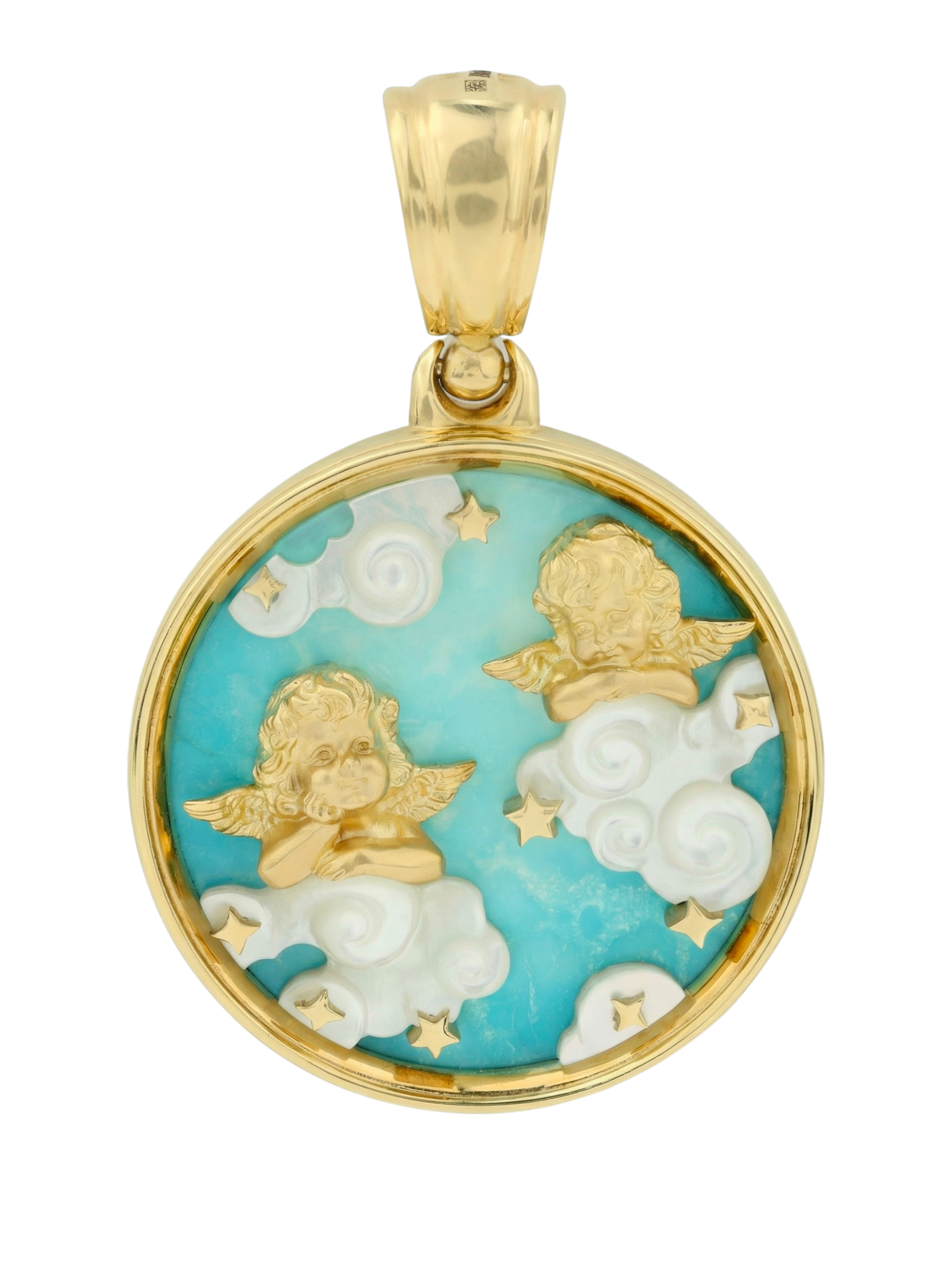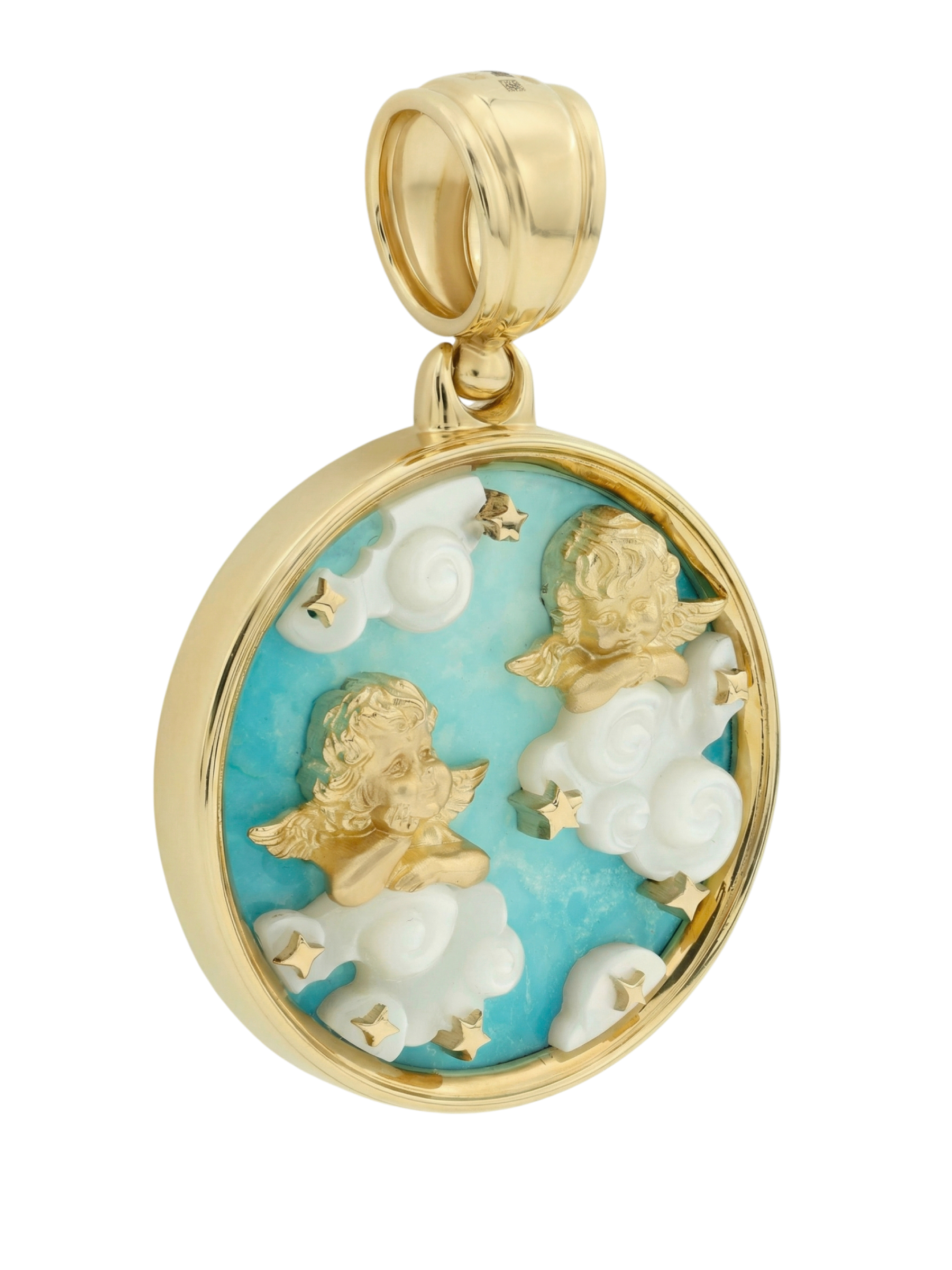 Особую выразительность подвеске придает сочетание благородного лимонного золота с натуральными вставками. Яркий бирюзовый фон символизирует чистое небо, а перламутр, из которого выполнены фигурные облака, создает мягкое, переливающееся свечение. В центре композиции расположены миниатюрные звезды, добавляющие изделию сказочного шарма. Благодаря универсальному дизайну, эта подвеска станет прекрасным дополнением образа как для женщин, так и для мужчин.