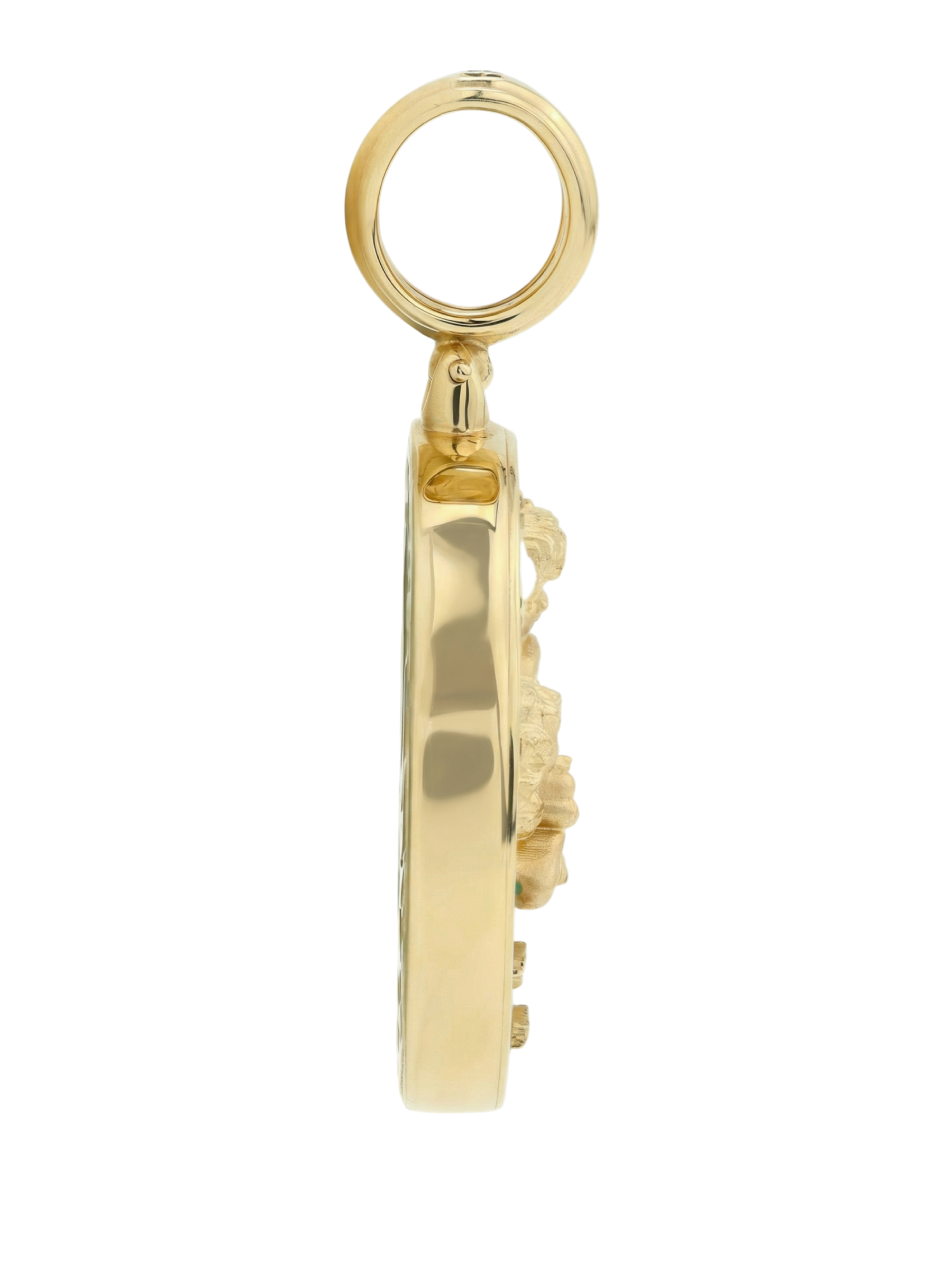 Изысканная подвеска из лимонного золота 585 пробы — это воплощение нежности и художественного мастерства, которое подчеркнет ваш тонкий вкус. Украшение принадлежит коллекции De luxe Premium — Амуры и притягивает взгляд своей оригинальной композицией. Дизайн изделия выполнен в форме круга, внутри которого размещены детализированные фигурки купидонов, парящих в небесной выси.