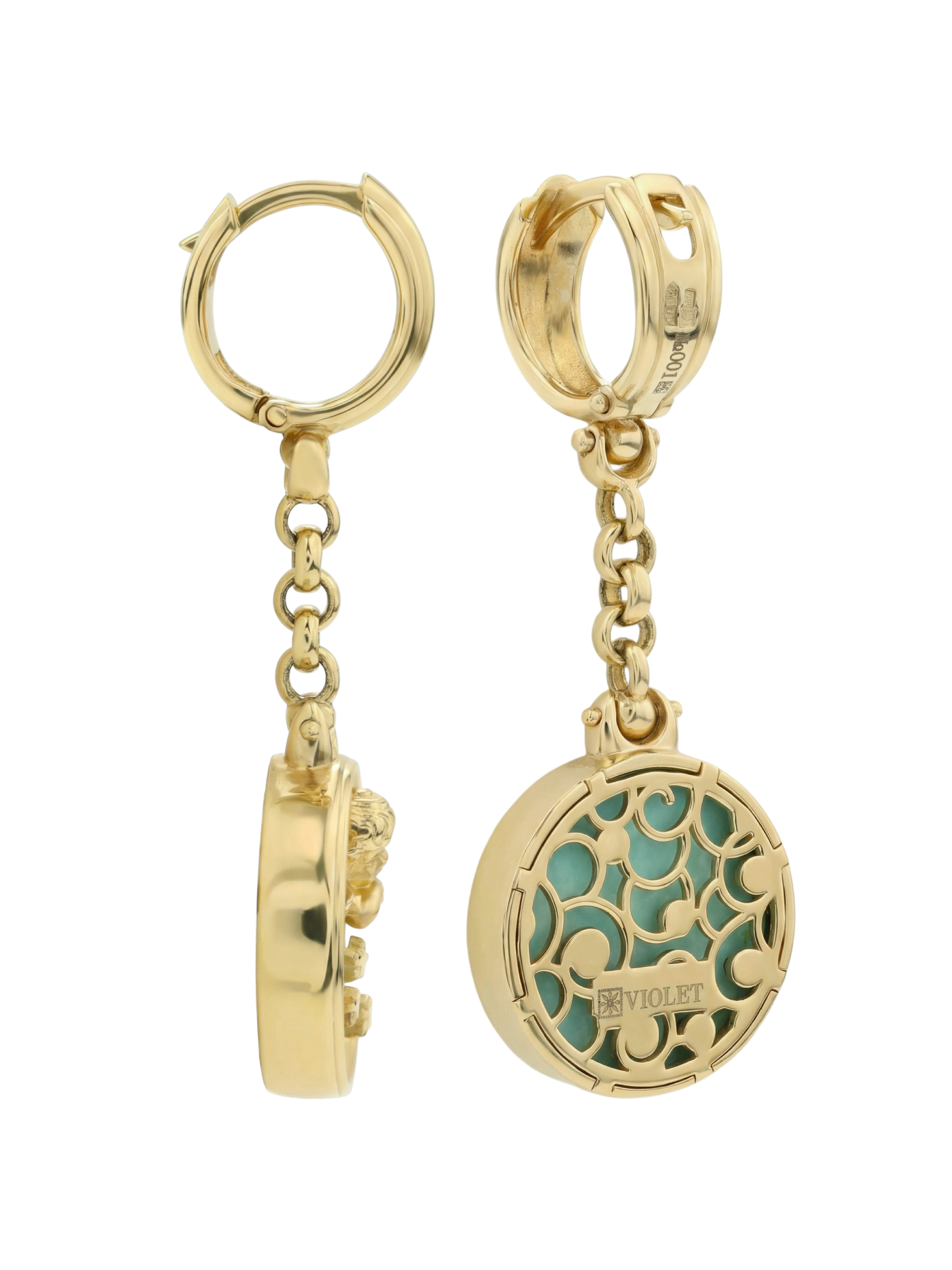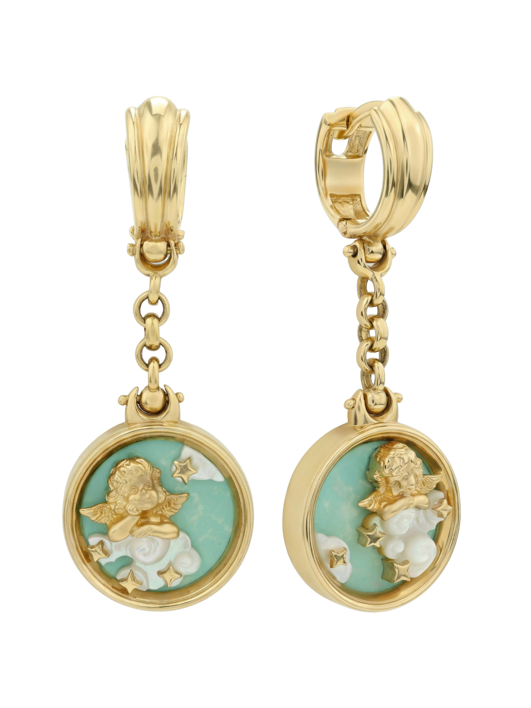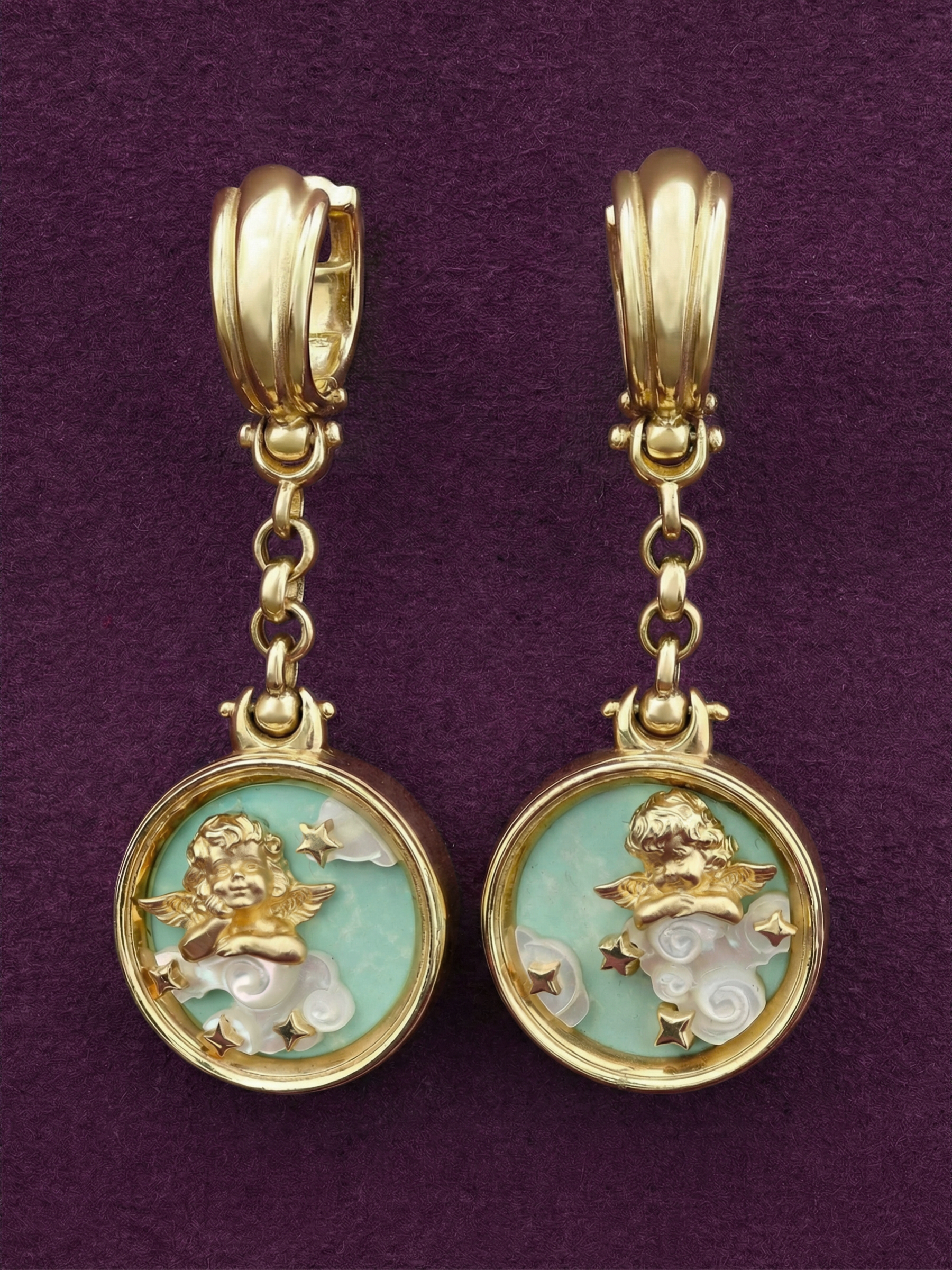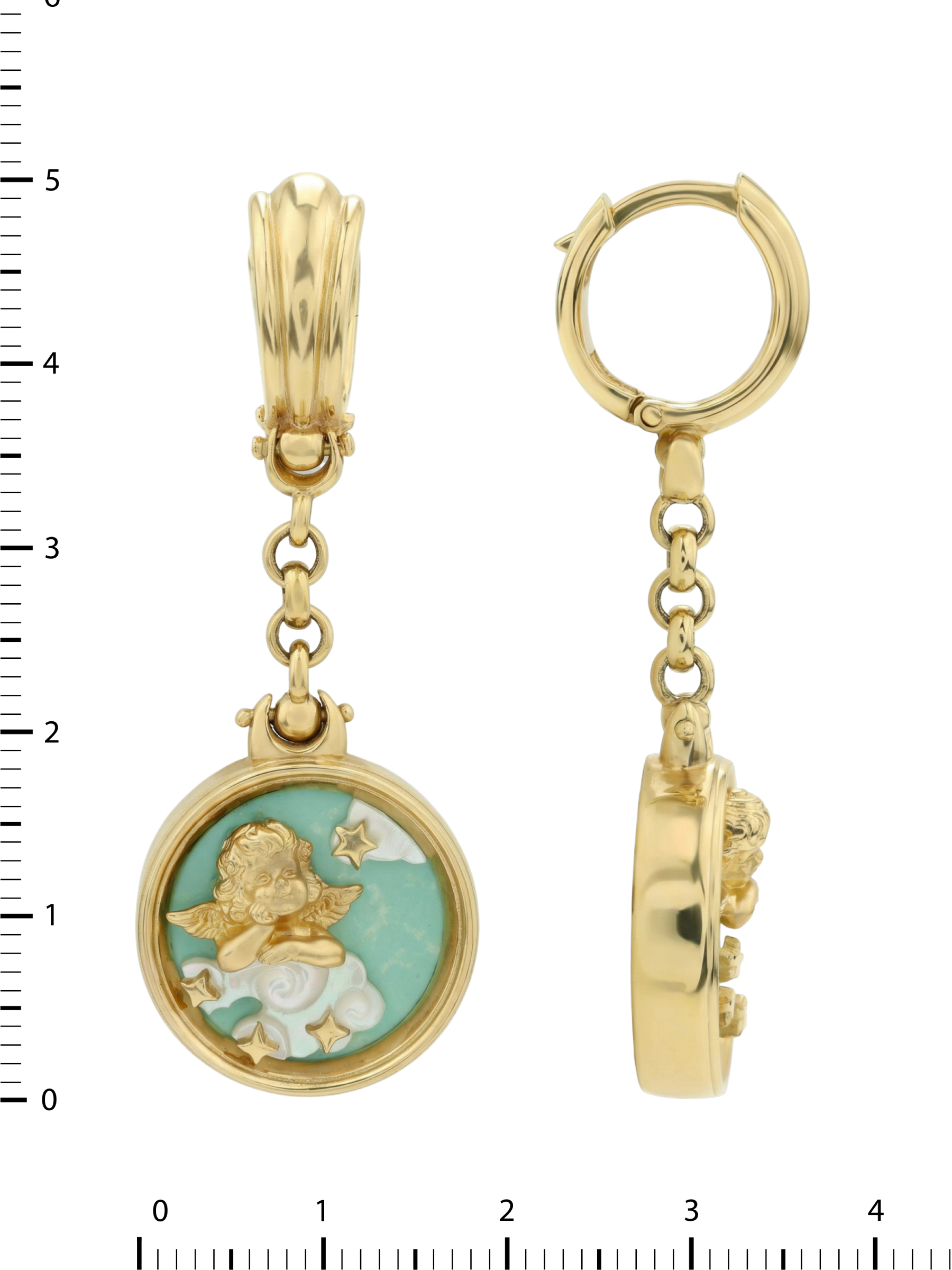 В оформлении изделия использованы вставки из бирюзы и перламутра. Бирюзовый цвет камней гармонично дополняет переливы перламутра, создавая нежный и запоминающийся контраст. Две круглые вставки изящно обрамляют золотых амуров, создавая ощущение легкости и воздушности. Лаконичная форма круглых вставок позволяет украшению выглядеть сдержанно и при этом привлекать восхищенные взгляды.