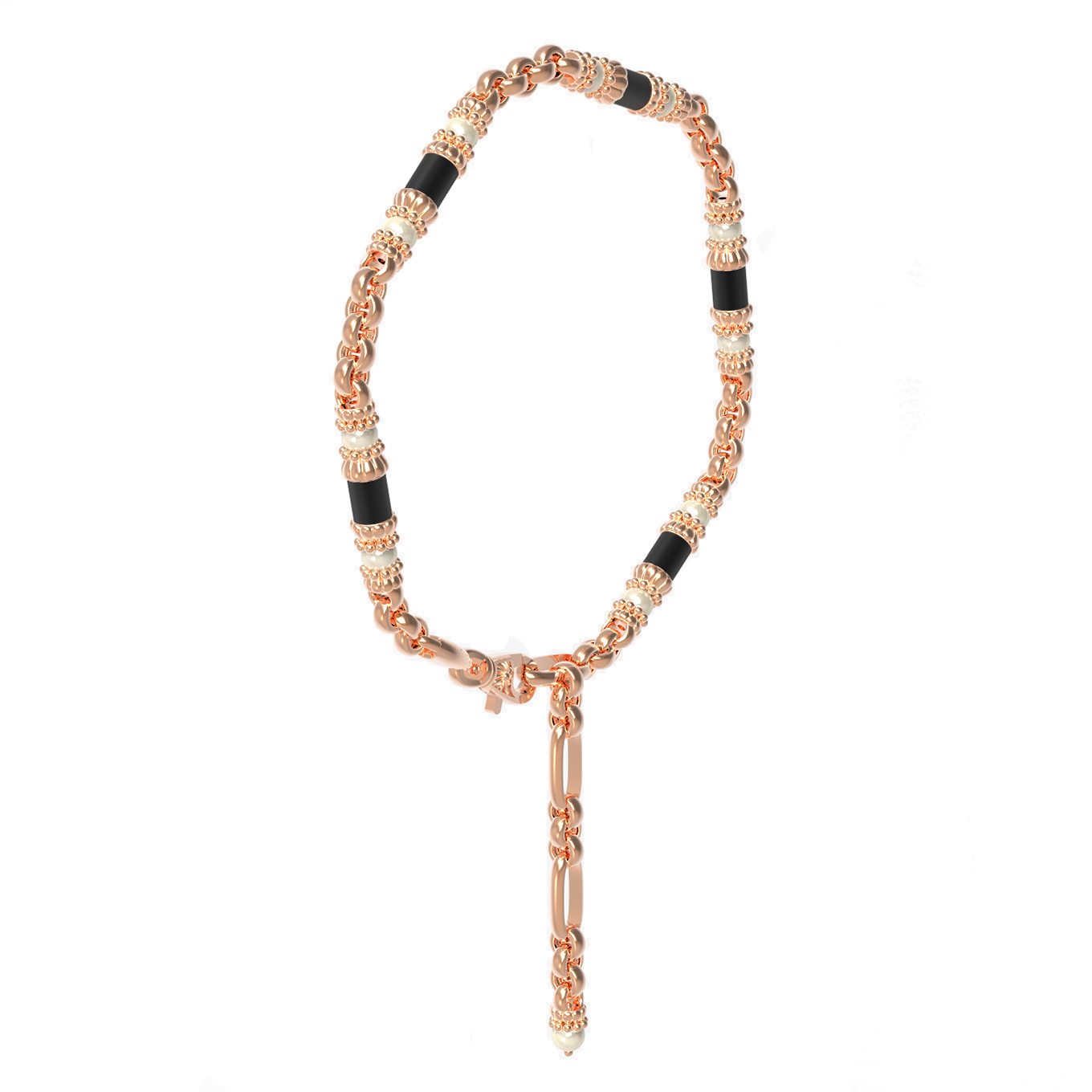 В браслете использовано 16 вставок круглой и цилиндрической формы, которые создают ритмичный и притягательный рисунок на золотой цепи красного цвета. Такое сочетание материалов и геометрических форм подчеркивает статусность украшения. Благодаря универсальной стилистике, изделие одинаково эффектно смотрится как на женщинах, так и на мужчинах, подчеркивая индивидуальность владельца.