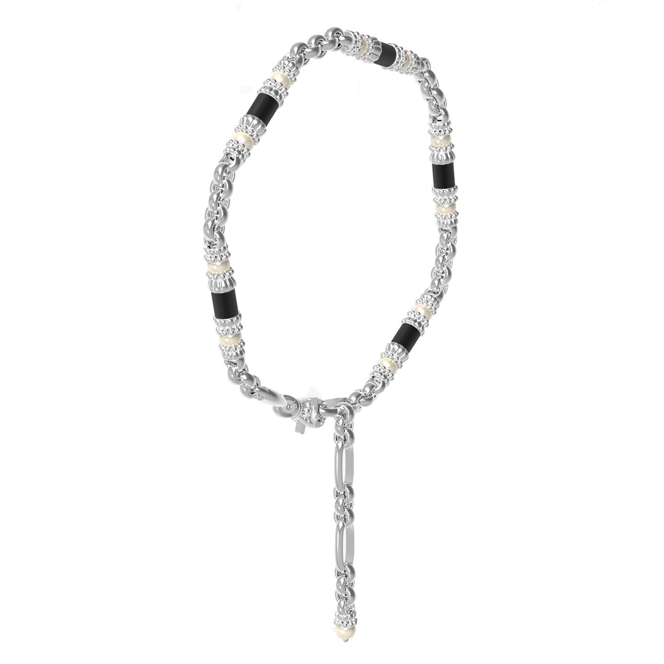 Изысканный браслет из белого золота 585 пробы станет утонченным акцентом вашего образа. Дизайн украшения вдохновлен мотивами Индии, сочетая в себе строгость линий и природную мягкость жемчуга. Это универсальное ювелирное изделие подойдет как для женщин, так и для мужчин, подчеркивая статусность и безупречный вкус владельца. В основе композиции лежит чередование контрастных элементов: вставки из белого жемчуга круглой формы гармонично соседствуют с черным ониксом в форме цилиндра.