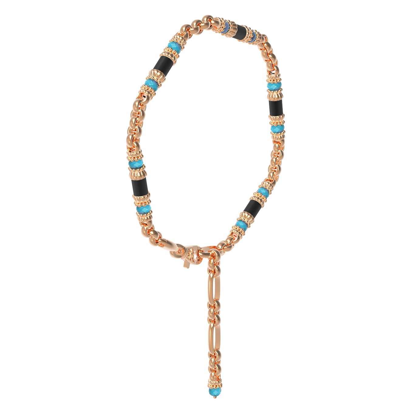 Центральным элементом композиции стали 16 тщательно отобранных вставок. Яркая бирюза бирюзового цвета в форме бусин чередуется с благородным черным ониксом, представленным в виде строгих цилиндров. Такое сочетание фактур и цветов создает выразительный визуальный акцент, привлекая внимание к запястью. Глубокий черный цвет оникса эффектно оттеняет небесную чистоту бирюзы, создавая сбалансированный и притягательный образ.