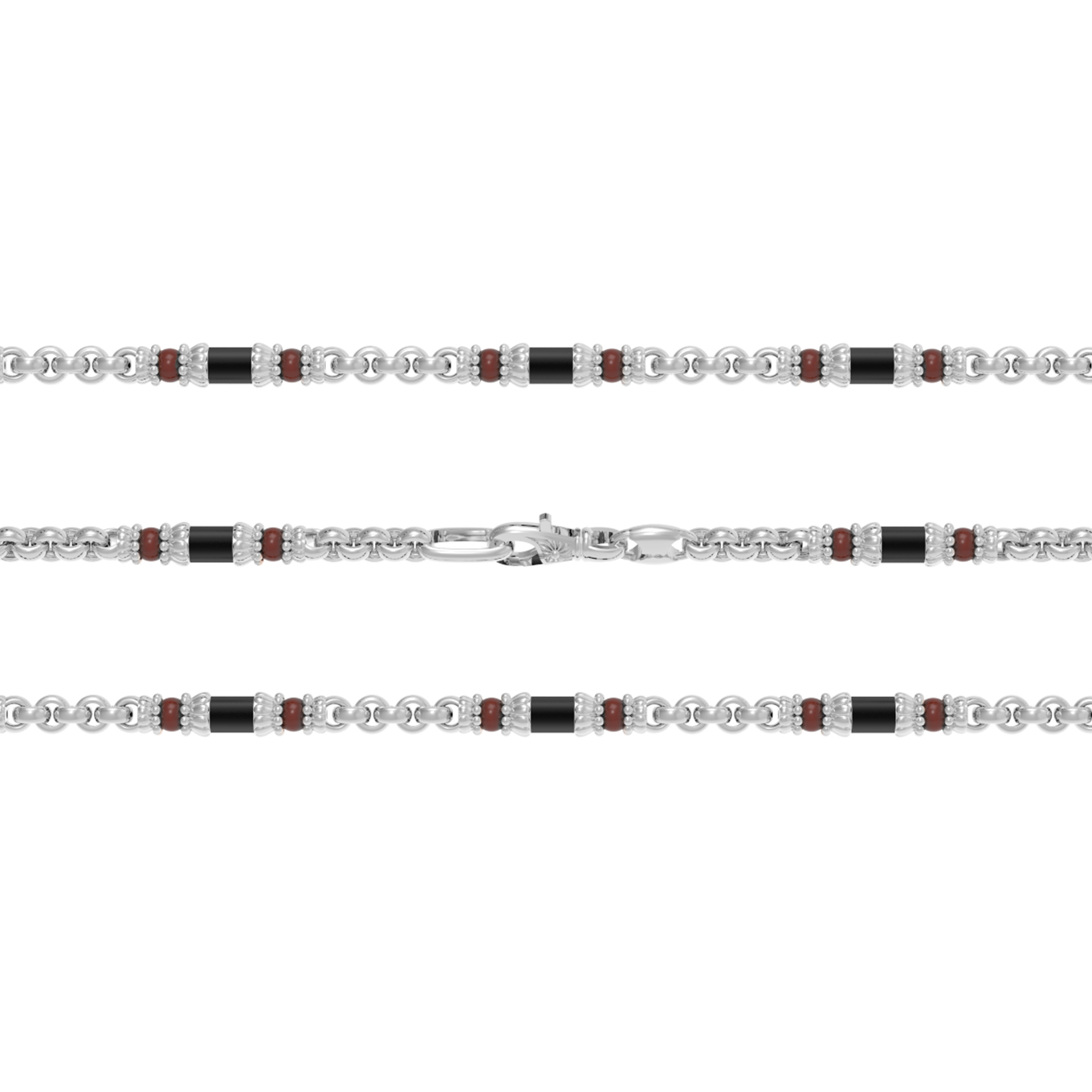 Главная особенность изделия — сложное контрастное оформление. В плетение интегрировано 147 вставок, чередующих оникс и коралл. Чёрные цилиндрические элементы из оникса подчеркивают глубину белого золота, а красные бусины из коралла добавляют яркий, акцентный штрих. Такое сочетание материалов создает выразительный визуальный ритм, который делает цепочку самодостаточным украшением.