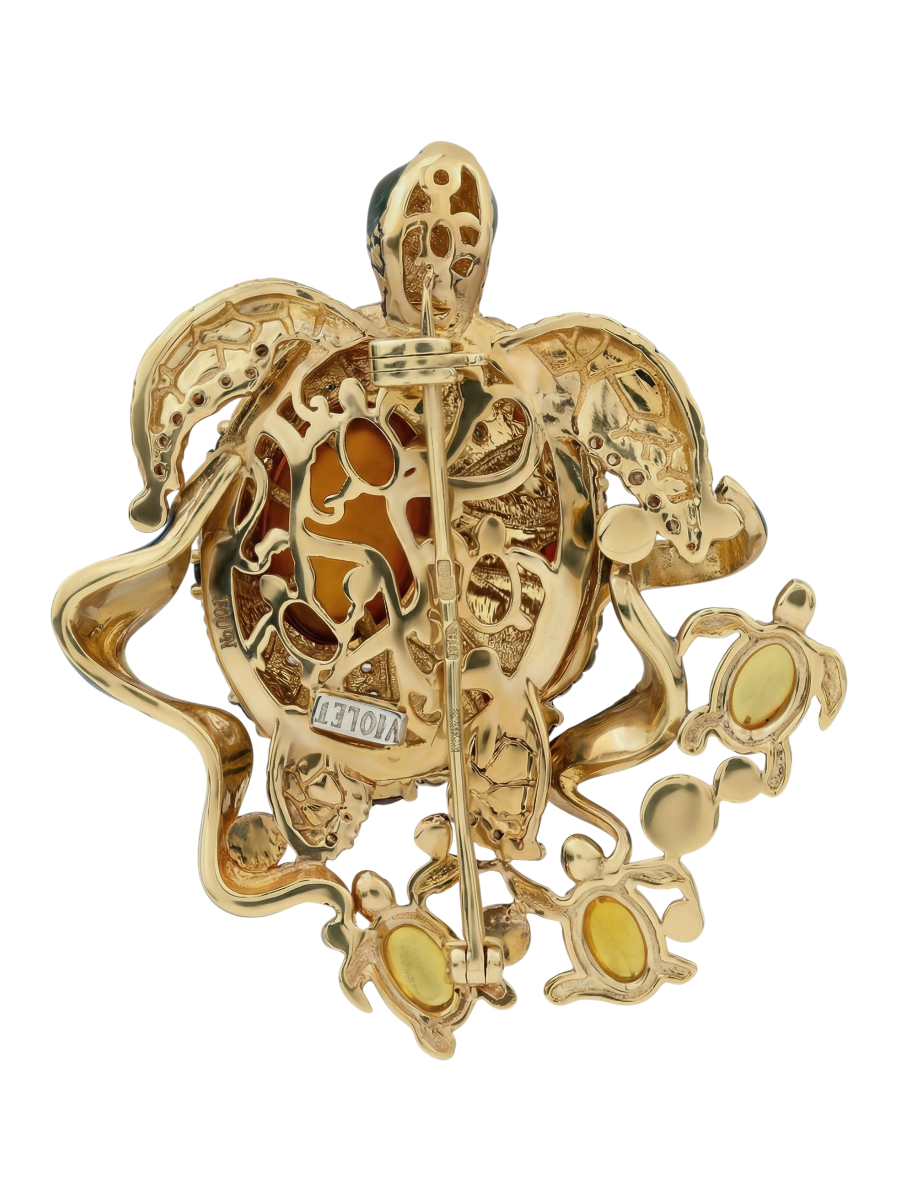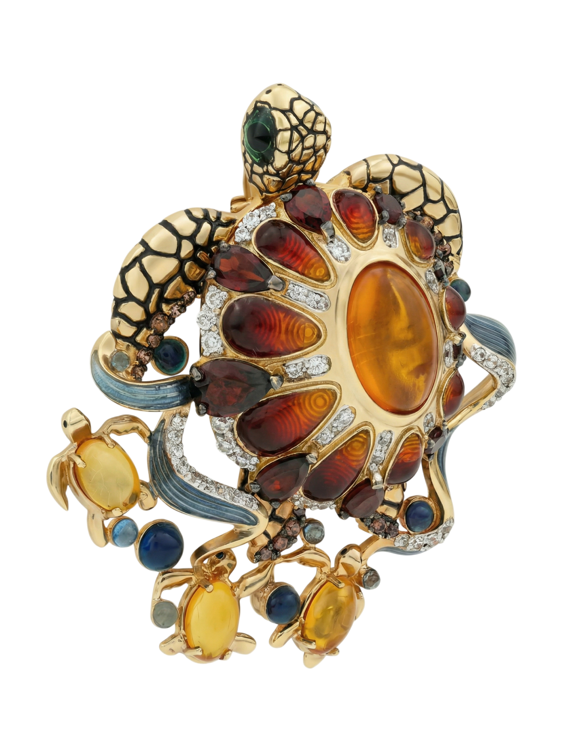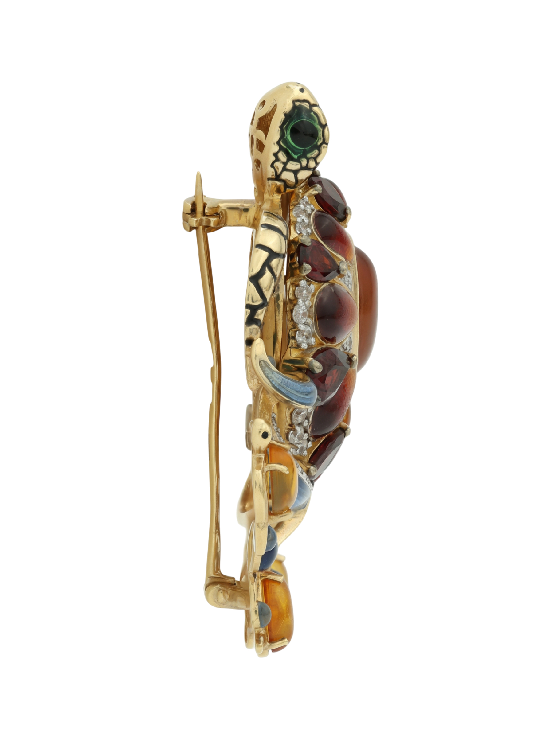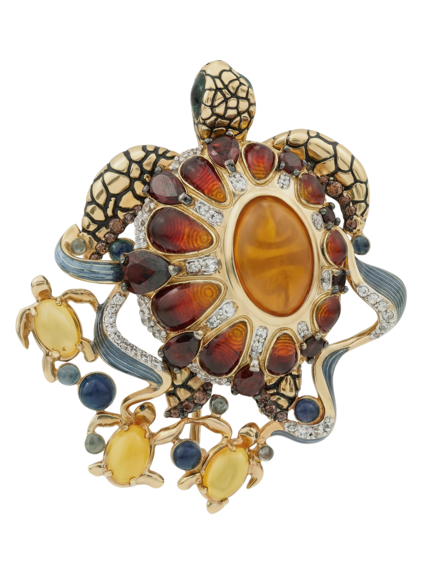 Брошь из лимонного золота 585 пробы c эмалью, фианитом, гранатом и янтарём