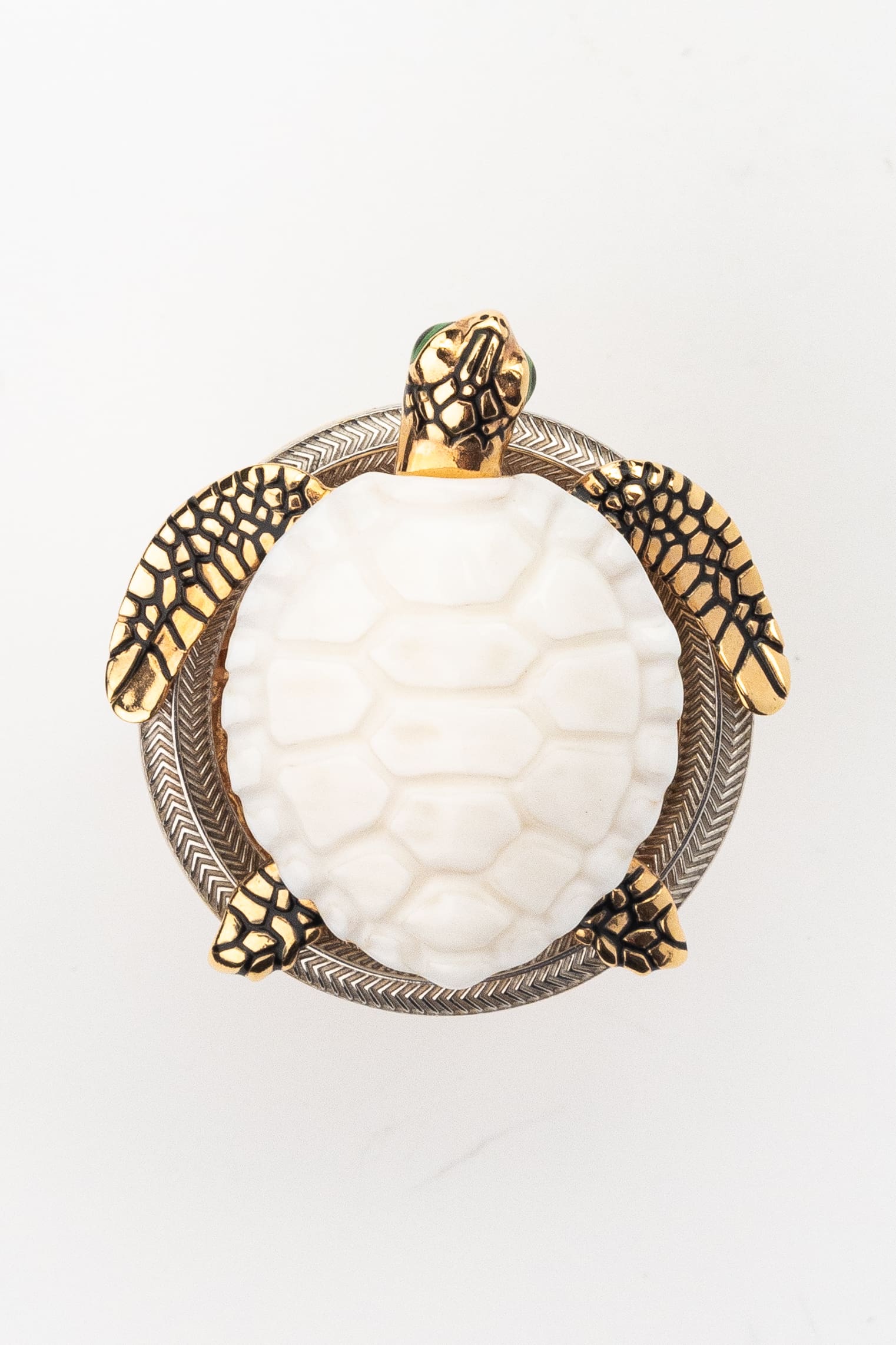 Это кольцо с дизайном черепахи является частью комплекта, что позволяет собрать полноценный гарнитур для завершенного образа. Широкий размерный ряд, включающий размеры от 15 до 23, позволяет подобрать идеальный вариант для любого пальца. Выбирая это украшение, вы приобретаете ювелирный шедевр, который сочетает в себе классические традиции обработки красного золота, эксклюзивные вставки из бивня мамонта и мастерство работы с эмалью. Такое кольцо станет достойным пополнением вашей коллекции драгоценностей или роскошным подарком для ценителя эксклюзивных изделий.