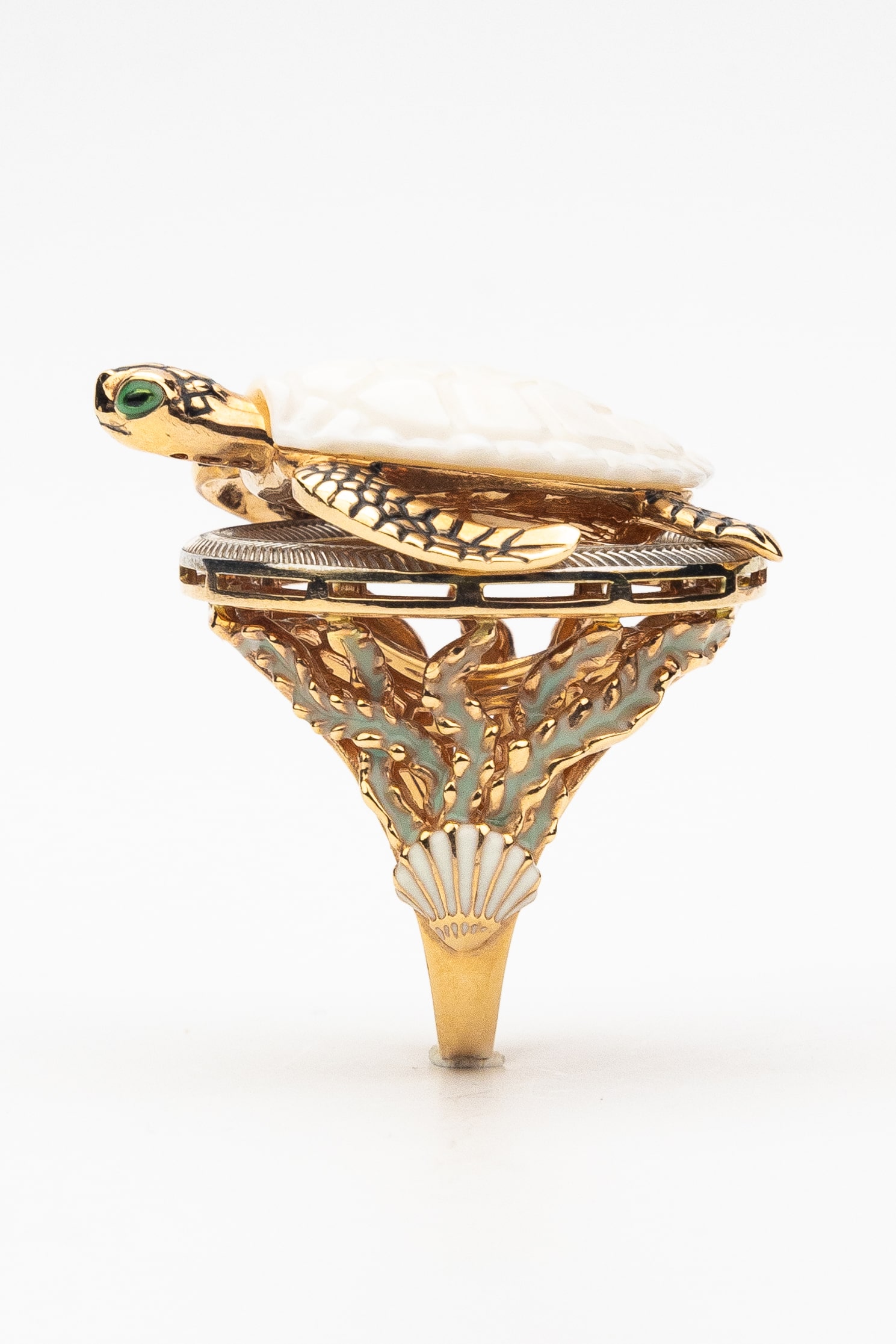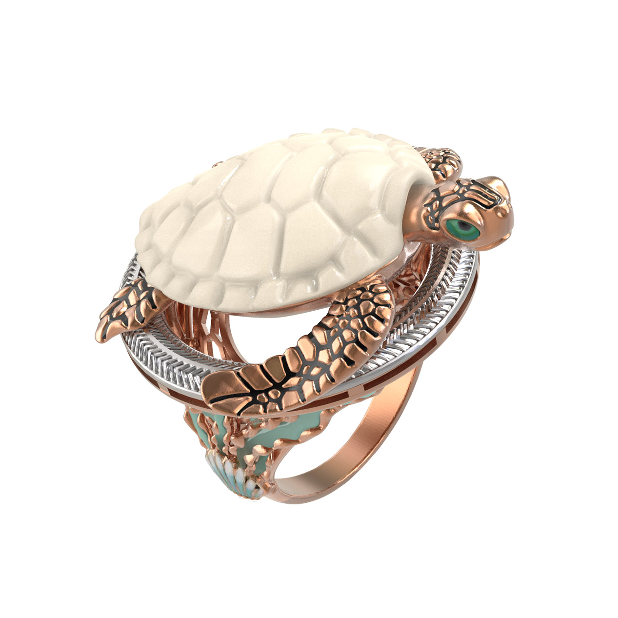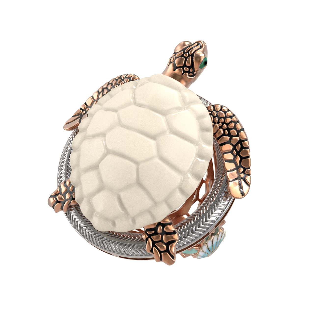 Основой изделия служит качественное красное золото 585 пробы, которое придает украшению теплый, благородный оттенок. Мастерское сочетание материалов создает неповторимый визуальный эффект: панцирь черепахи выполнен из натурального бивня мамонта белого цвета, что придает кольцу особый шарм, а декоративная эмаль разноцветных оттенков добавляет яркие и живые акценты. Каждая деталь проработана с максимальной тщательностью, чтобы подчеркнуть природную грацию выбранного образа.