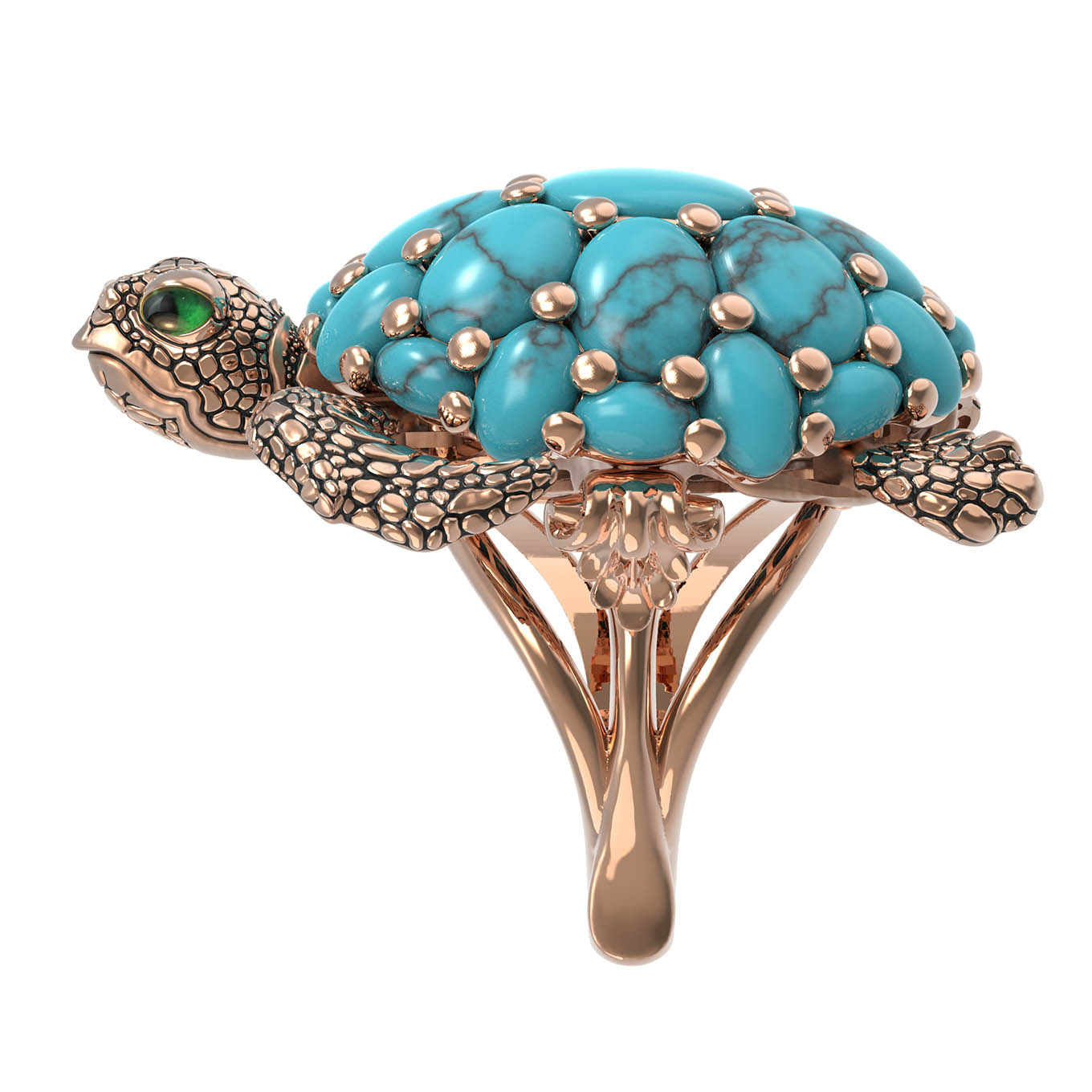 Кольцо из красного золота 585 пробы из коллекции De luxe Premium — Черепахи станет ярким акцентом в вашем ювелирном гардеробе. Украшение выполнено в оригинальном дизайне в форме черепахи, сочетающем в себе благородный металл и мастерскую работу с цветом. Панцирь черепахи инкрустирован 25 вставками из бирюзы синего цвета овальной формы, которые создают завораживающий объемный эффект. Выразительность образу придают детали, декорированные эмалью, дополняющие общую эстетику изделия.