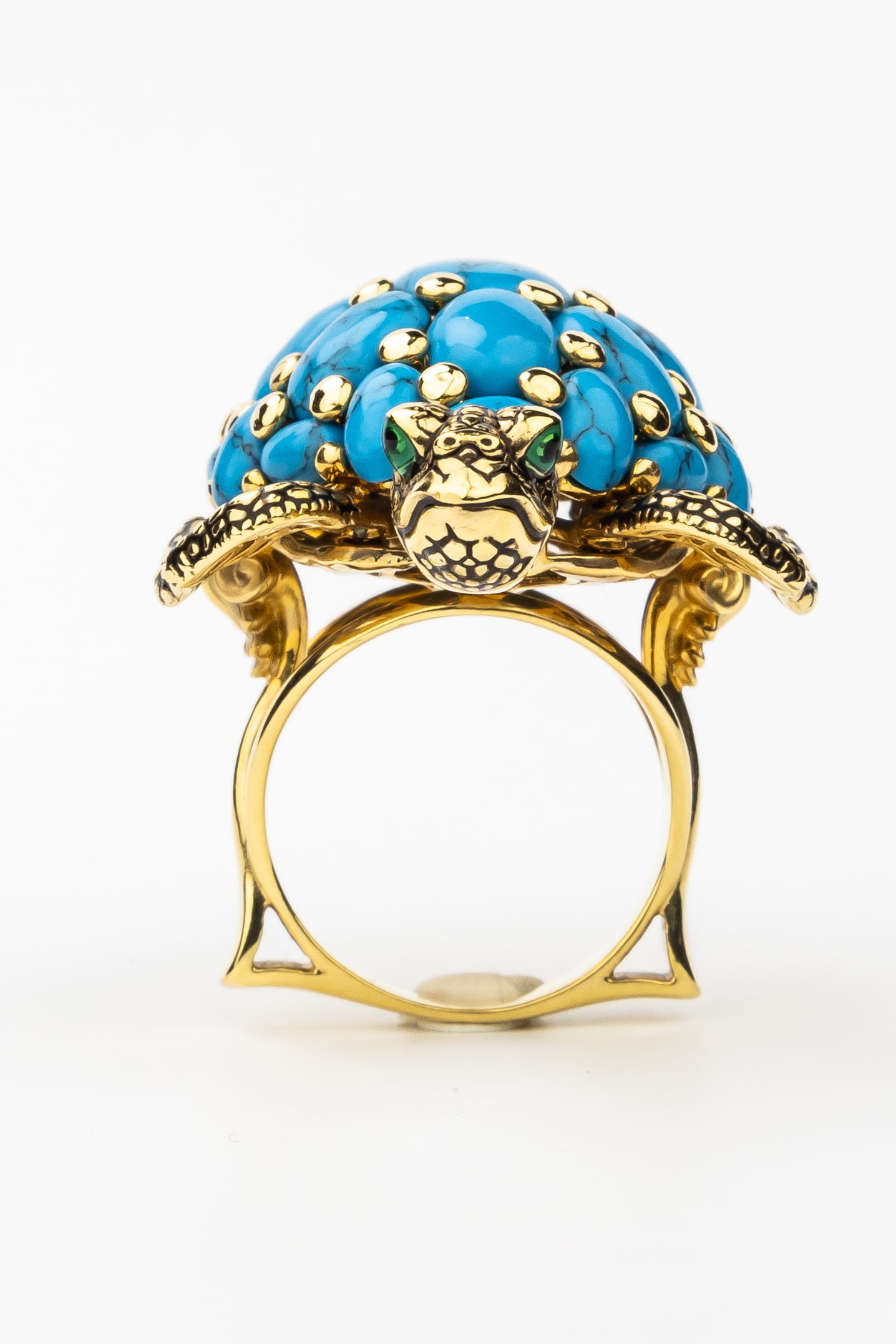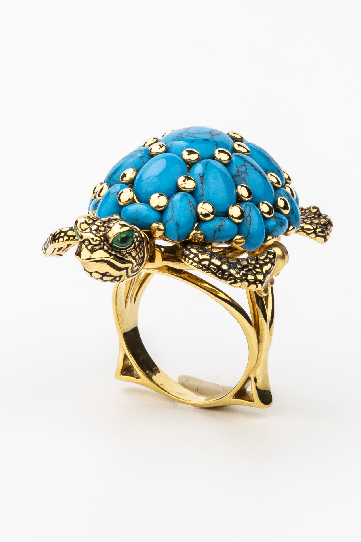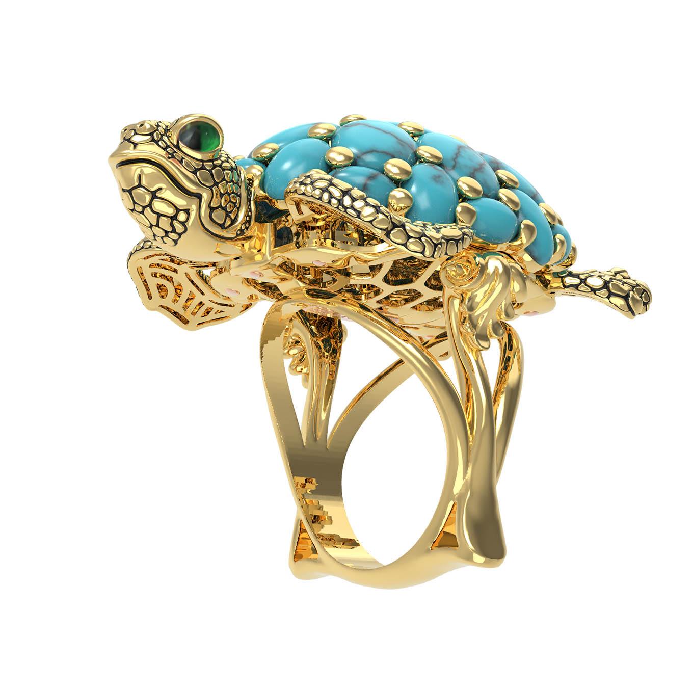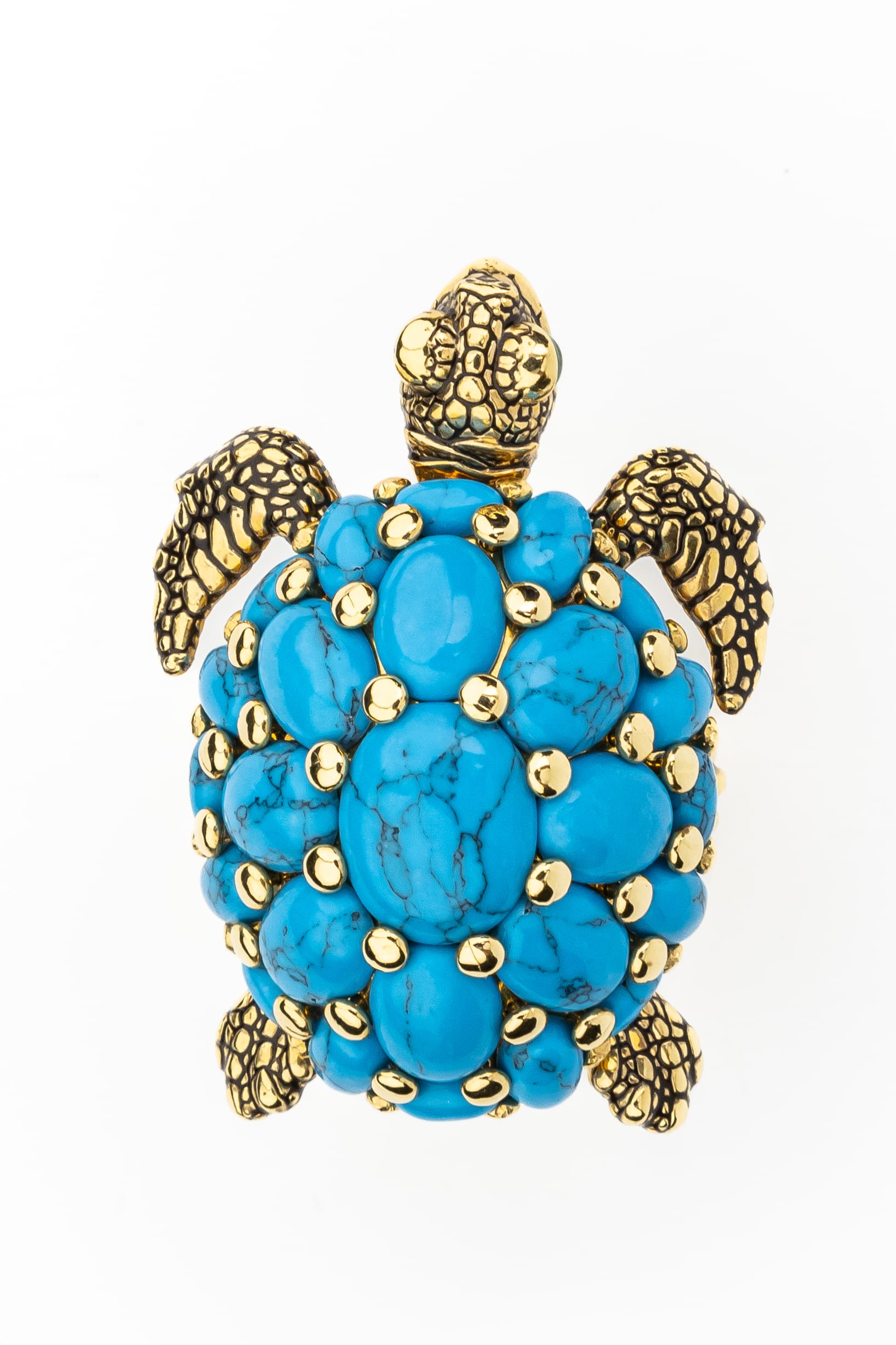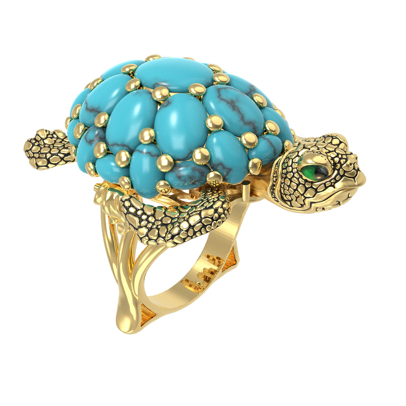 Кольцо из лимонного золота 585 пробы из коллекции De luxe Premium — Черепахи — это ювелирное воплощение искусства, сочетающее в себе изысканный дизайн и глубокий символизм. Центральным элементом украшения выступает фигура черепахи, выполненная с невероятной детализацией. Панцирь черепахи декорирован 25 вставками из натуральной бирюзы овальной формы. Яркий синий цвет камней гармонично контрастирует с благородным лимонным оттенком золота и декоративными элементами из цветной эмали.