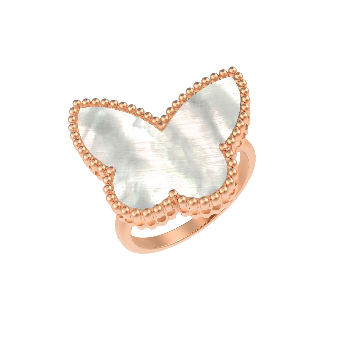 Изящное кольцо из красного золота 585 пробы — это воплощение нежности и утонченного вкуса. Центральный элемент украшения выполнен в форме бабочки, чей природный силуэт подчеркнут драгоценным металлом теплого оттенка. Вставка из натурального перламутра с его мягким, переливающимся свечением придает изделию особую глубину и выразительность. Дизайн в виде бабочки делает кольцо центральным акцентом любого образа, привлекая внимание своей лаконичной красотой.