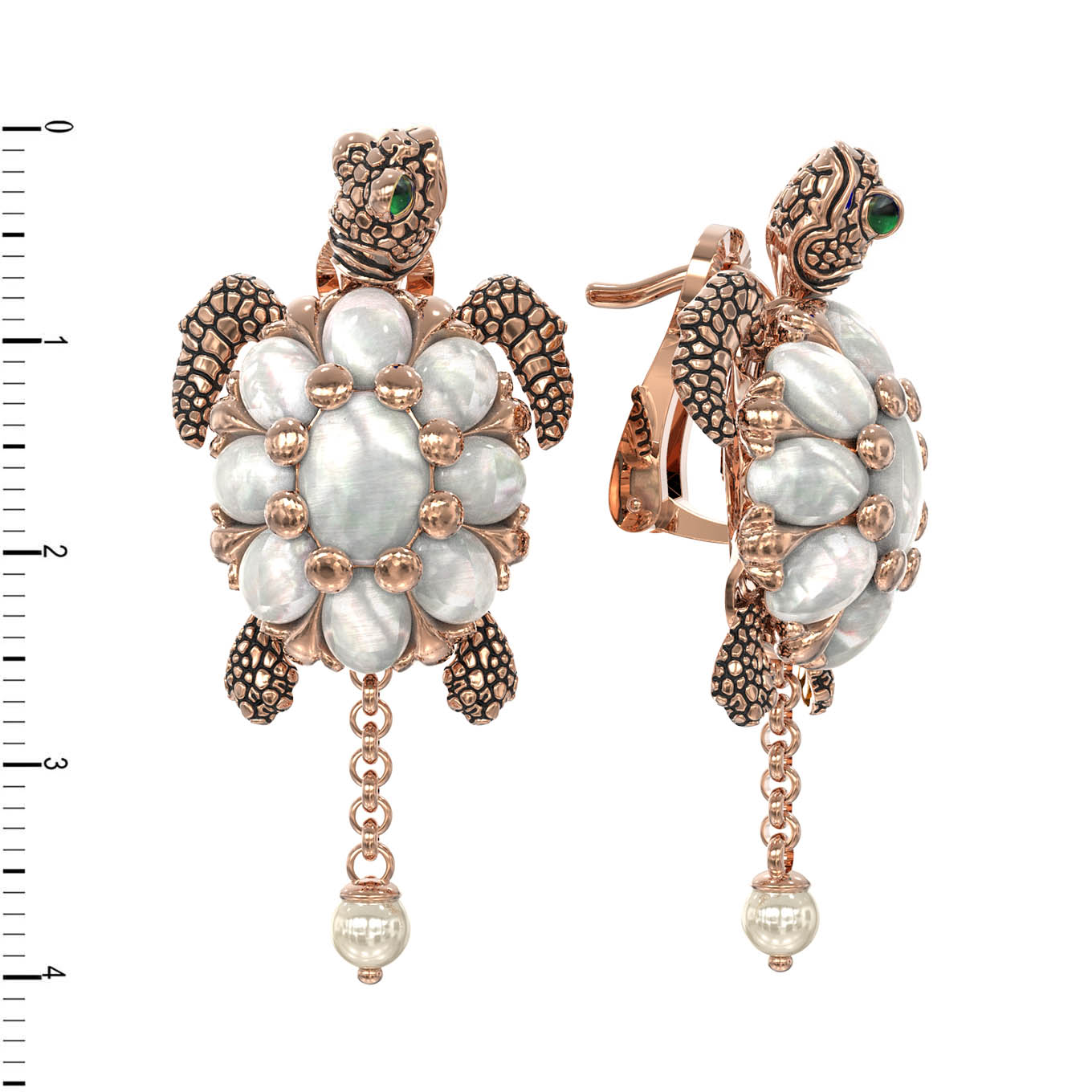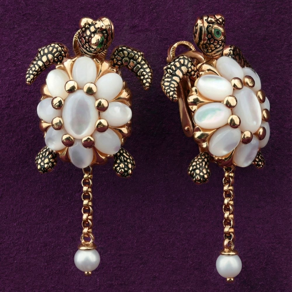 Эти роскошные серьги из коллекции De luxe Premium — Черепахи станут ярким акцентом вашего образа, демонстрируя утонченный вкус и внимание к деталям. Дизайн изделия выполнен в виде грациозных черепах, где основной корпус панциря украшен элегантными вставками из белого перламутра овальной и круглой формы. Контраст благородного красного золота 585 пробы и нежного сияния перламутра дополнен искусной эмалью, придающей деталям выразительность и глубину. Подвижный элемент в виде изящной цепочки, завершающейся жемчугом, добавляет изделию динамики и легкости.