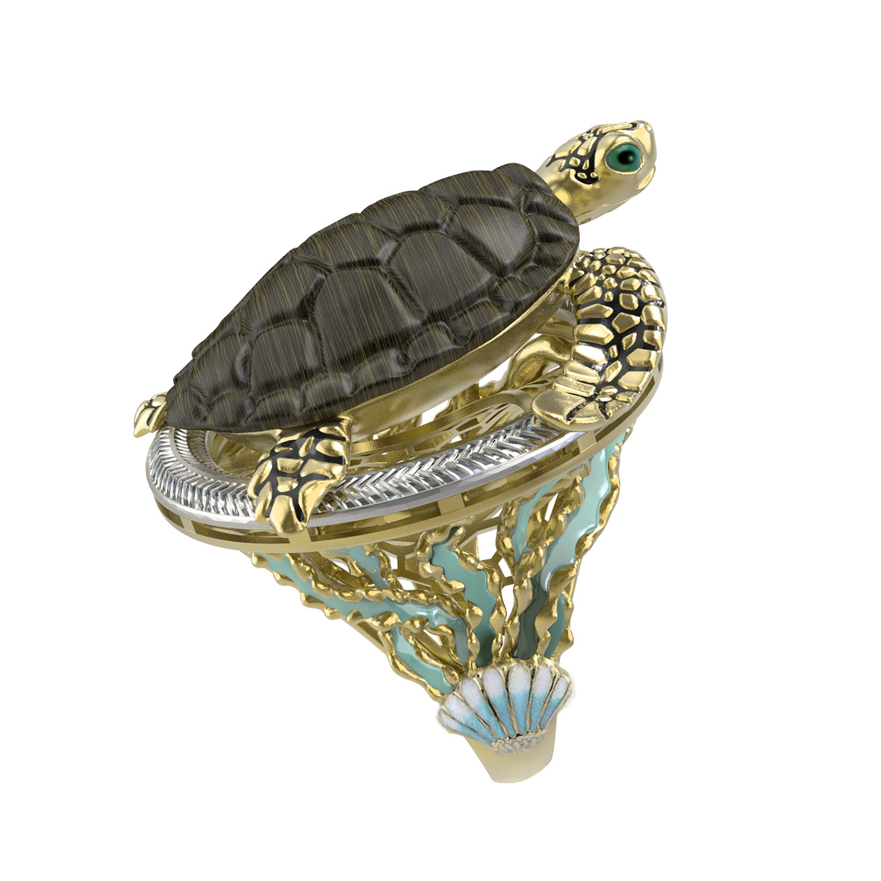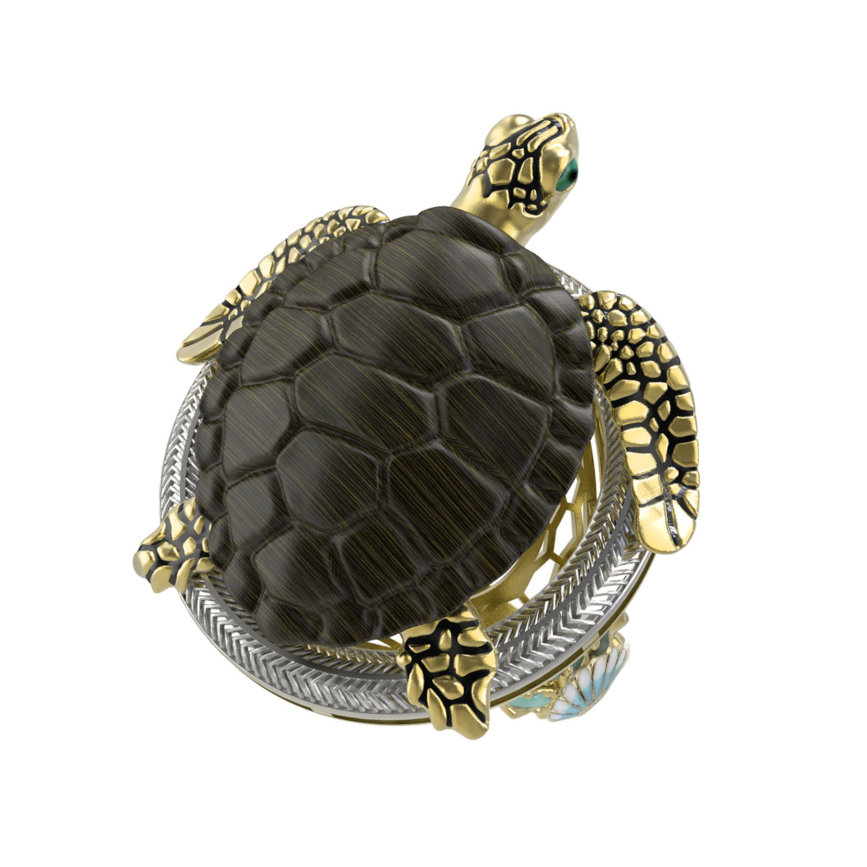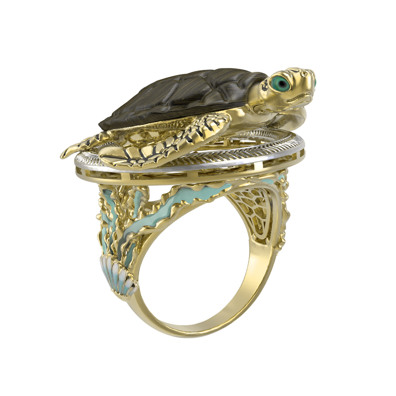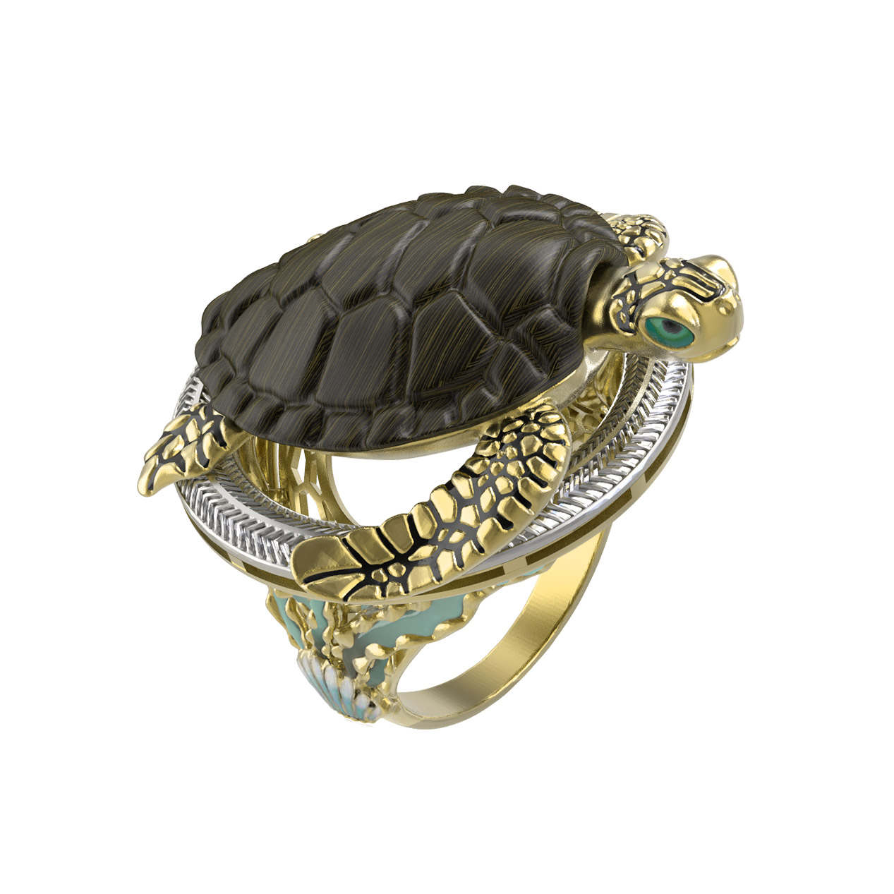 Кольцо из лимонного золота 585 пробы c эмалью и железным деревом