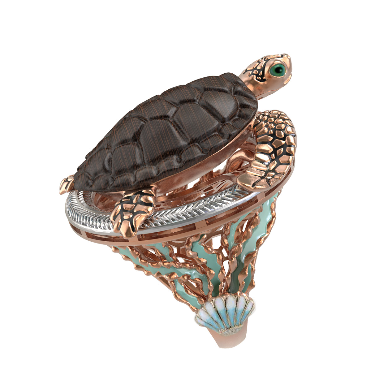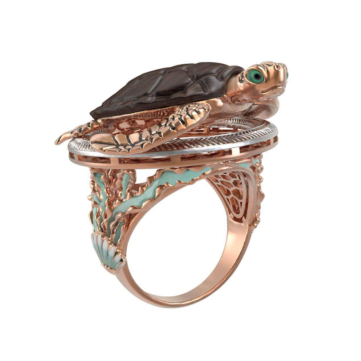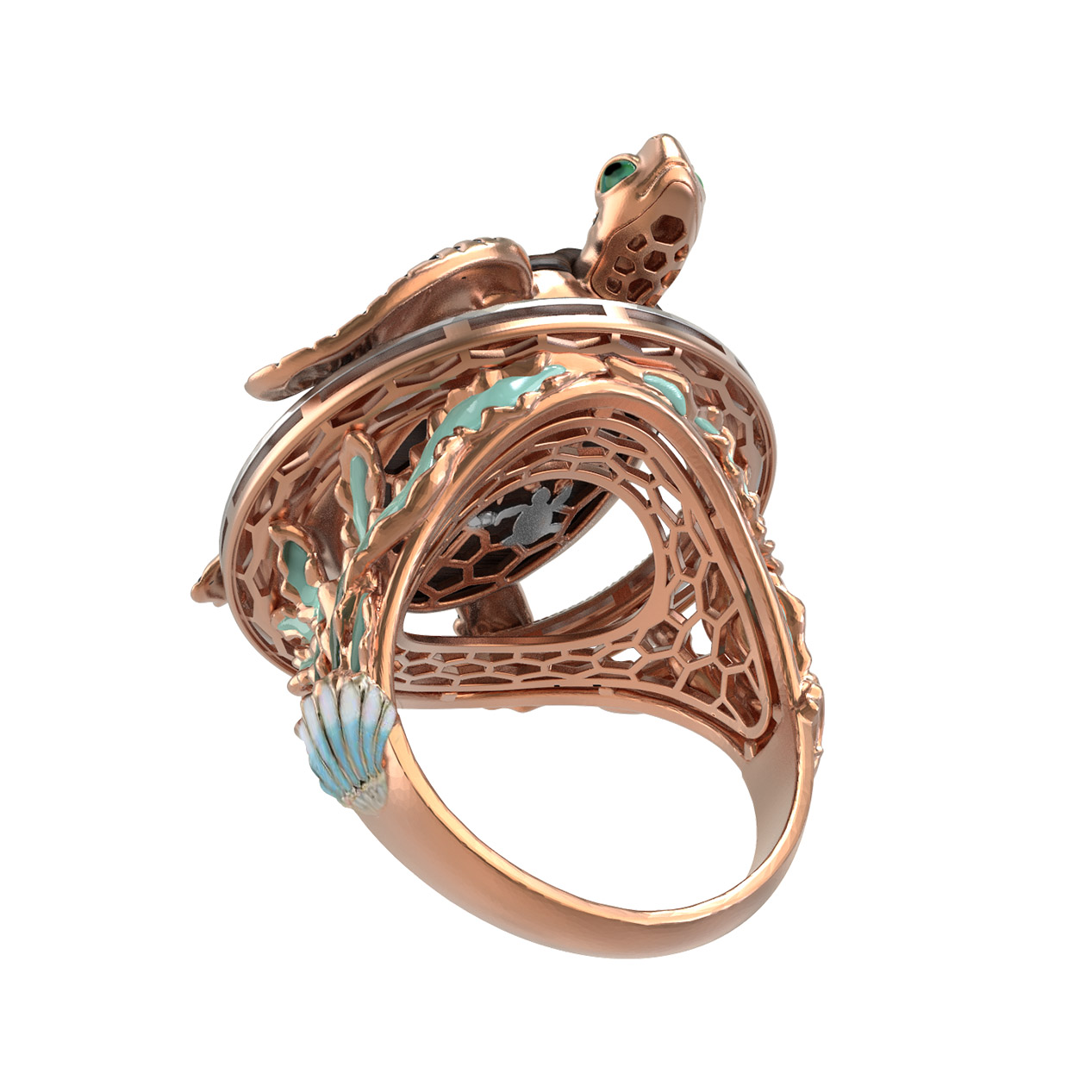Кольцо из красного золота 585 пробы c эмалью и железным деревом