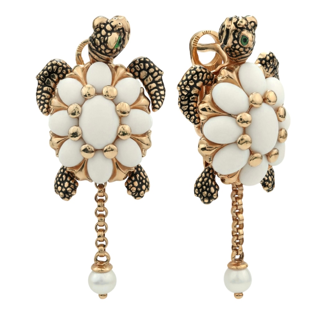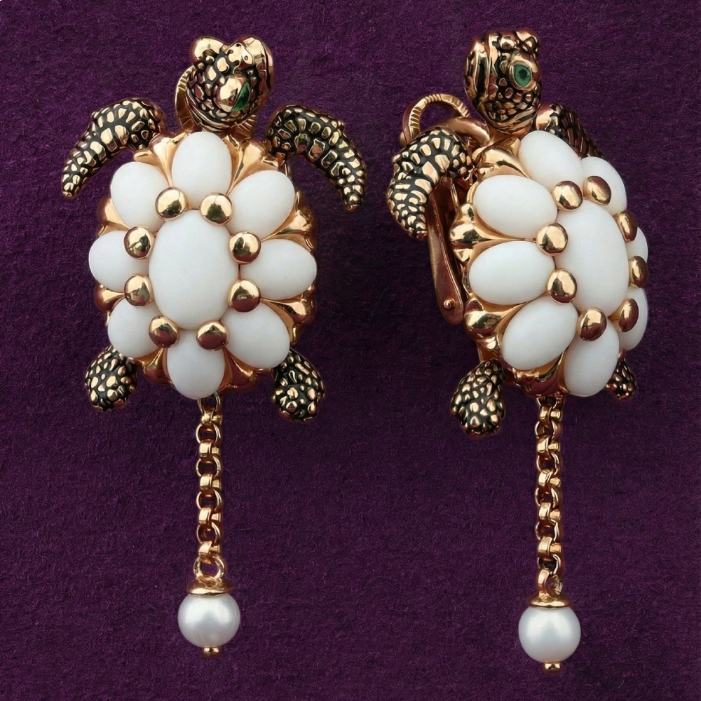 Особое внимание уделено деталям: голова и лапки черепах декорированы разноцветной эмалью, создающей контрастный и запоминающийся акцент. Изящная цепочка, спускающаяся от основного элемента, завершается нежной жемчужиной белого цвета. Всего в изделии использовано 2 основные вставки, гармонично сочетающиеся с благородным блеском красного золота. Такое украшение станет эффектным дополнением образа как для женщин, так и для мужчин, предпочитающих нестандартные и статусные аксессуары. Серьги из коллекции De luxe Premium — Черепахи могут стать основой для создания эксклюзивного ювелирного комплекта, подчеркивающего ваш индивидуальный стиль и безупречный вкус.