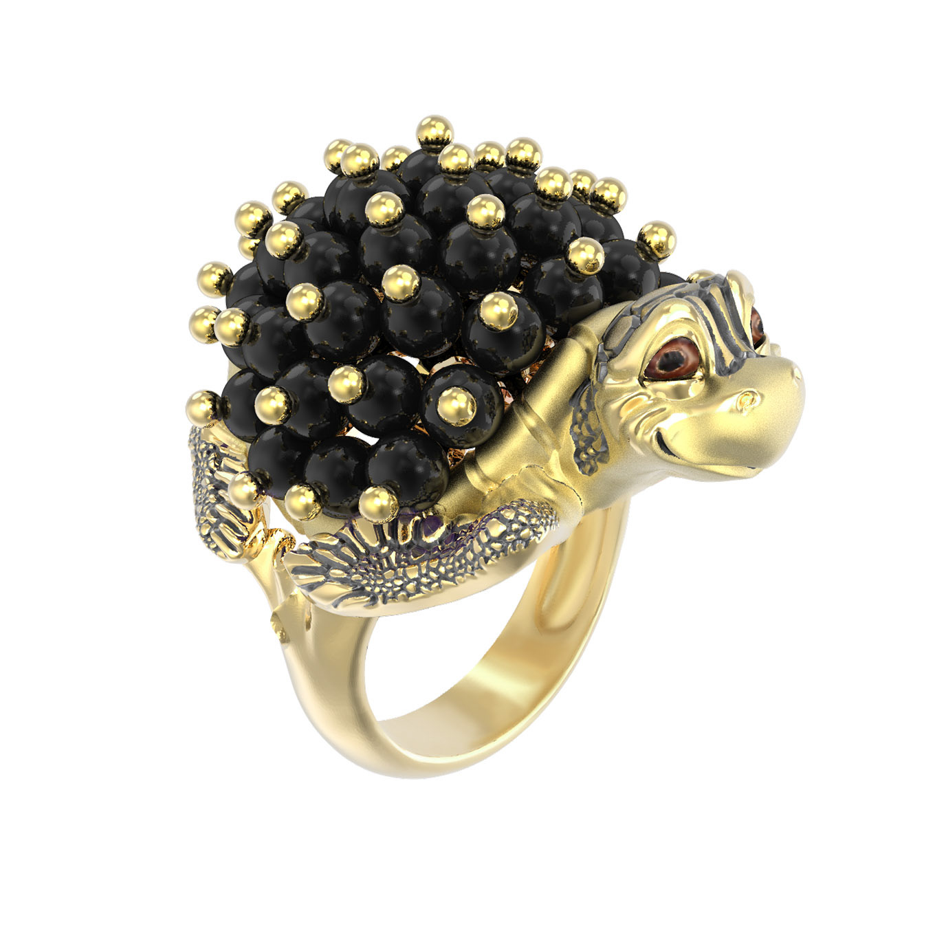 Центральным элементом композиции является панцирь черепахи, инкрустированный 61 вставкой в форме бусин. Сочетание черного оникса и разноцветной эмали создает выразительный контраст, подчеркивая благородный блеск лимонного золота. Такое сочетание материалов придает украшению динамику и глубину. Каждое кольцо продумано до мелочей: от текстуры кожи рептилии до выразительного взгляда, что делает его настоящим произведением ювелирного искусства.