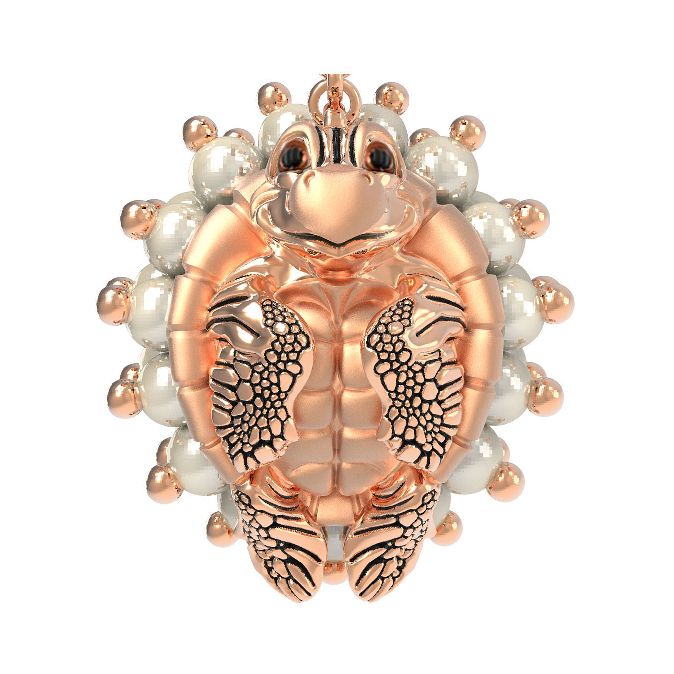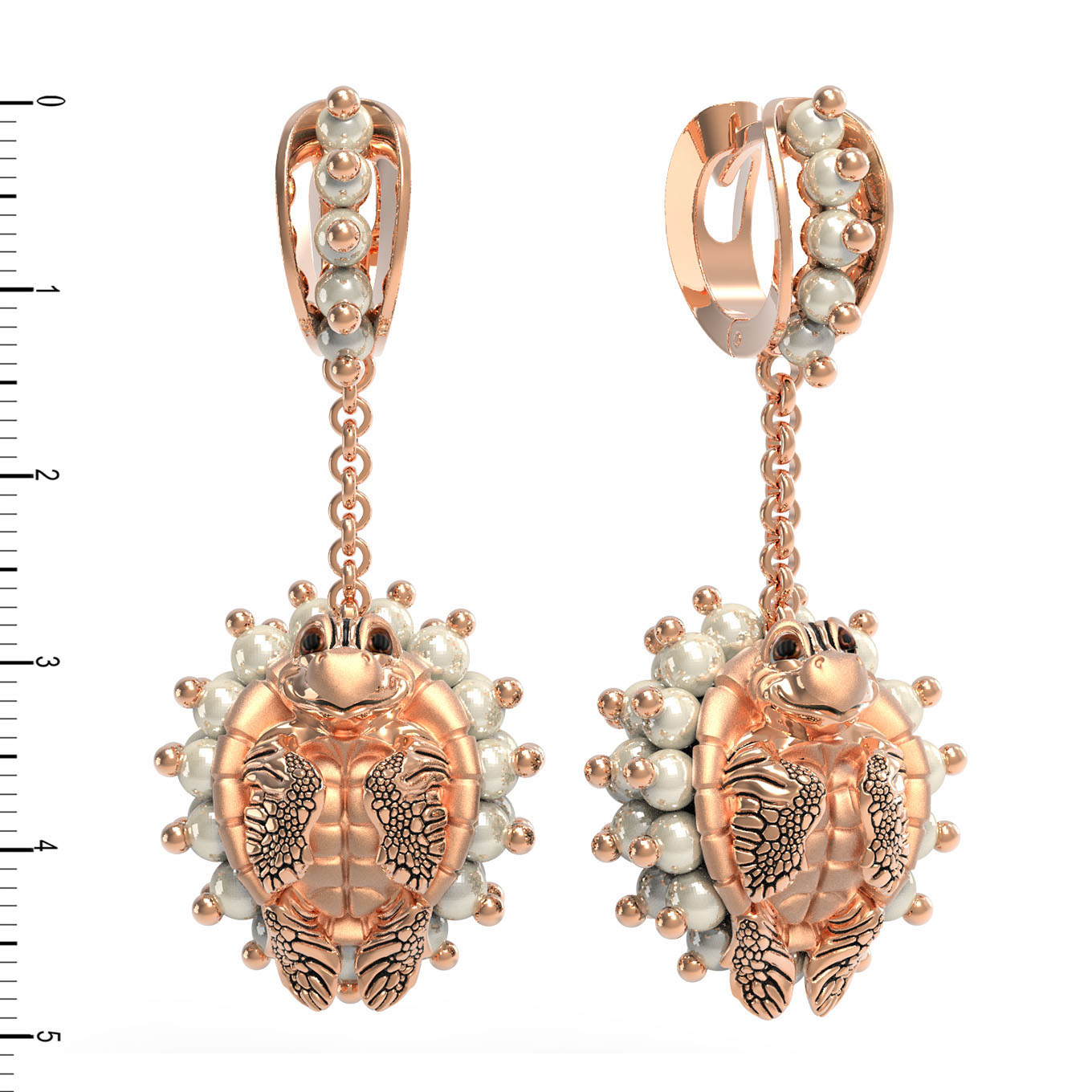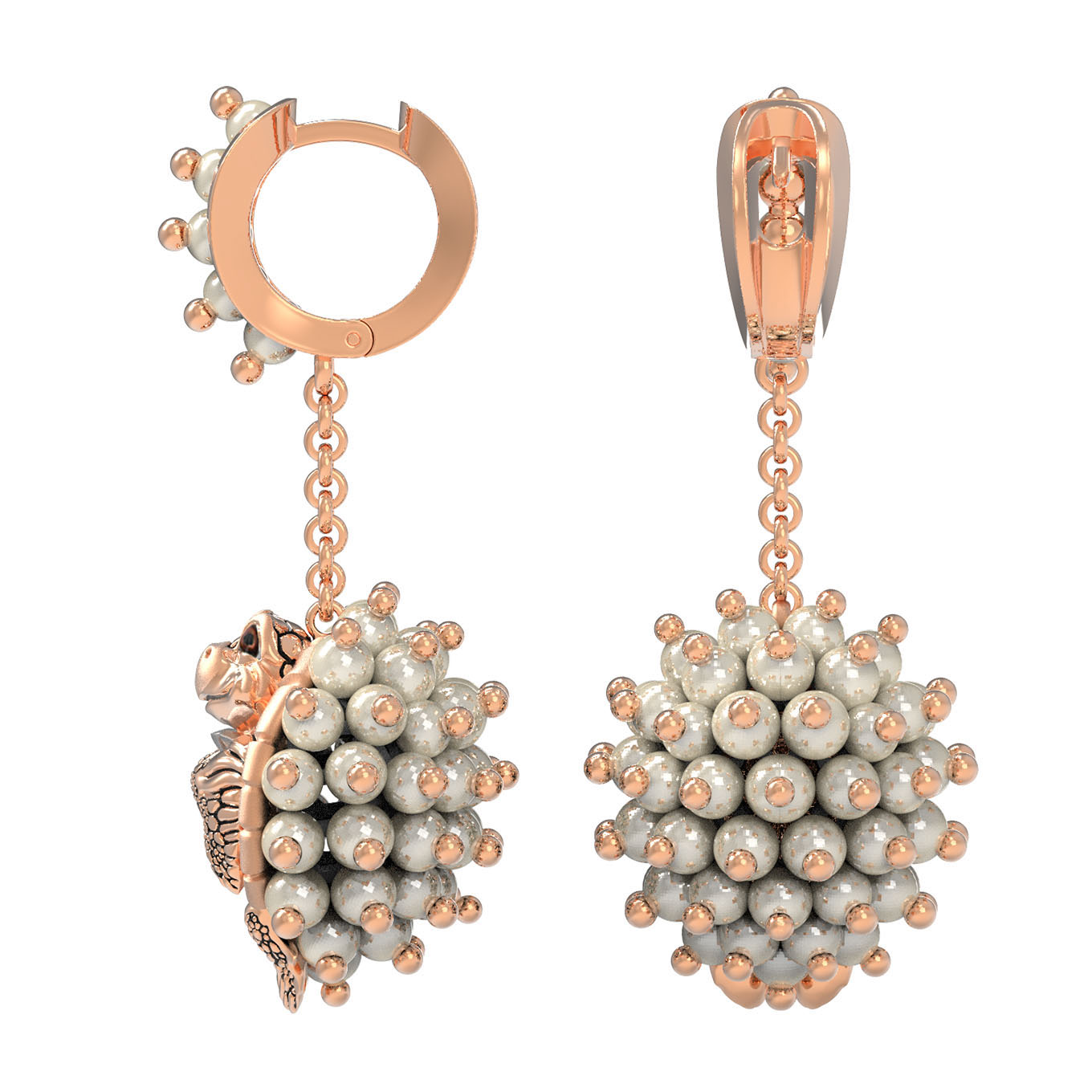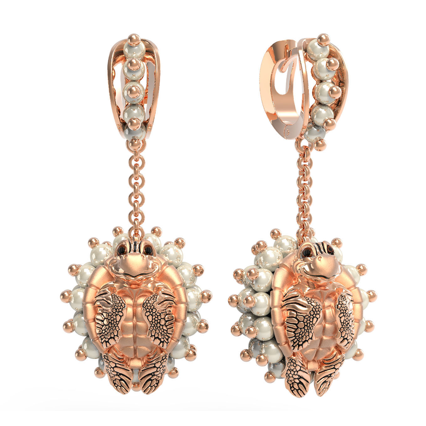 Серьги инкрустированы 98 вставками: благородным жемчугом белого цвета и эффектной эмалью, придающей изделию особую глубину и разноцветный оттенок. Круглая форма вставок гармонично сочетается с фигурным силуэтом золотых черепах, создавая динамичный и живой образ. Теплый блеск красного золота идеально дополняет сияние жемчужин, делая украшение статусным и запоминающимся.