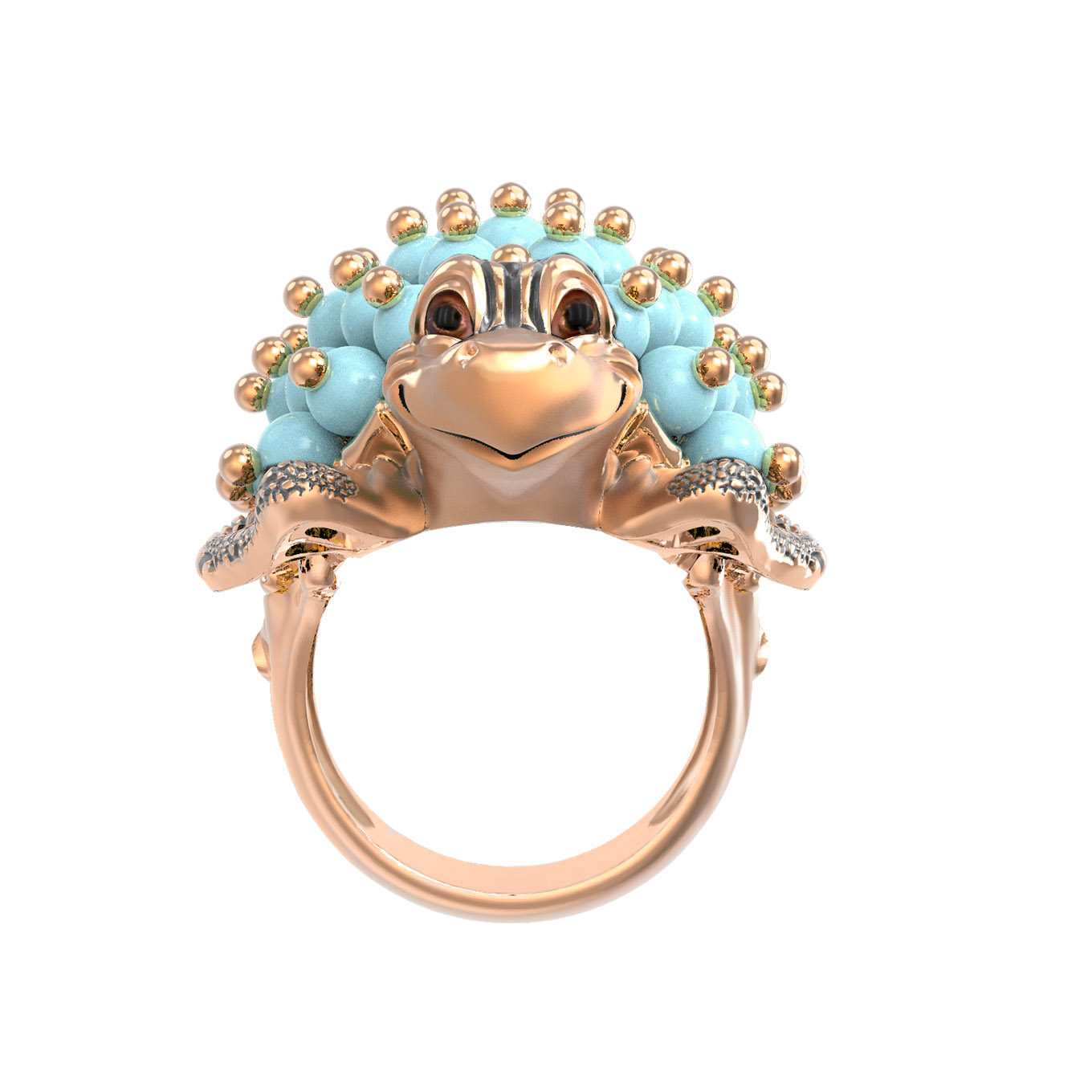 Центральным элементом украшения выступает роскошная инкрустация, состоящая из 61 вставки. Использованные бусины из бирюзы синего цвета создают эффектный контраст с благородным теплым оттенком красного золота. Яркий и выразительный декор дополнен элементами из эмали, которые подчеркивают индивидуальность и стиль изделия. Ювелиры уделили особое внимание фактуре, превратив драгоценный металл в маленькую скульптуру, где панцирь черепахи эффектно имитирует природный рельеф.