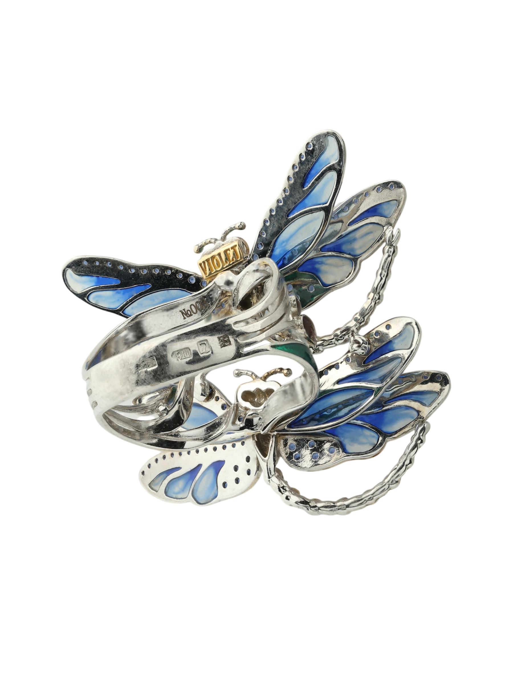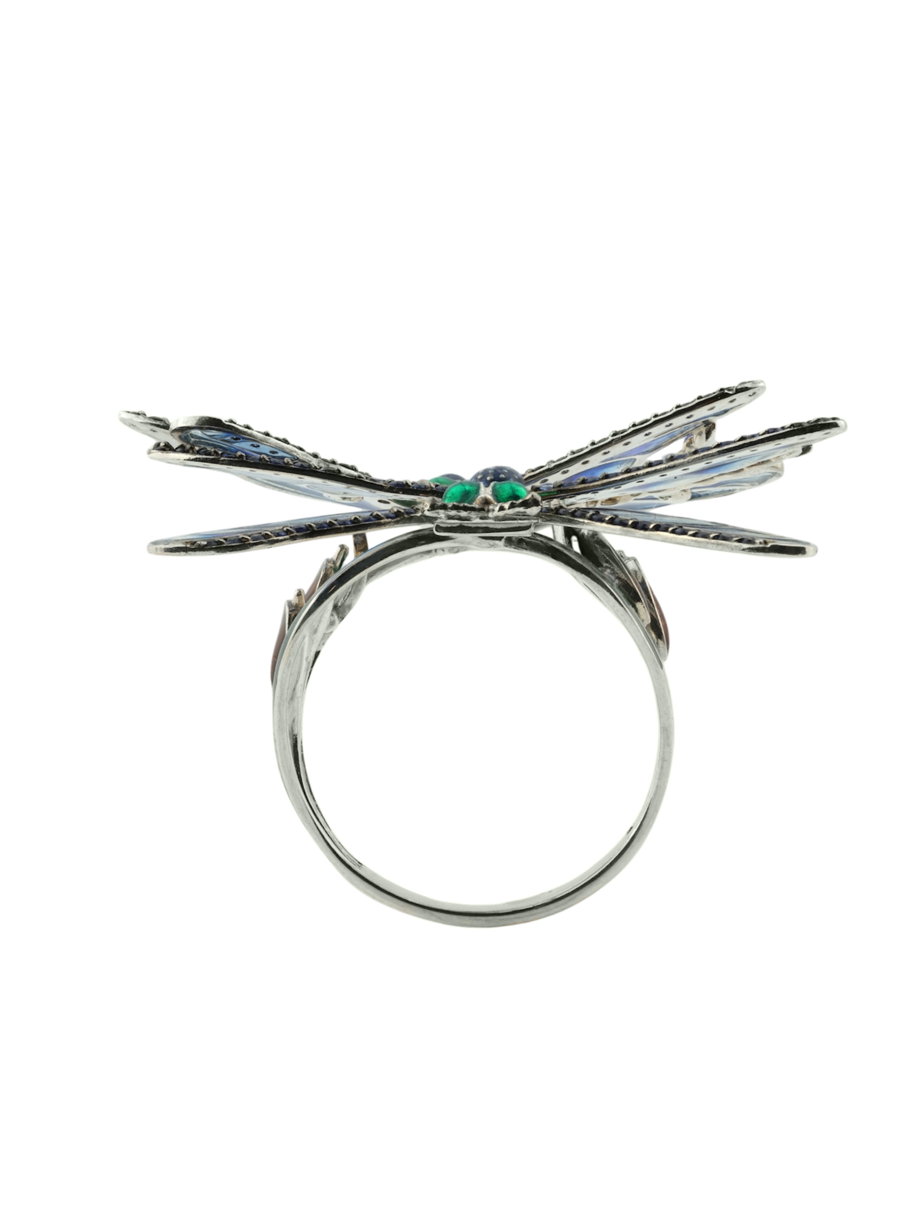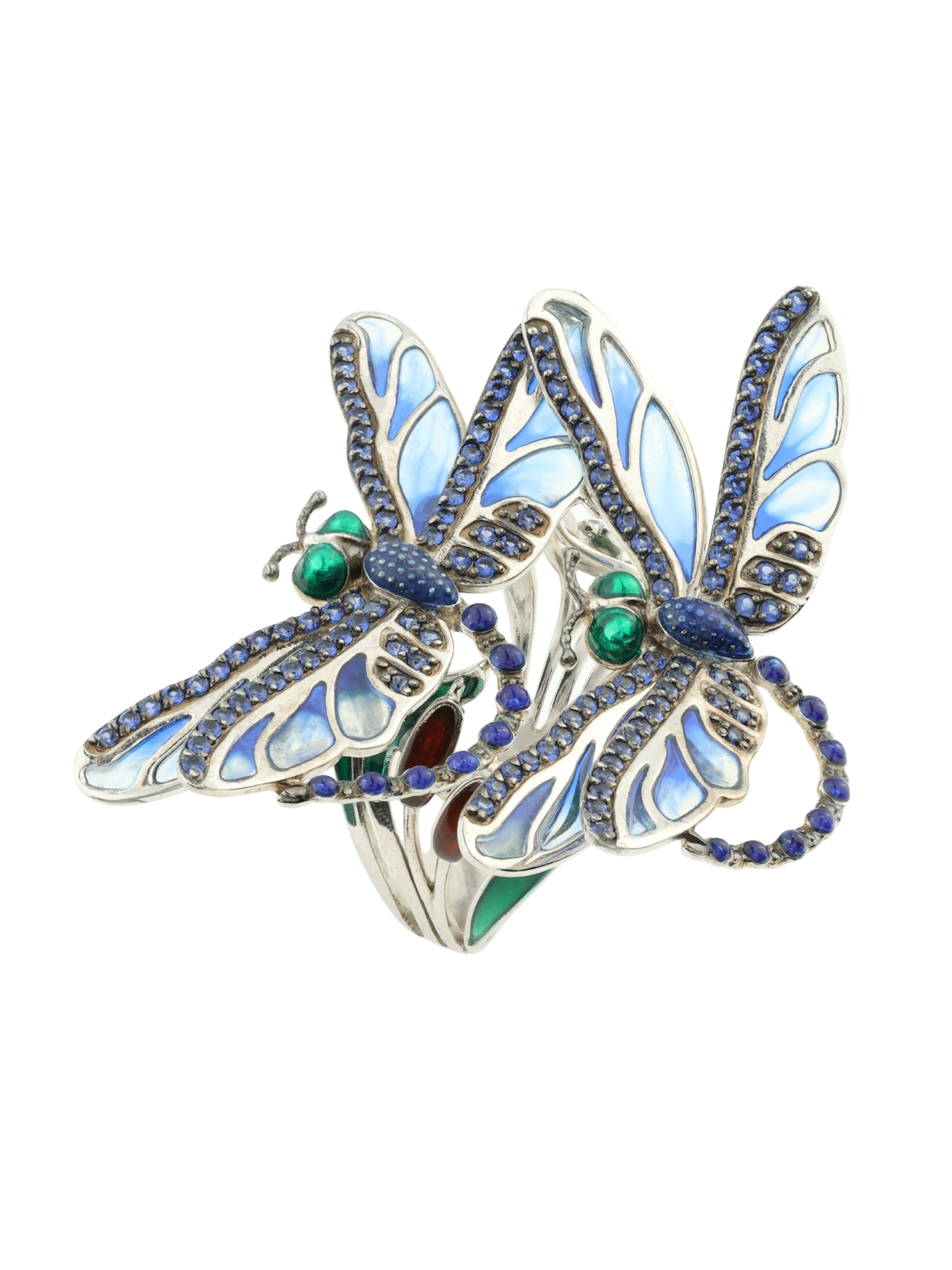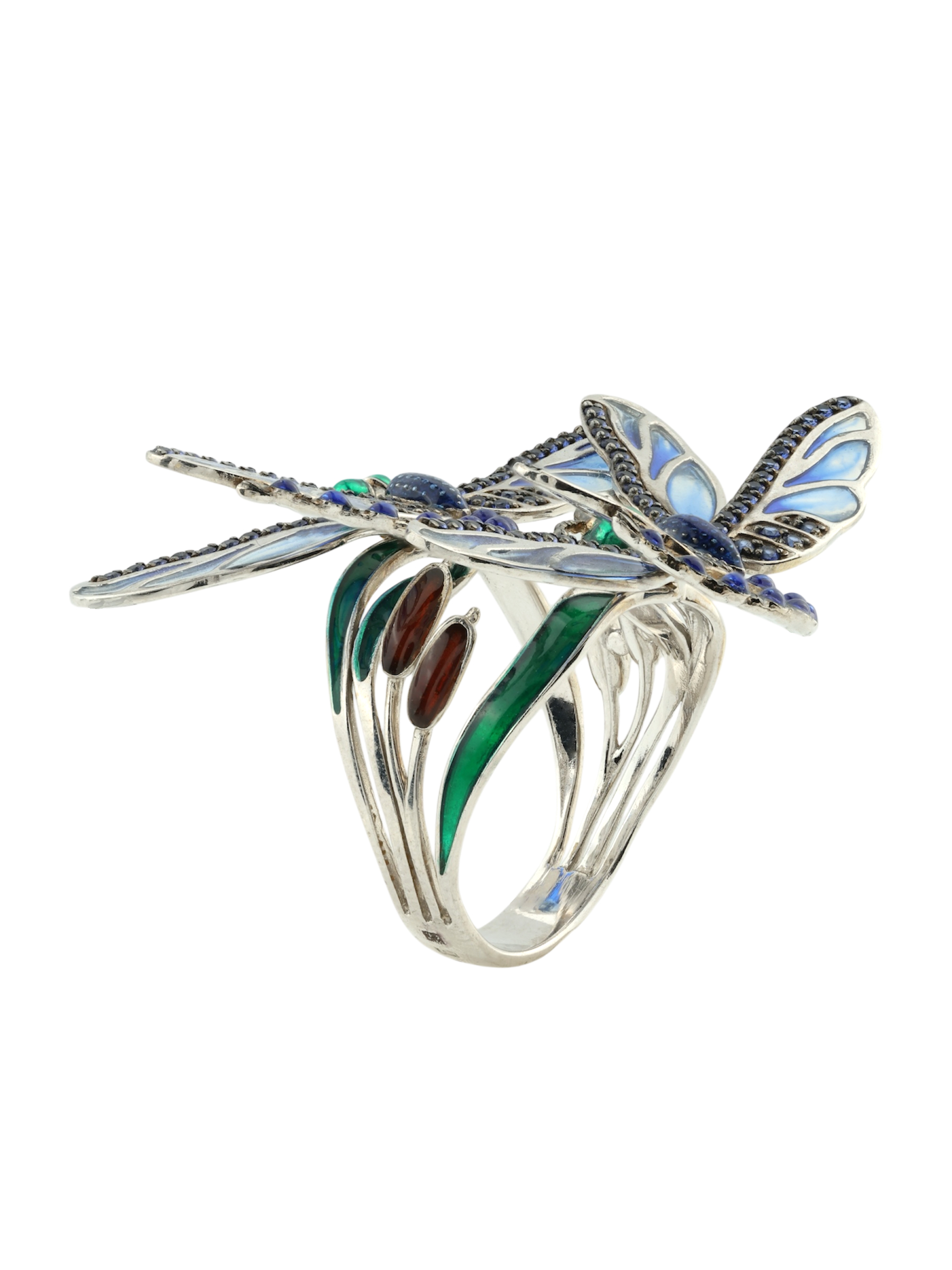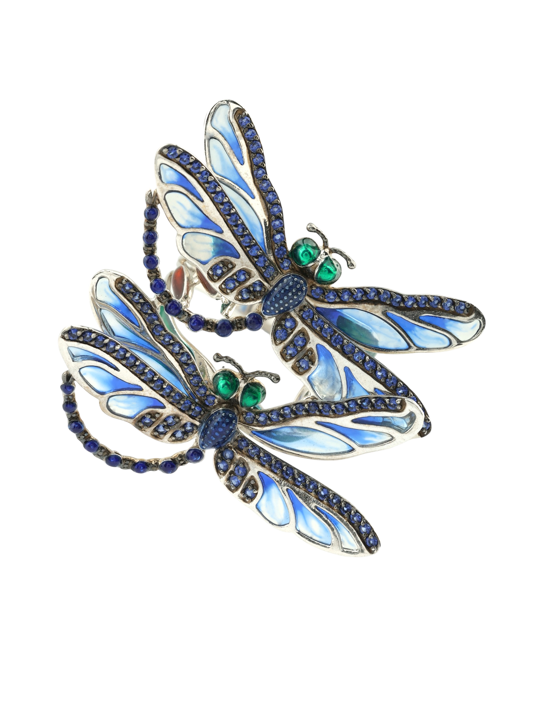 Роскошное кольцо из коллекции De luxe Premium — Стрекозы станет воплощением вашего безупречного вкуса и любви к оригинальным украшениям. Изделие выполнено из благородного белого золота 585 пробы, которое идеально подчеркивает холодный блеск драгоценных камней. Утонченный дизайн в виде насекомых привлекает внимание своей детализацией и художественным исполнением. Основным акцентом композиции выступает искусная ювелирная эмаль, переливающаяся глубокими оттенками, и 120 сверкающих сапфиров круглой формы.
