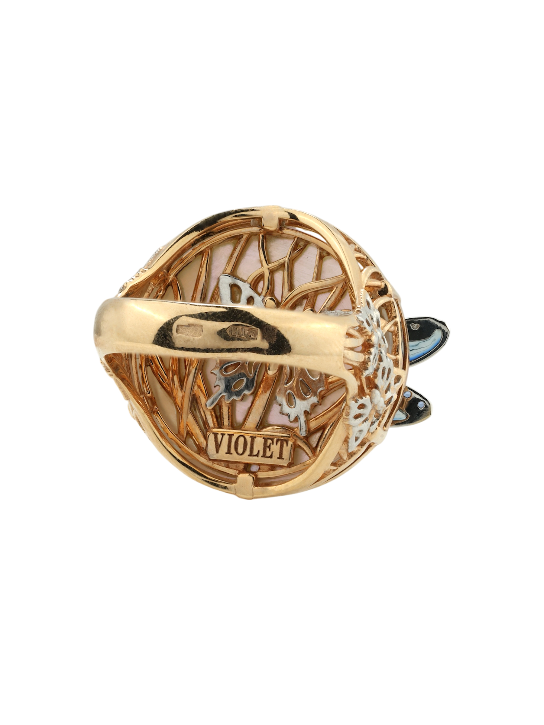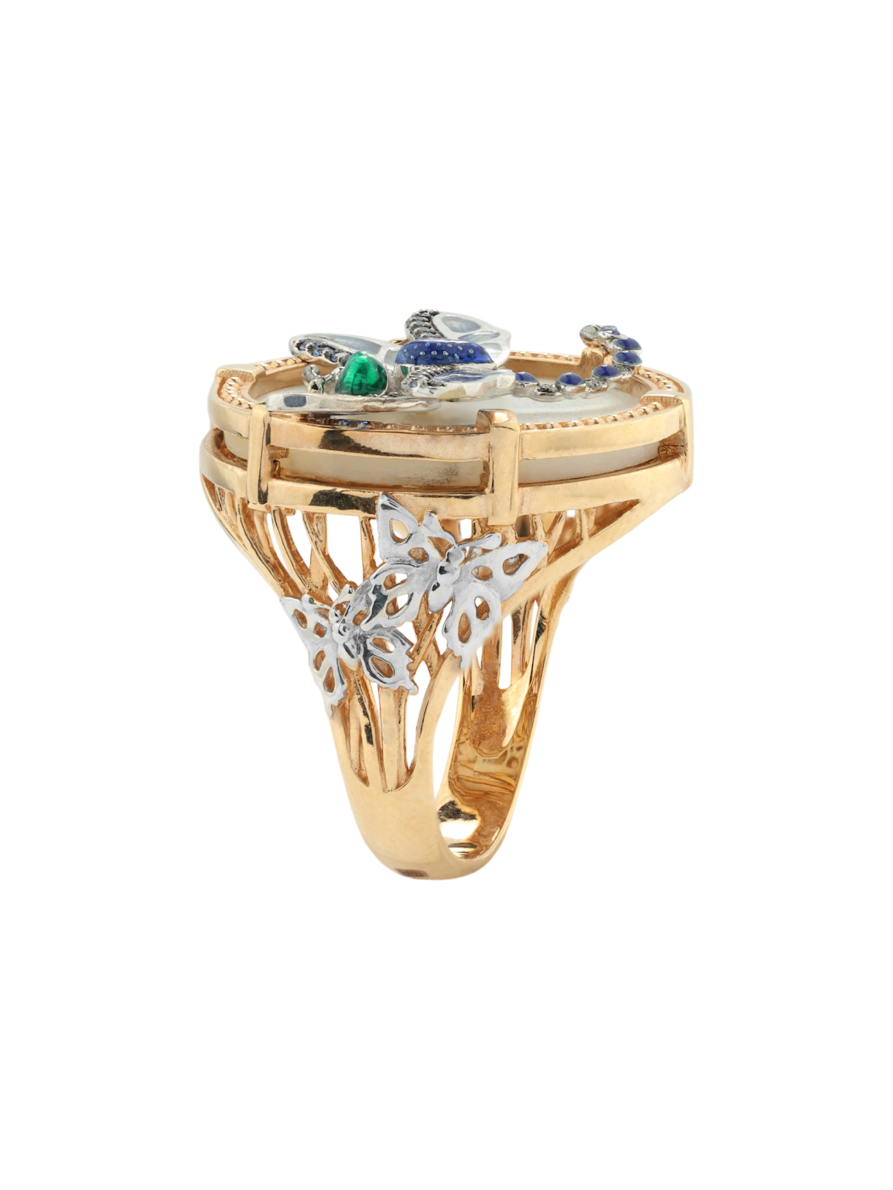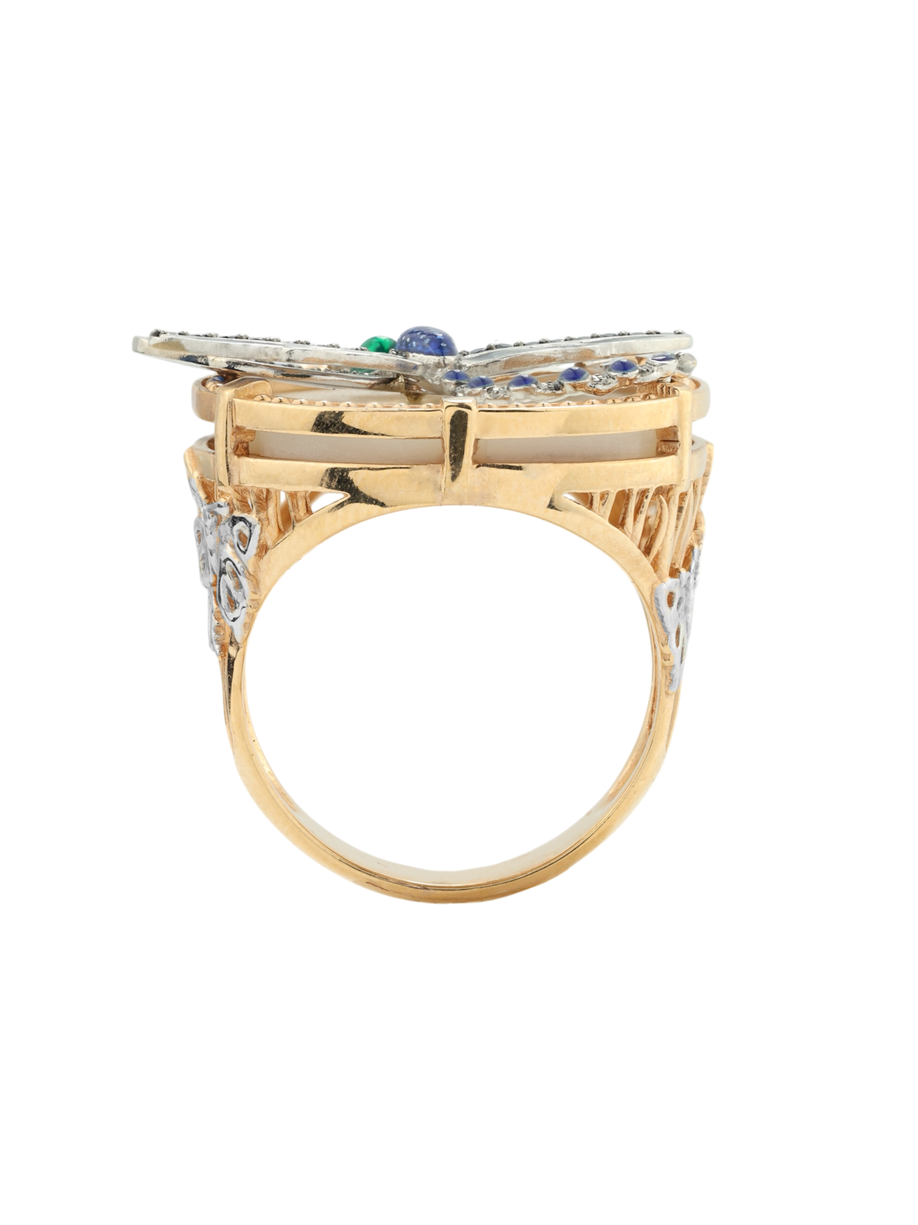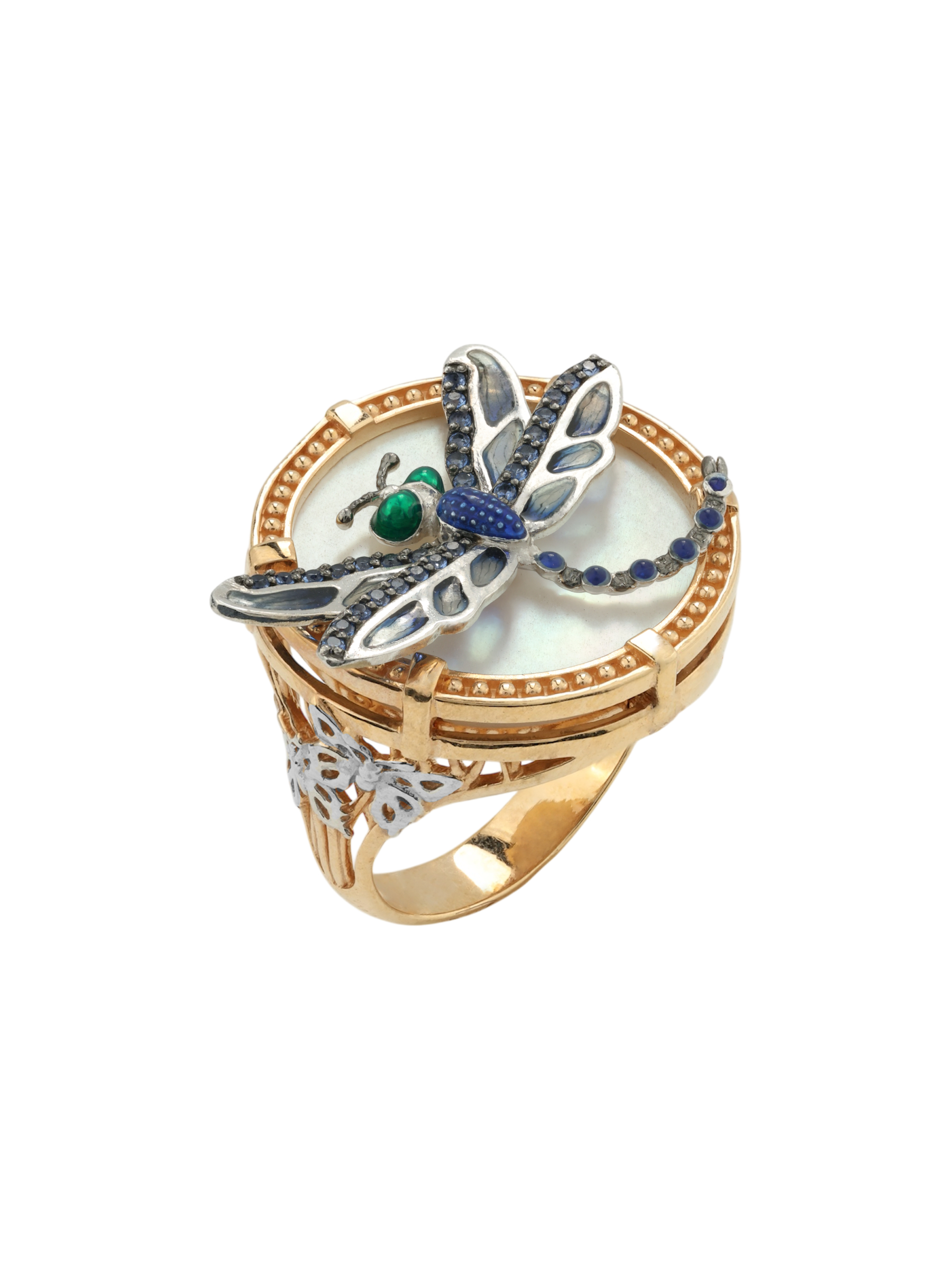 Кольцо из золота c сапфиром, эмалью и перламутром