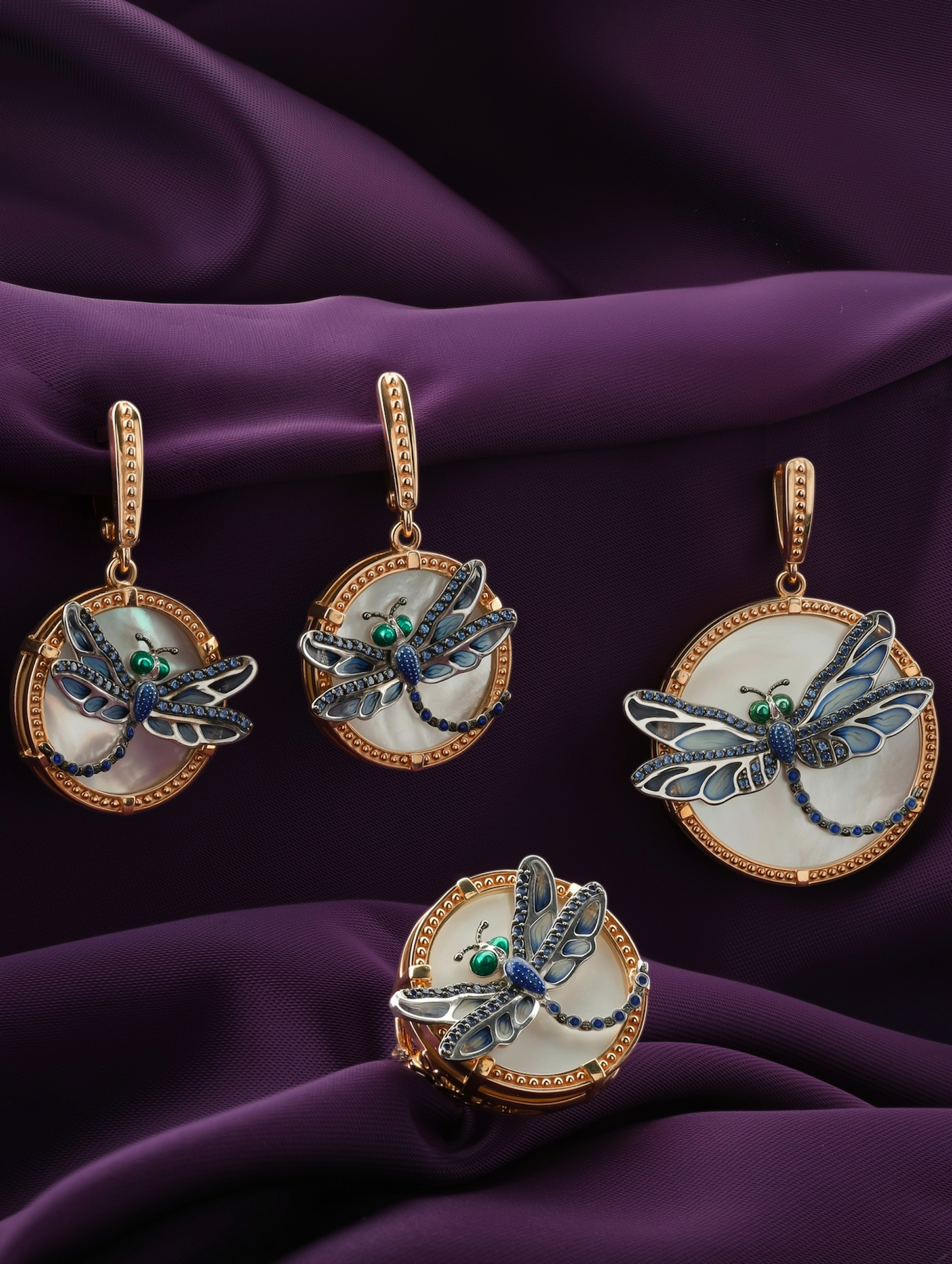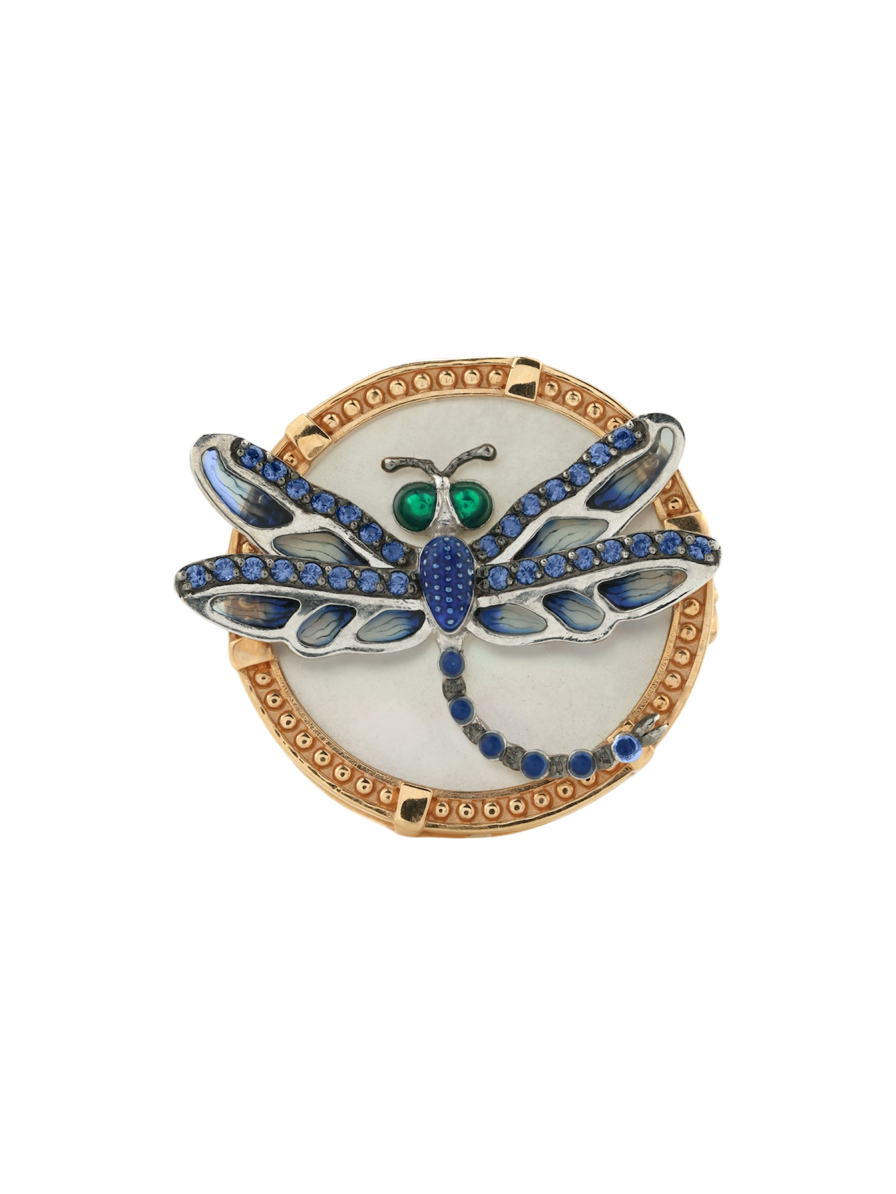 Декоративная композиция украшена 30 вставками круглой формы. Сияние синих сапфиров в сочетании с элементами цветной эмали создает динамичный и выразительный образ. Каждая деталь подчеркивает мастерство исполнения, а контраст между золотой основой и перламутром придает украшению особую глубину. Это кольцо подходит как для женщин, так и для мужчин, предпочитающих статусные и необычные аксессуары.