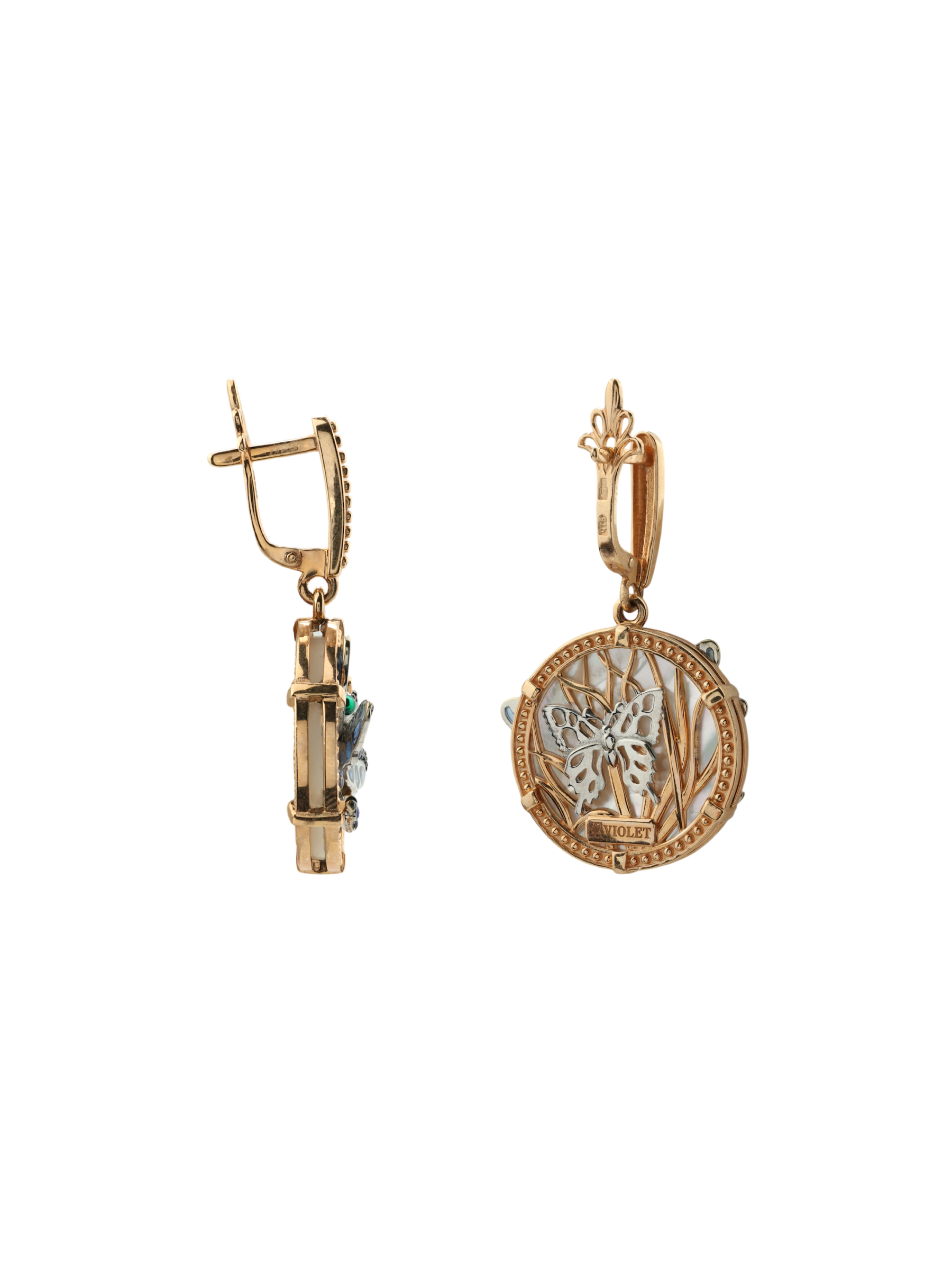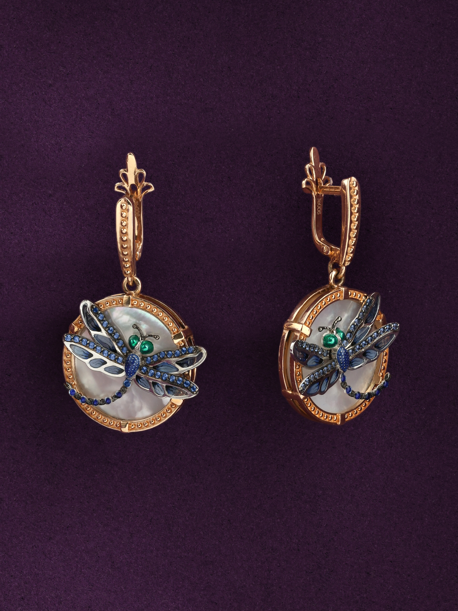 Серьги из золота c сапфиром, эмалью и перламутром