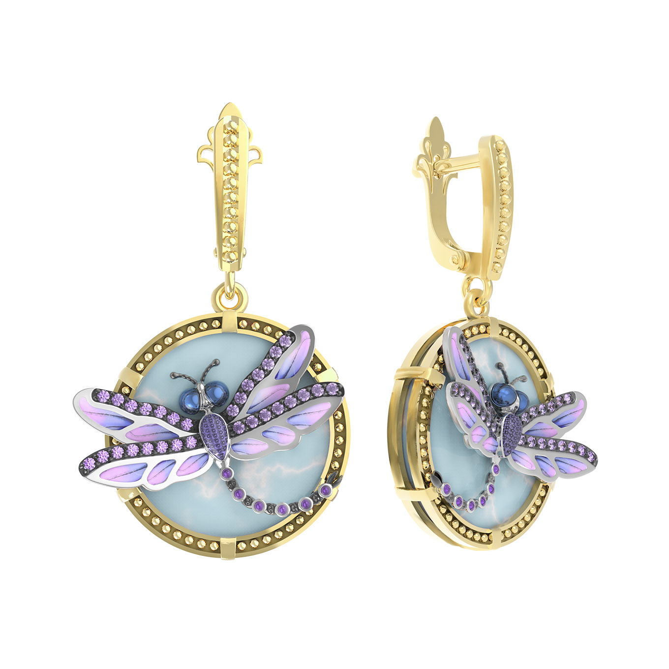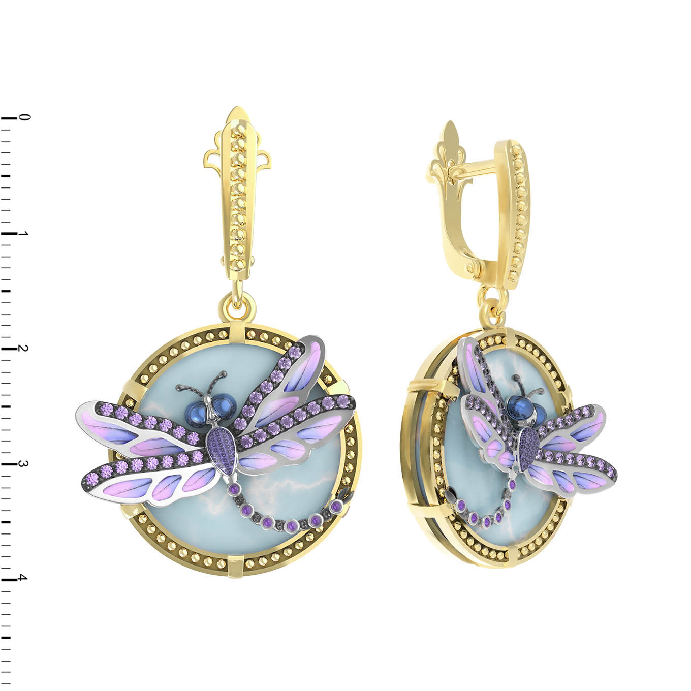 Серьги из лимонного золота c бирюзой, аметистом и эмалью