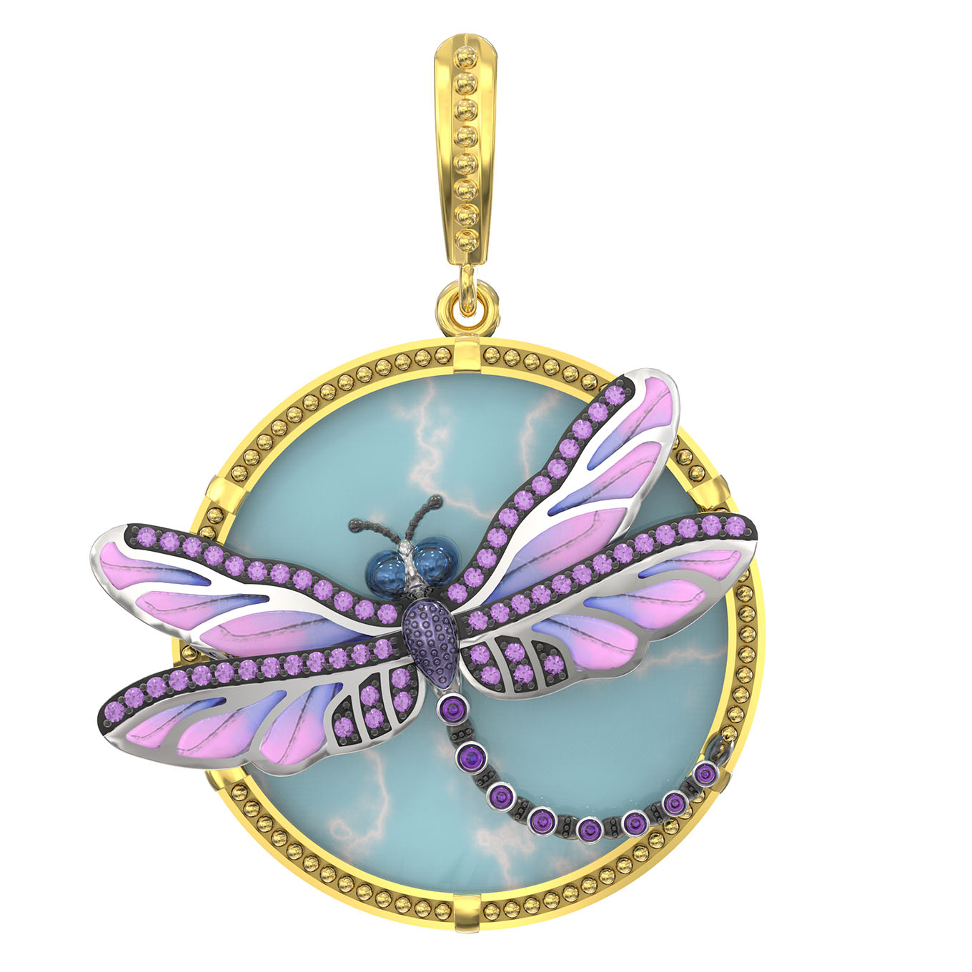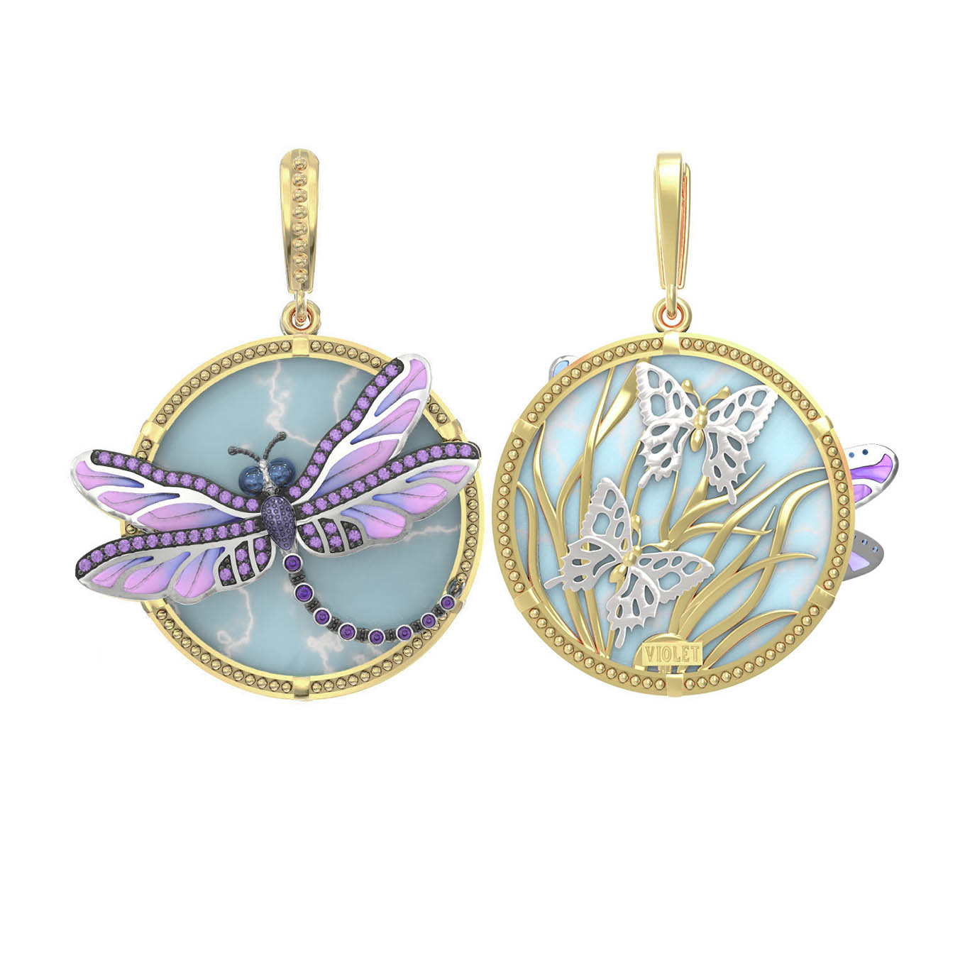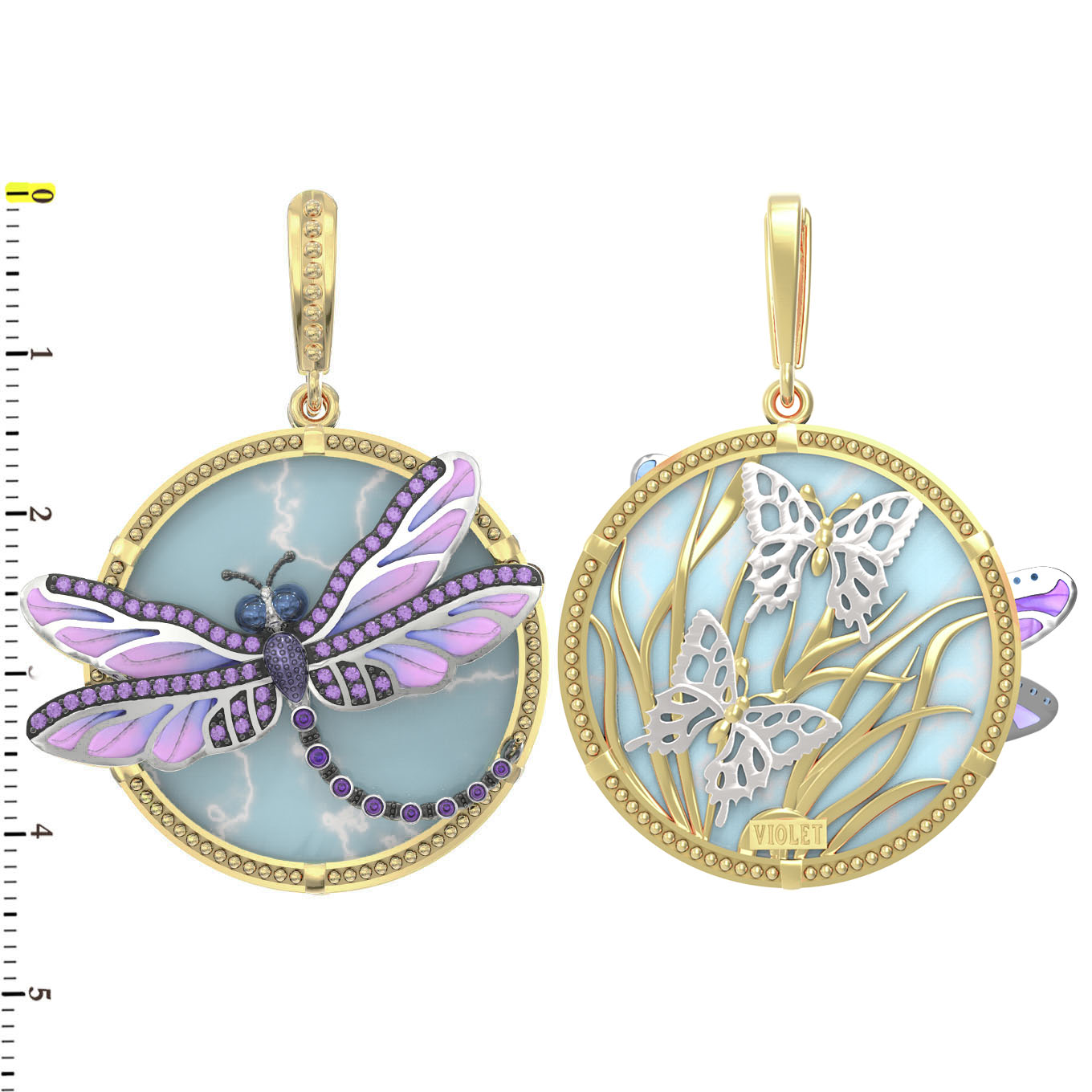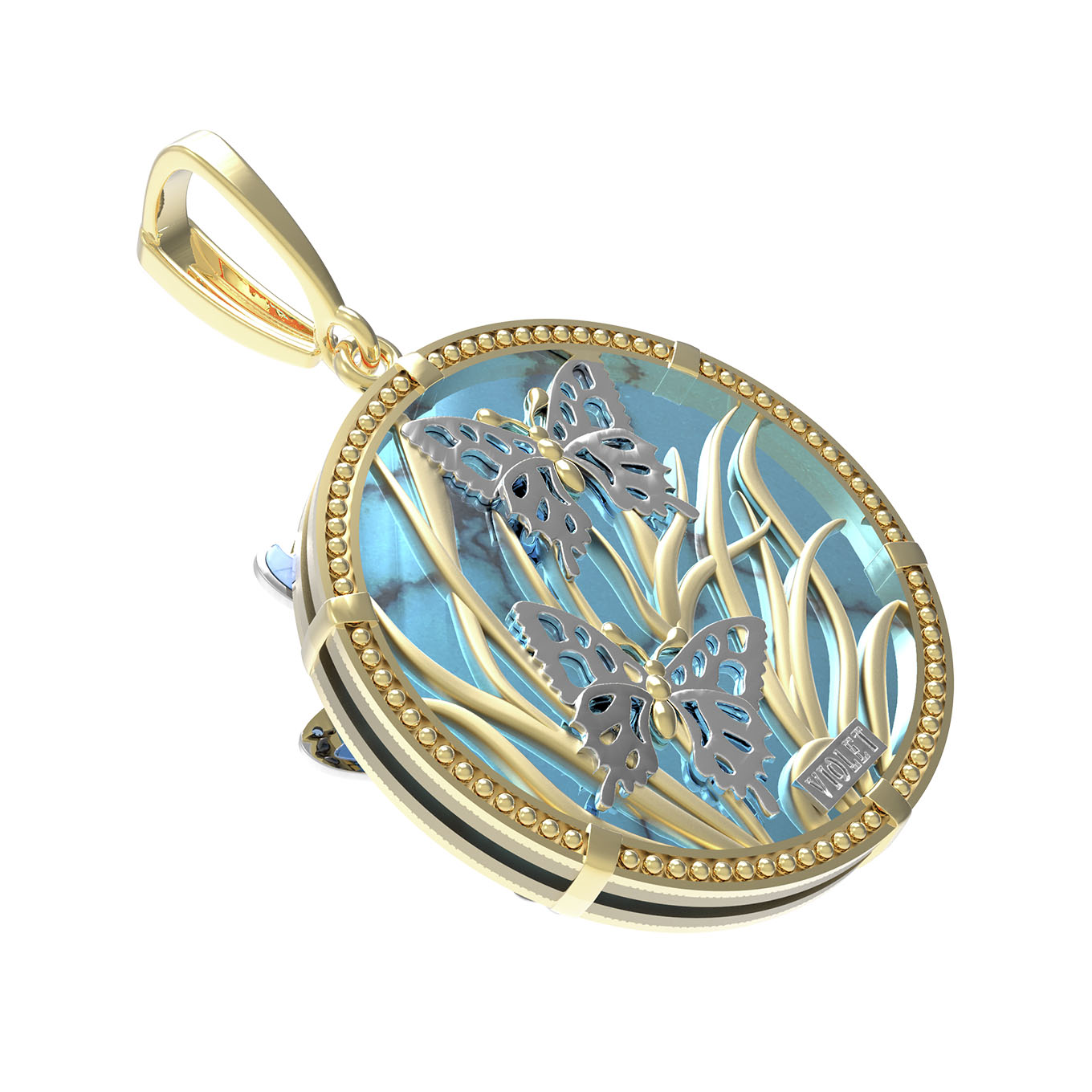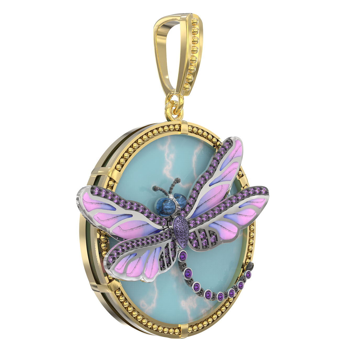 Подвеска из лимонного золота 585 пробы c бирюзой, аметистом и эмалью