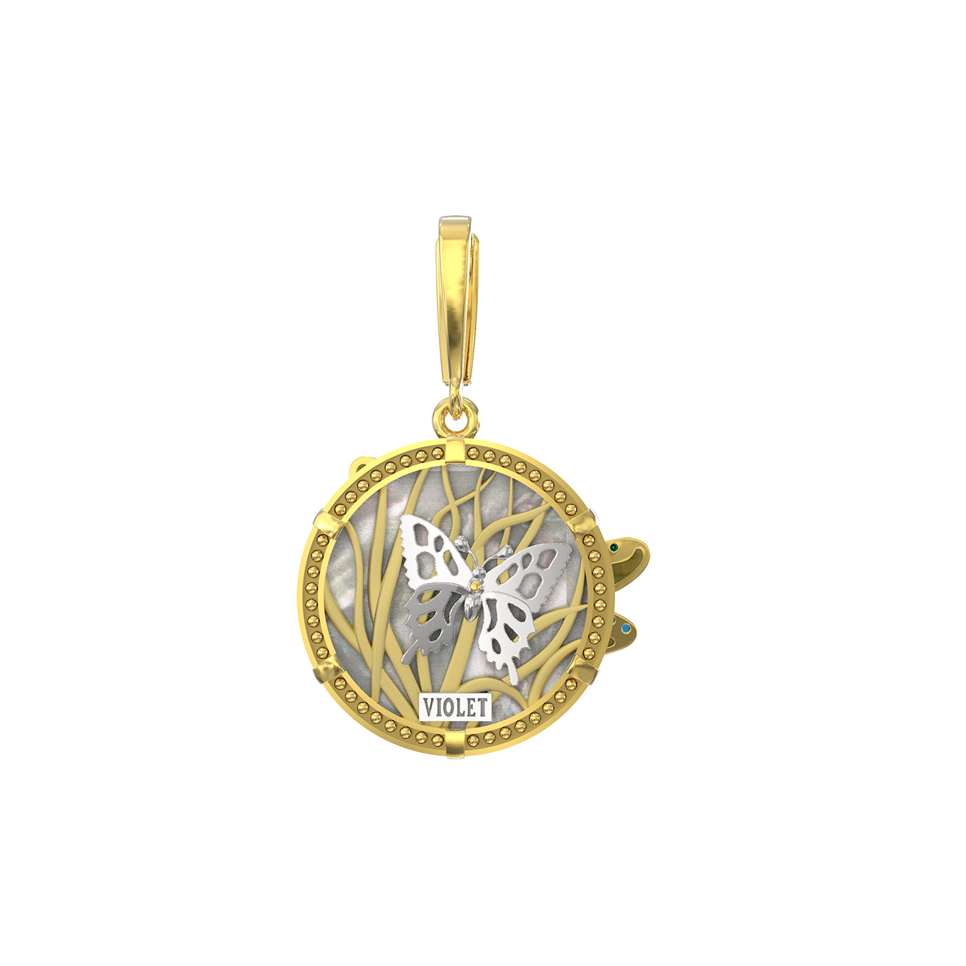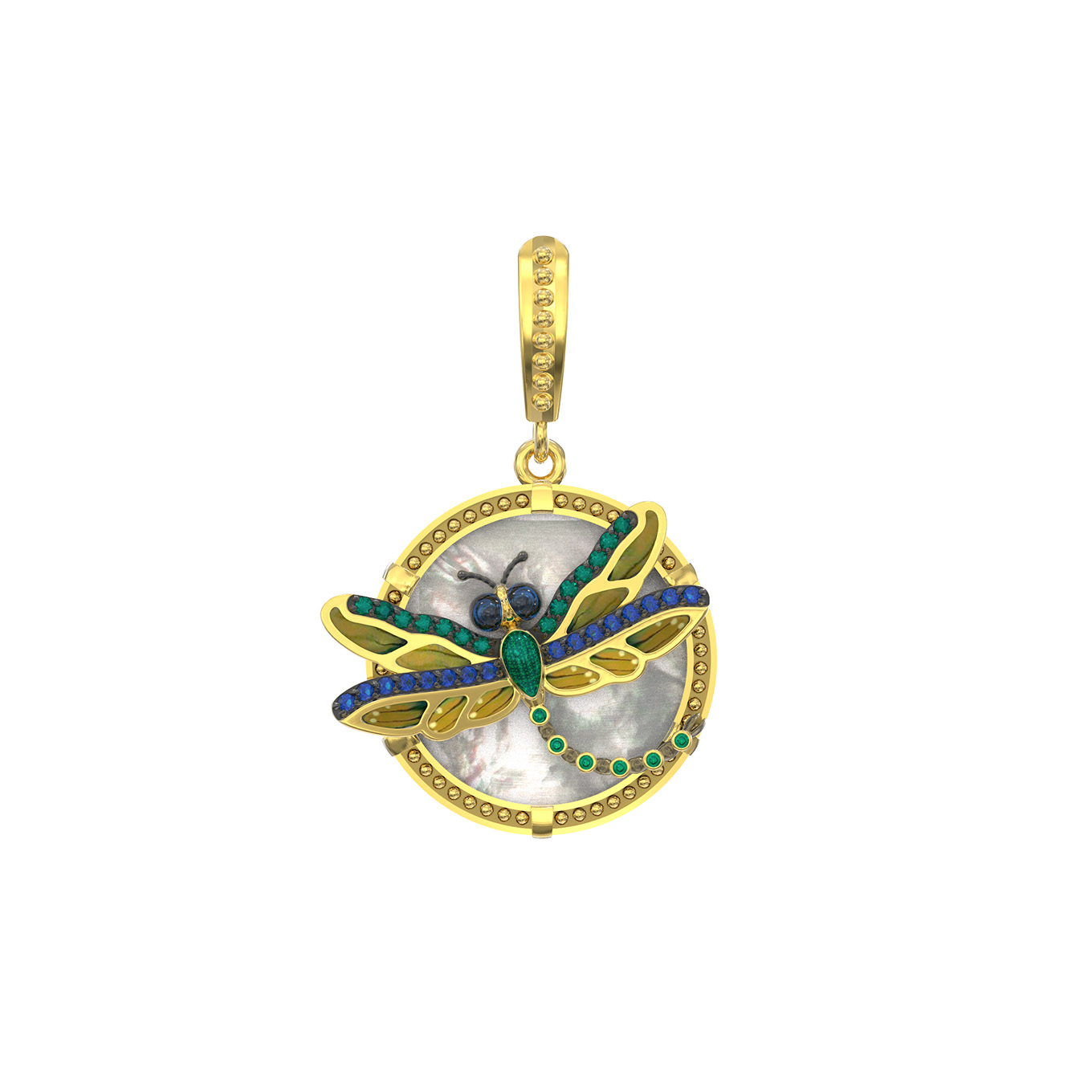 Подвеска из лимонного золота 585 пробы c сапфиром, изумрудом, эмалью и перламутром