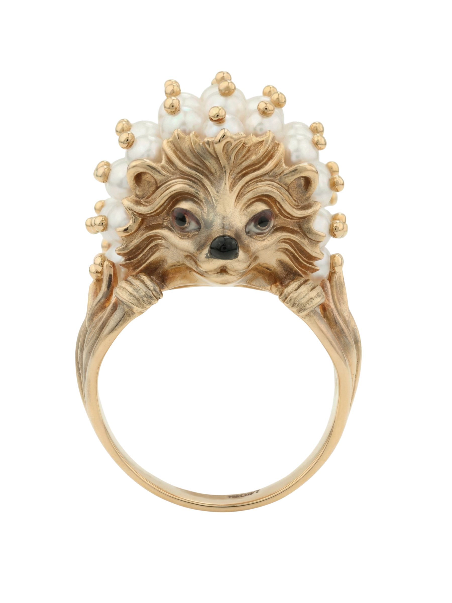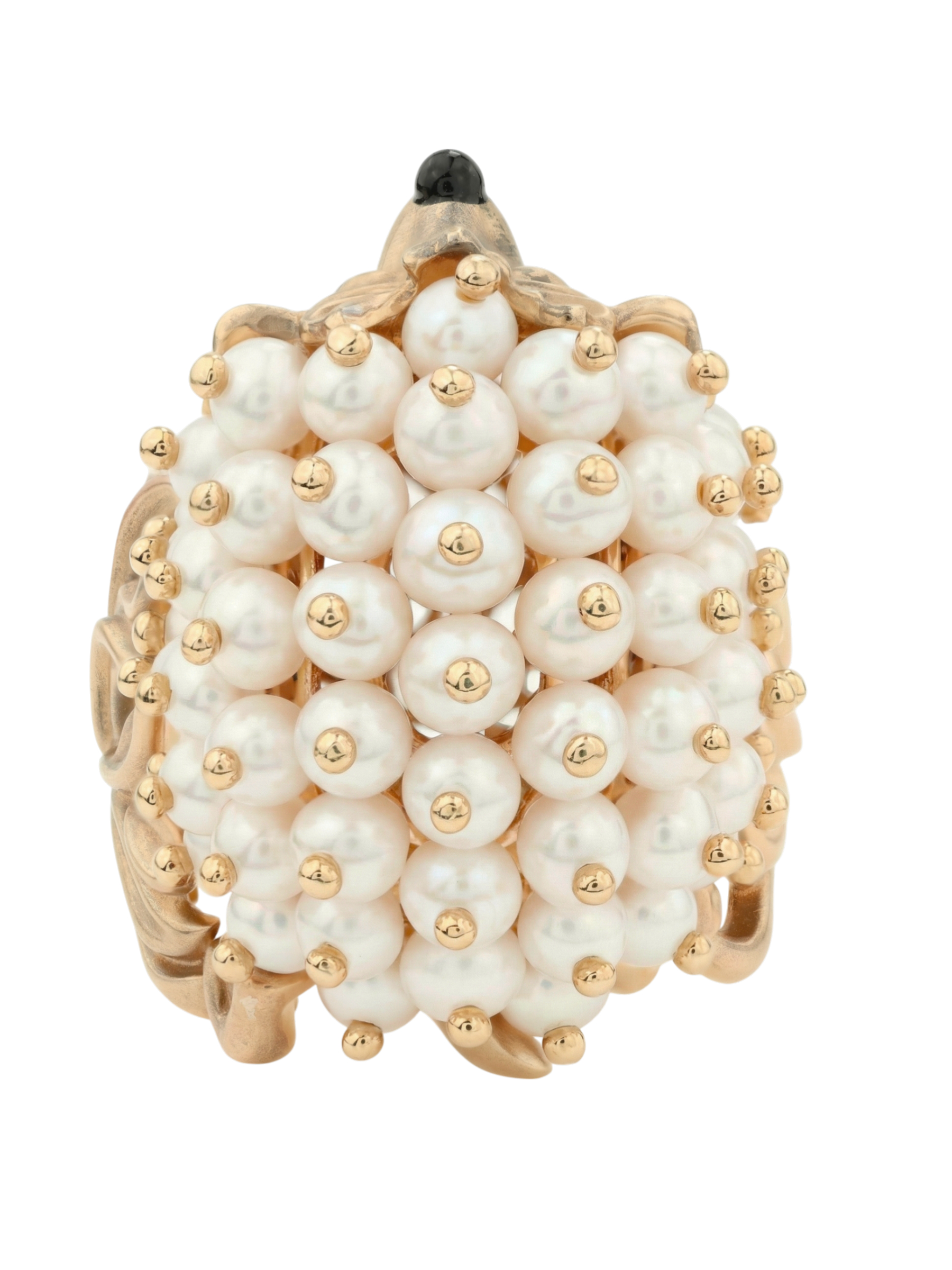 Роскошь и нежность в данном изделии подчеркивает инкрустация: спинка ежа украшена россыпью из 55 вставок жемчуга круглой формы. Белый жемчуг в сочетании с теплым оттенком красного золота создает элегантный контраст, который привлекает внимание и восхищает своей детальной проработкой. Каждая жемчужина надежно закреплена, формируя объемный и эффектный силуэт.