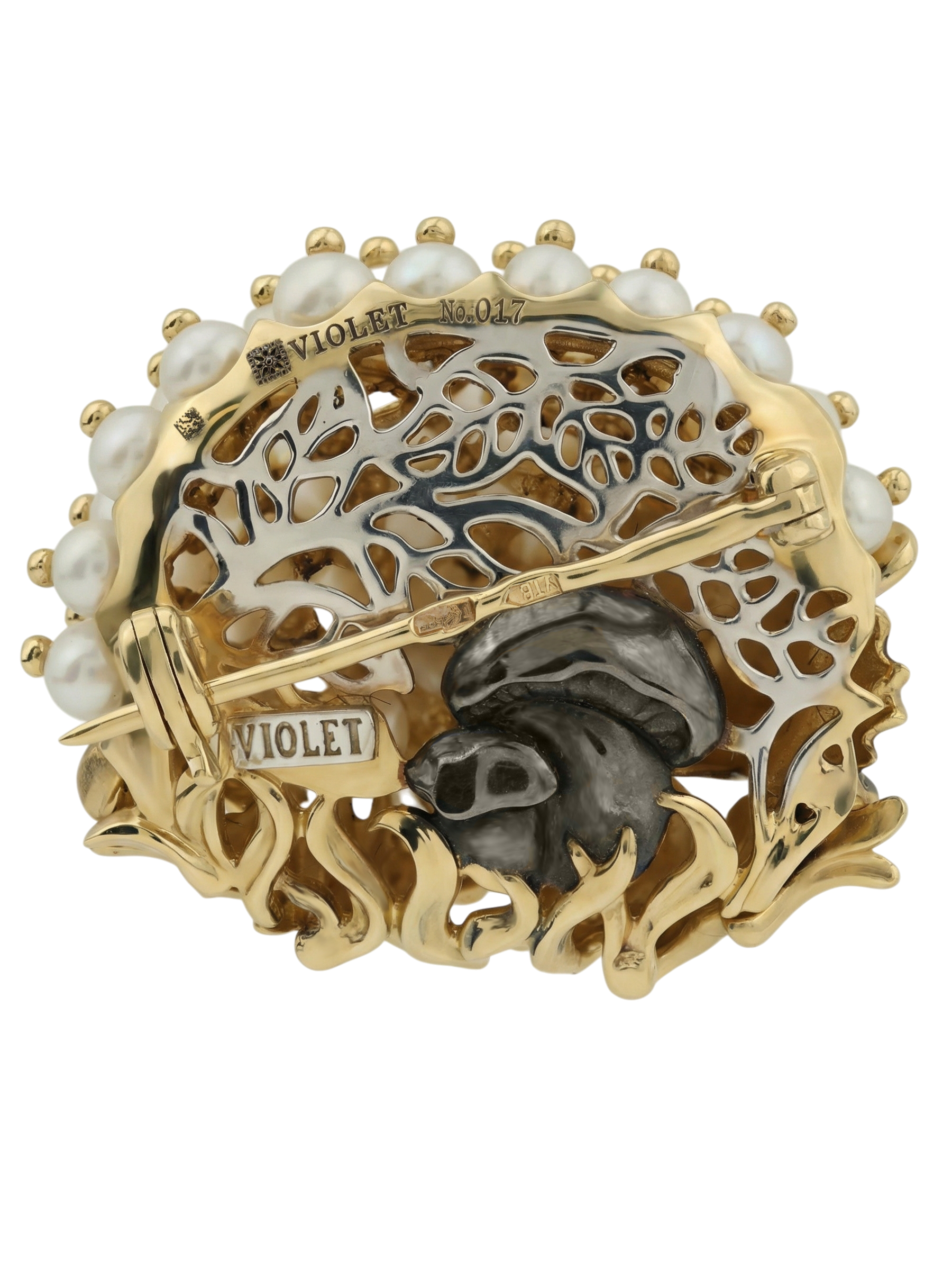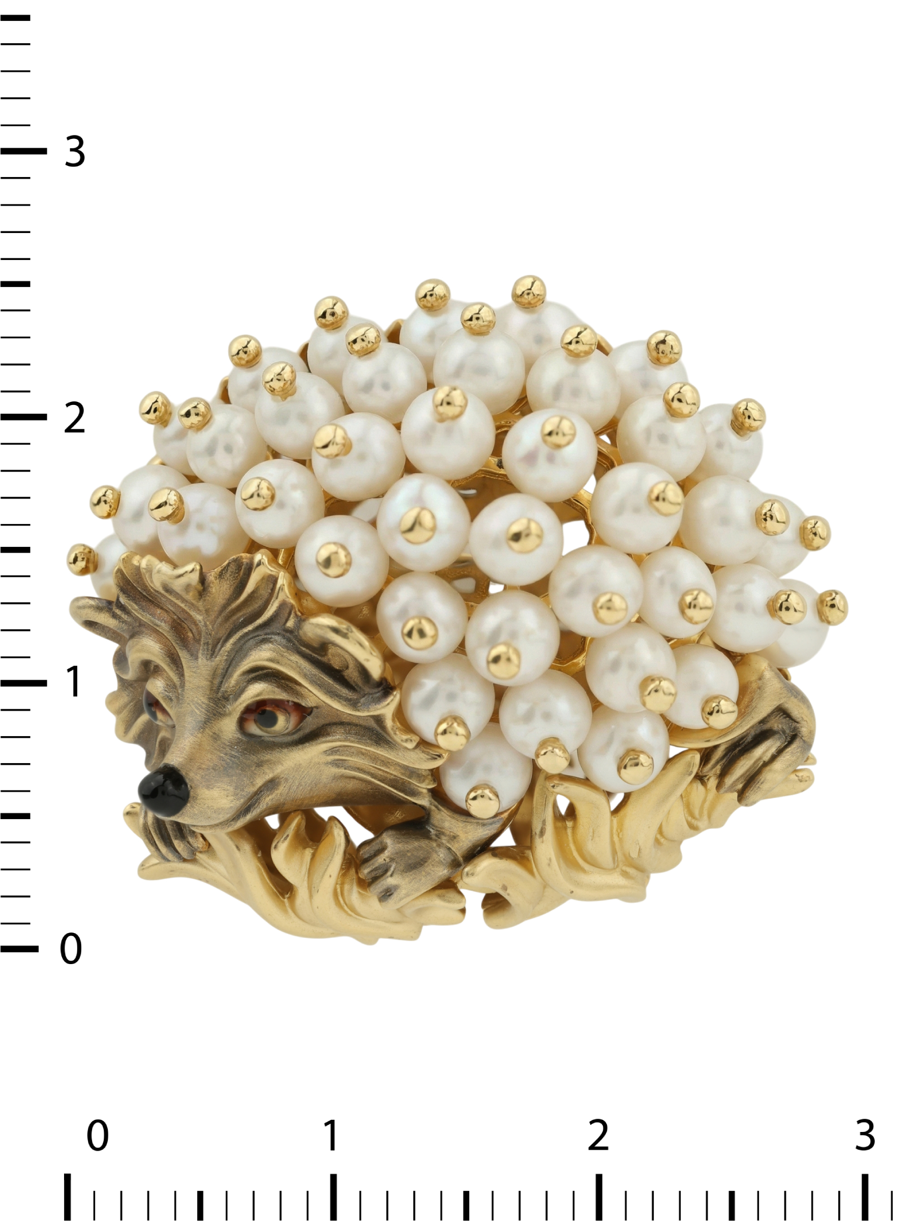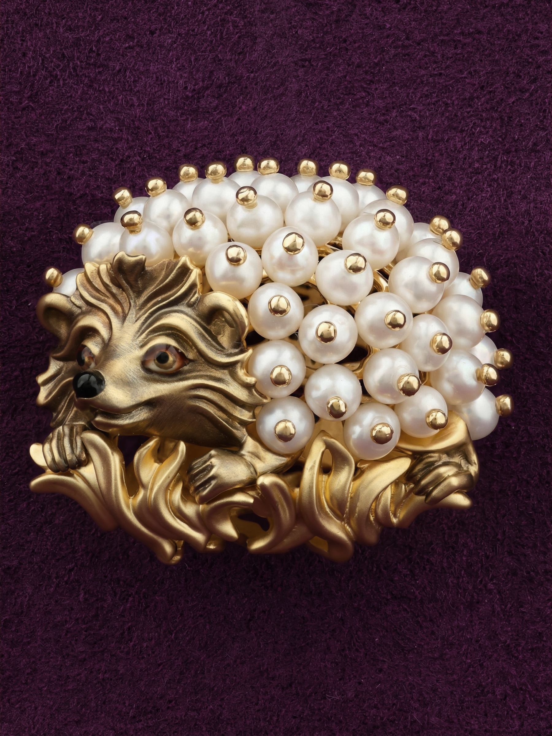Роскошную фактуру спинки украшают 38 вставок натурального жемчуга круглой формы. Белоснежный жемчуг эффектно контрастирует с металлом, создавая динамичную игру света и объема. Такая брошь — универсальное украшение, которое подходит как для женщин, так и для мужчин, предпочитающих добавлять ноту иронии и статусности в свой стиль. Изделие органично вписывается в концепцию комплектов, позволяя создавать продуманные и гармоничные ювелирные ансамбли. Украшение впечатляет своей проработкой деталей и качеством исполнения, превращаясь из простого аксессуара в значимую часть вашего стиля.