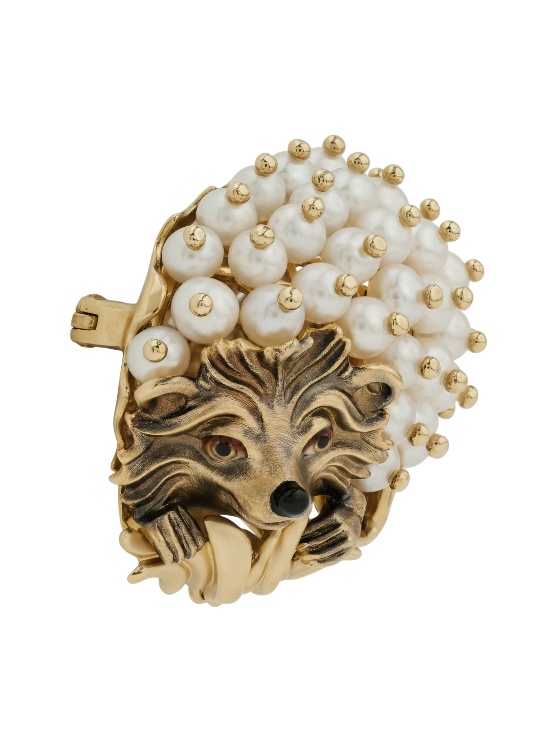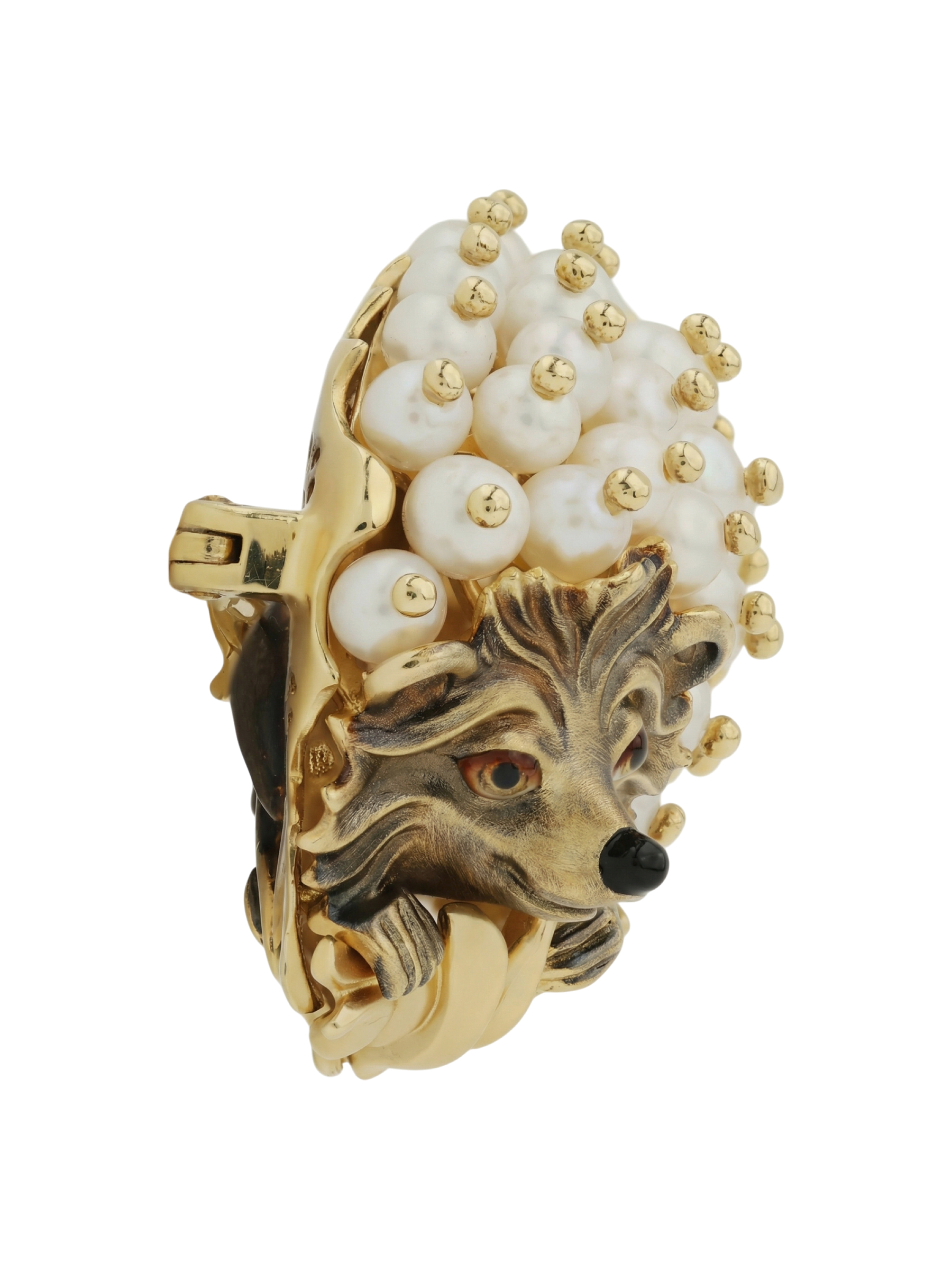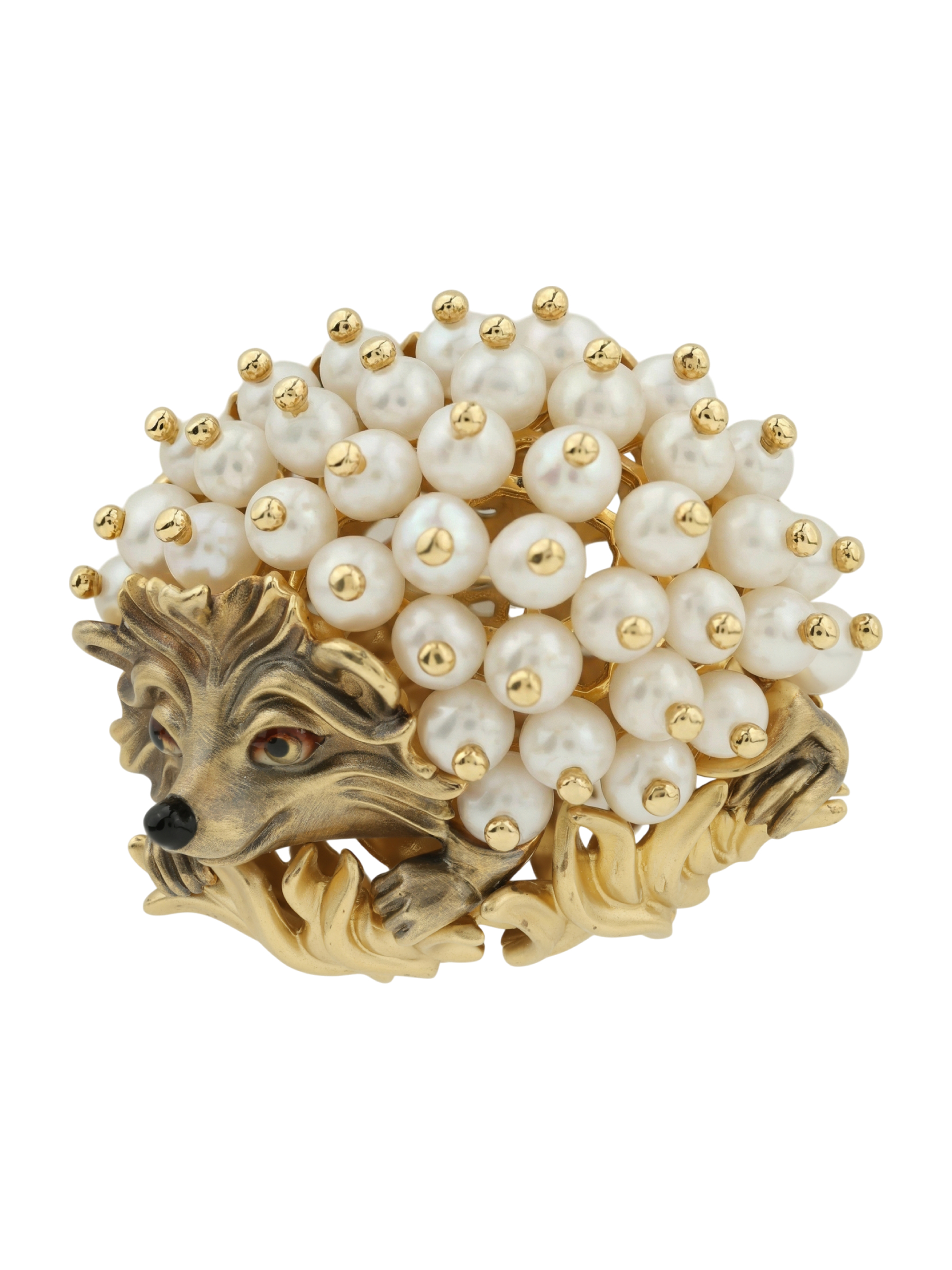 Роскошную фактуру спинки украшают 38 вставок натурального жемчуга круглой формы. Белоснежный жемчуг эффектно контрастирует с металлом, создавая динамичную игру света и объема. Такая брошь — универсальное украшение, которое подходит как для женщин, так и для мужчин, предпочитающих добавлять ноту иронии и статусности в свой стиль. Изделие органично вписывается в концепцию комплектов, позволяя создавать продуманные и гармоничные ювелирные ансамбли. Украшение впечатляет своей проработкой деталей и качеством исполнения, превращаясь из простого аксессуара в значимую часть вашего стиля.