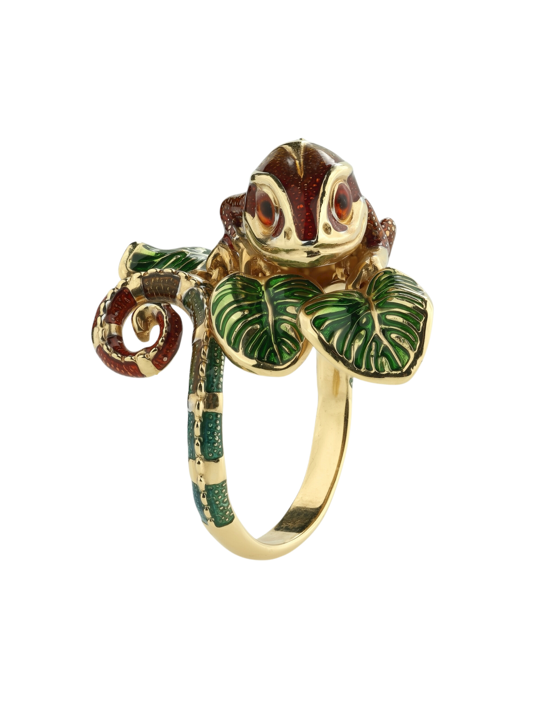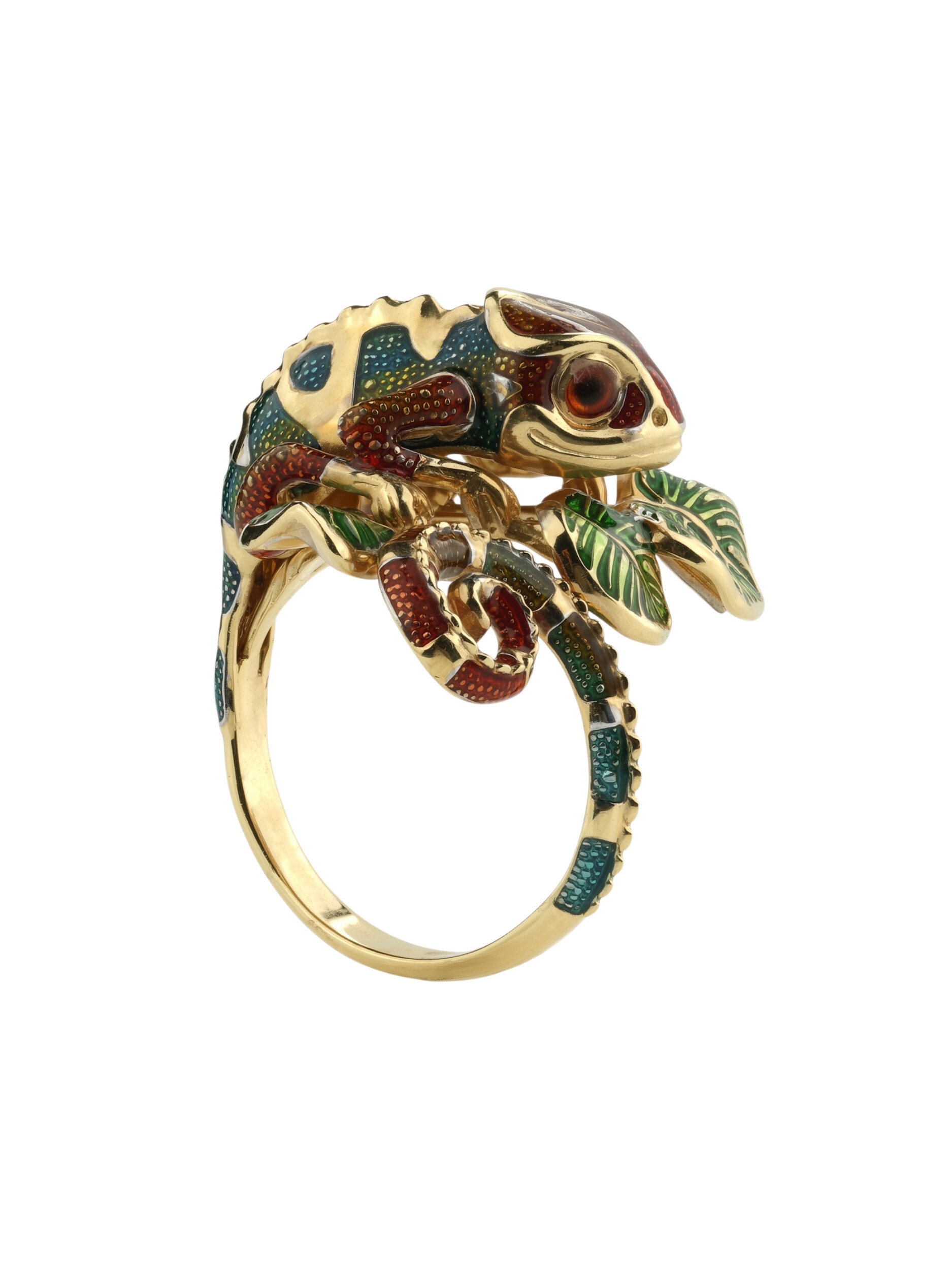 Особую выразительность аксессуару придает разноцветная эмаль, покрывающая тело хамелеона. Яркие переходы цвета создают эффект игры света и тени, привлекая внимание к каждому изгибу изделия. Лимонное золото великолепно сочетается с эмалевой вставкой, формируя гармоничную и эстетичную композицию. Данная модель универсальна: кольцо подходит как для женщин, так и для мужчин, желающих дополнить свой стиль нетривиальным украшением.