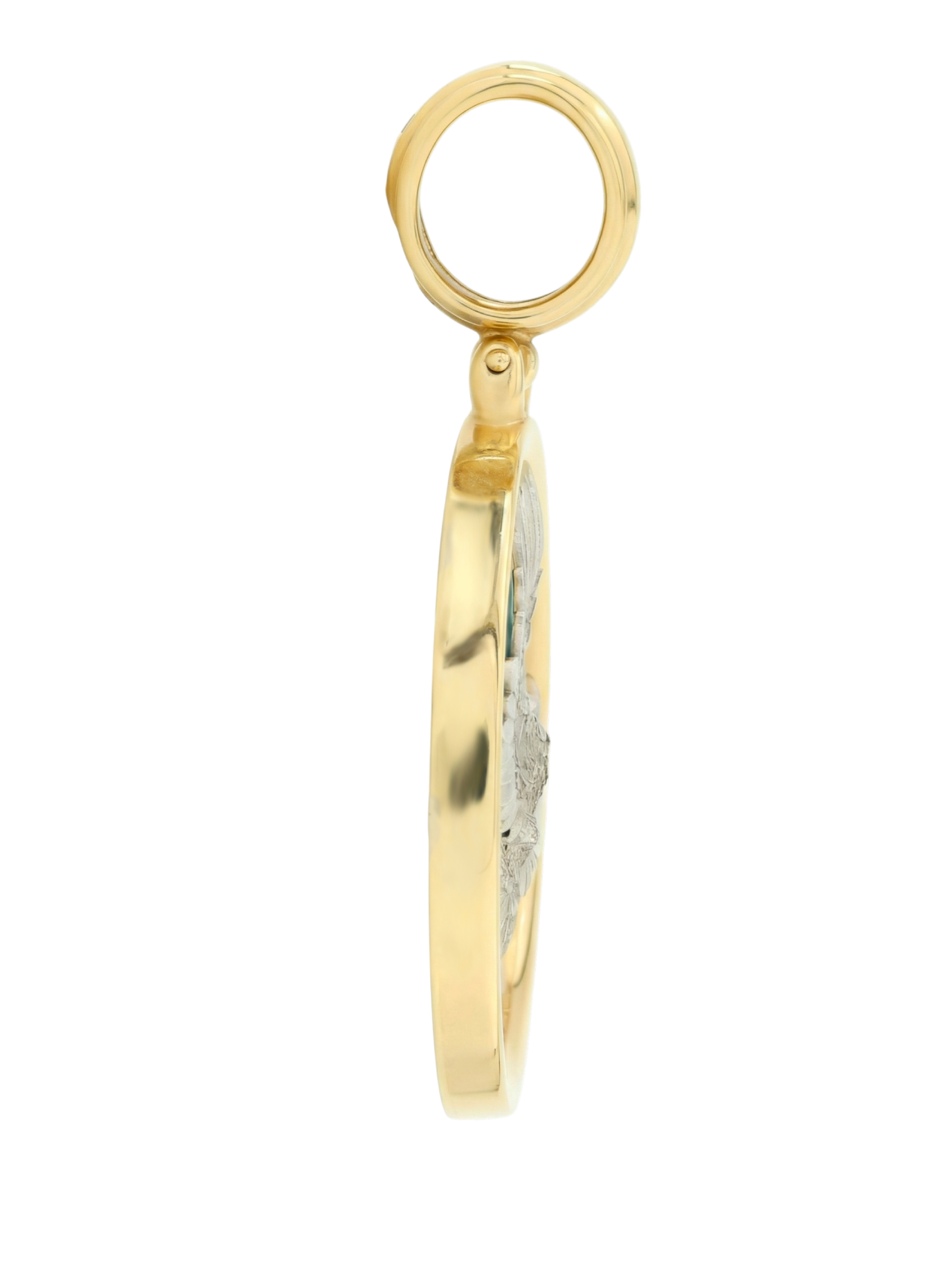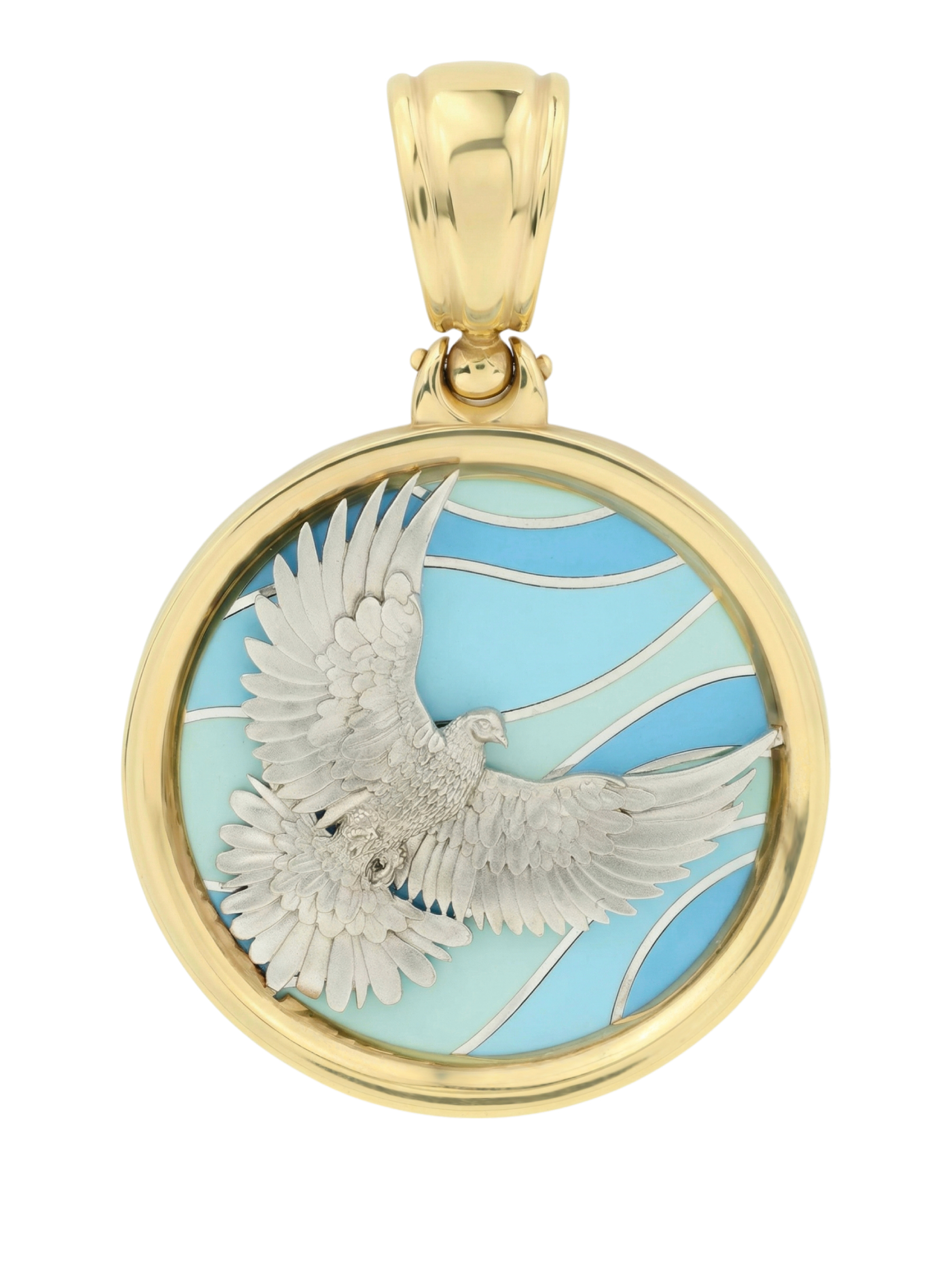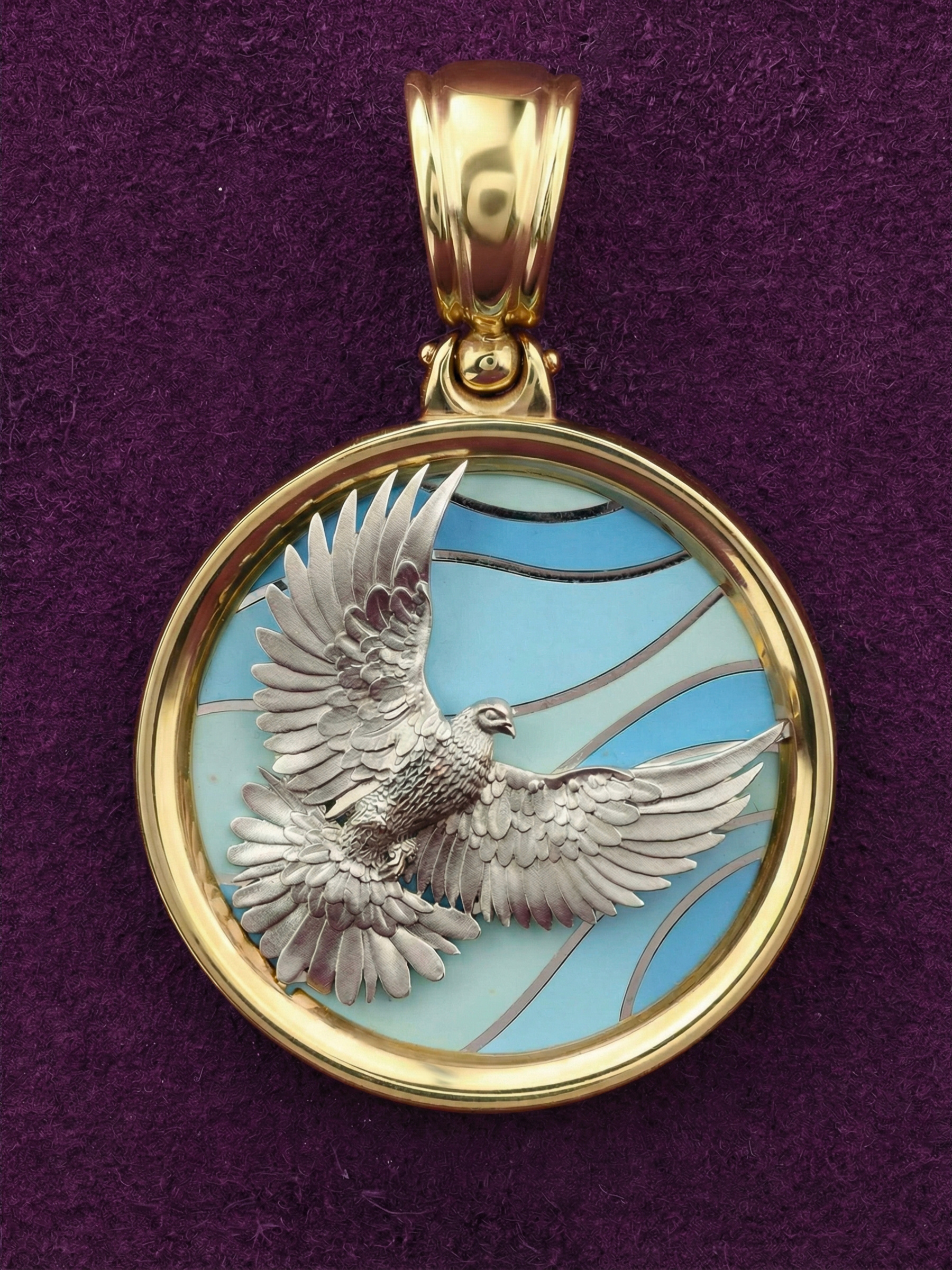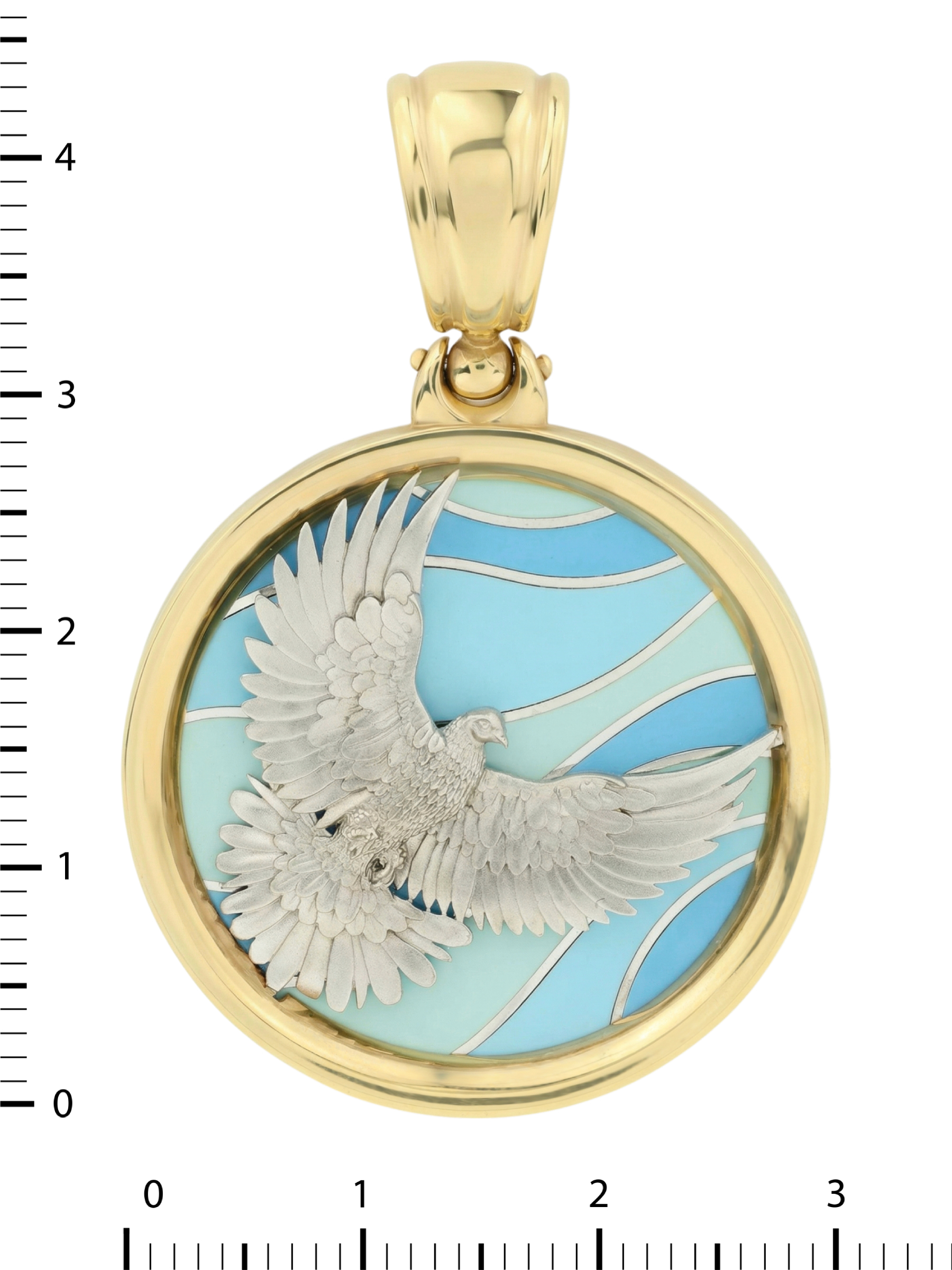 Подвеска из лимонного золота 585 пробы — это изысканное ювелирное украшение, воплощающее в себе глубокий символизм и безупречное мастерство исполнения. Изделие входит в коллекцию De luxe Premium — Голубь мира, центральным образом которой является голубь мира. Фигура птицы выполнена с поразительной детализацией, передающей легкость и динамику полета на фоне искусной художественной эмали. Разноцветный оттенок эмалевого покрытия создает эффект бесконечного неба, подчеркивая благородный блеск лимонного золота.