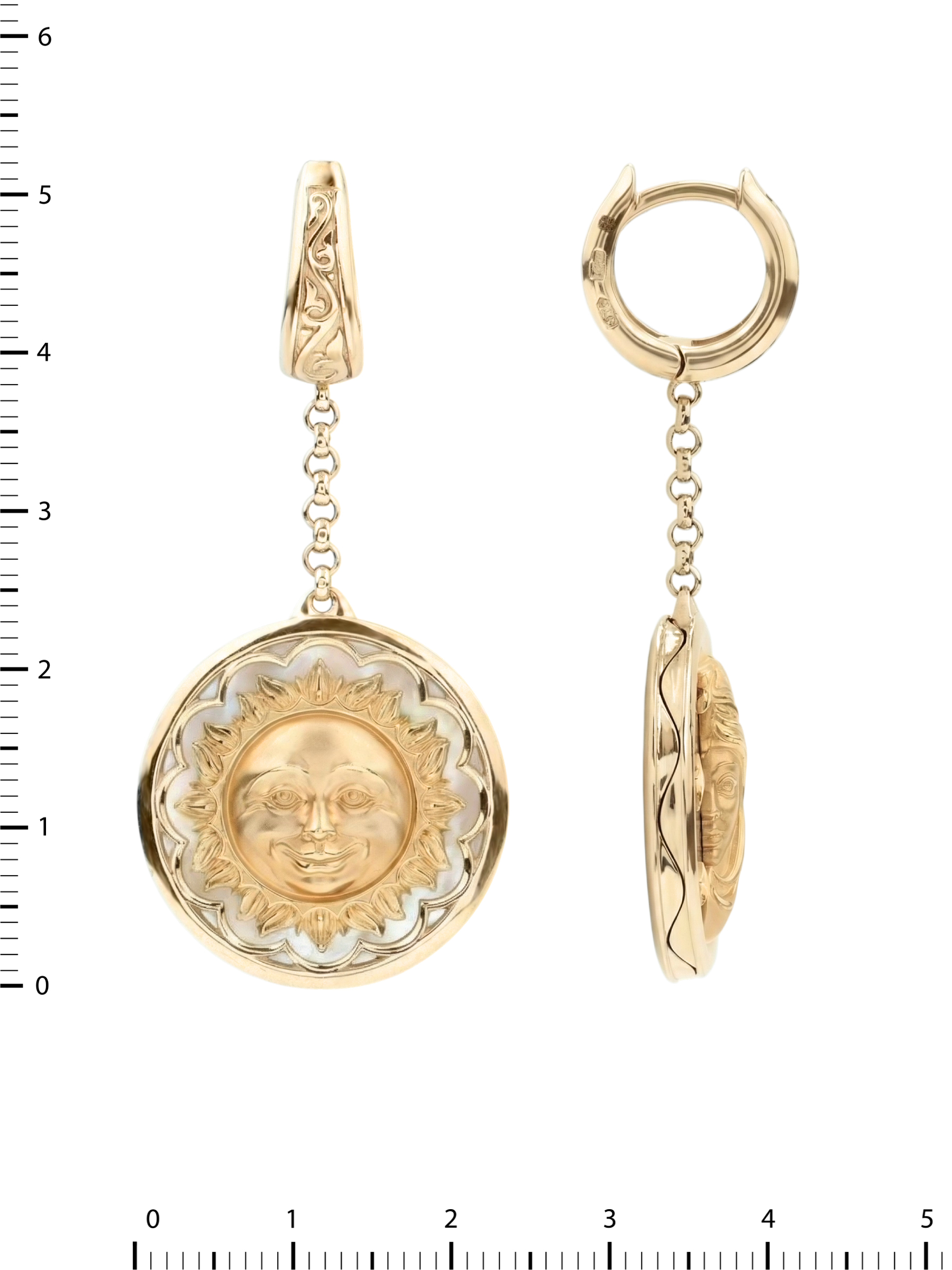 Серьги выполнены из благородного красного золота 585 пробы. Контрастное сочетание вставок делает их по-настоящему уникальными: одна серьга декорирована перламутром светлого оттенка, подчеркивающим сияние дневного светила, а другая — глубоким черным ониксом, на фоне которого особенно эффектно смотрятся контуры луны и звезд. Использование круглых вставок гармонично завершает композицию, придавая украшению завершенность и эстетическую стройность.