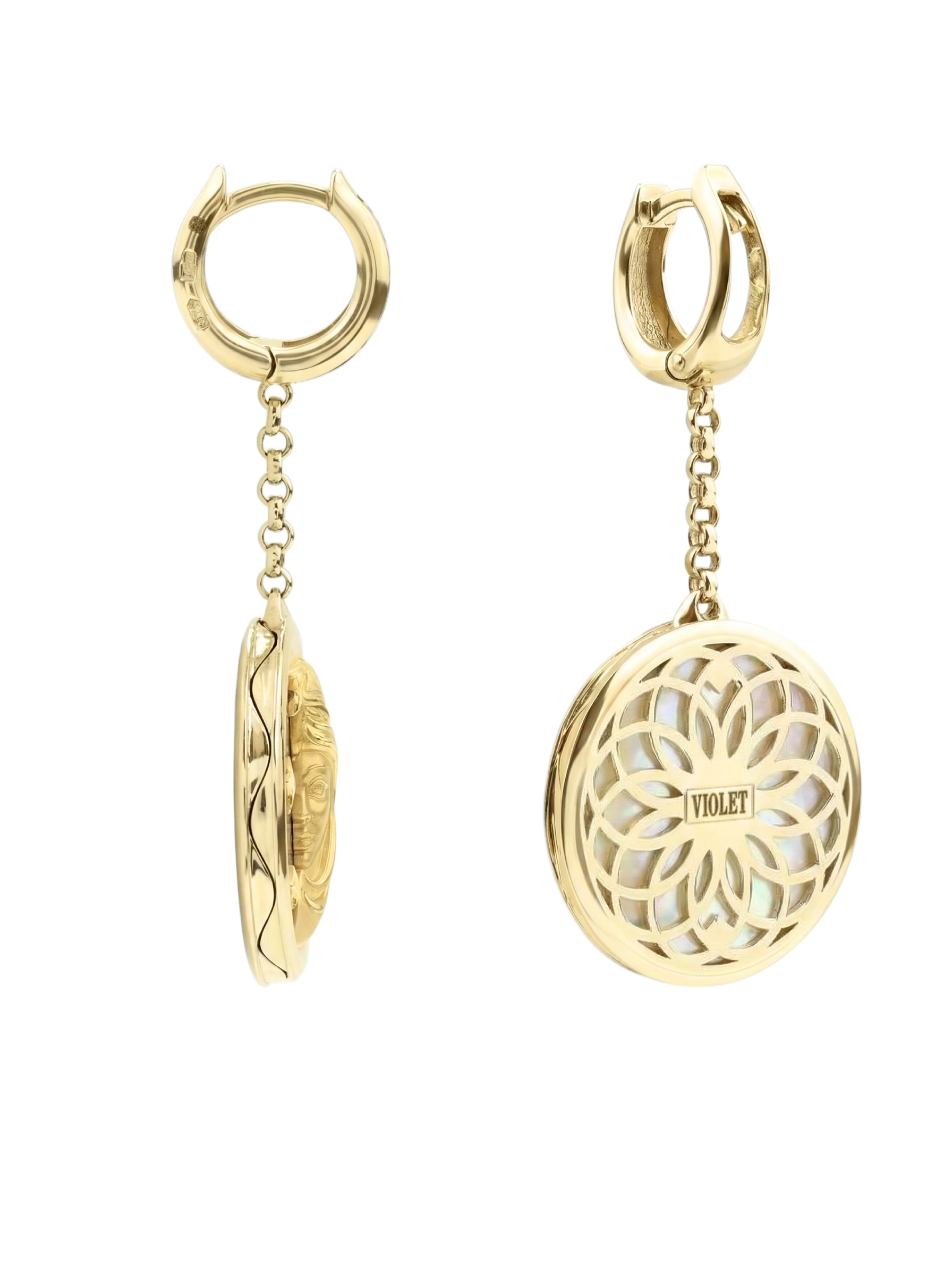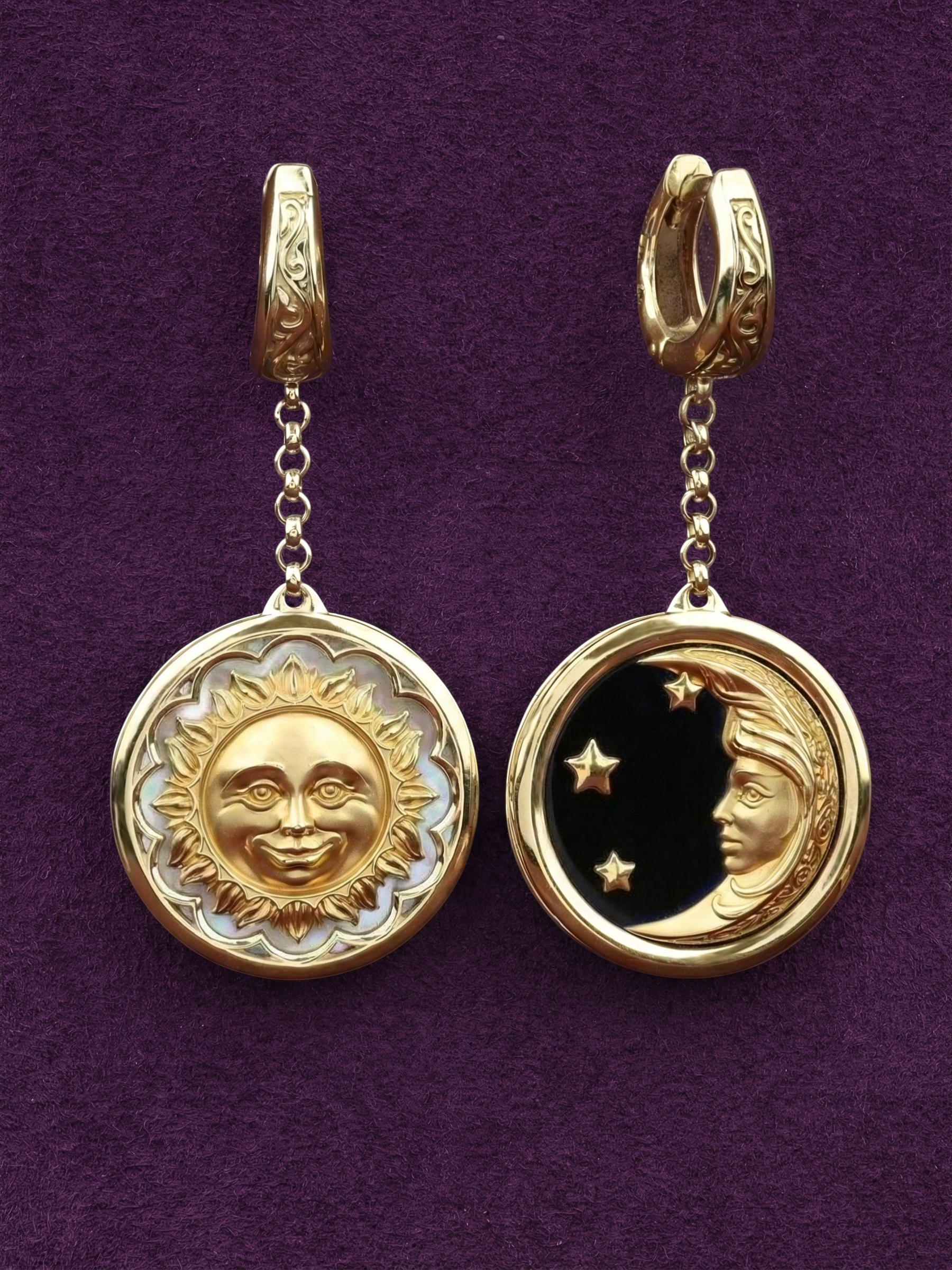 Серьги отличаются искусным контрастом: одна часть композиции дополнена нежным перламутром, создающим мягкое сияние вокруг образа солнца, в то время как вторая инкрустирована насыщенным черным ониксом, на фоне которого ярко выделяется лунный серп со звездами. Круглая форма вставок гармонично завершает композицию, придавая украшению завершенный и лаконичный вид. В каждой серьге использована одна крупная вставка, подчеркивающая мастерство исполнения.